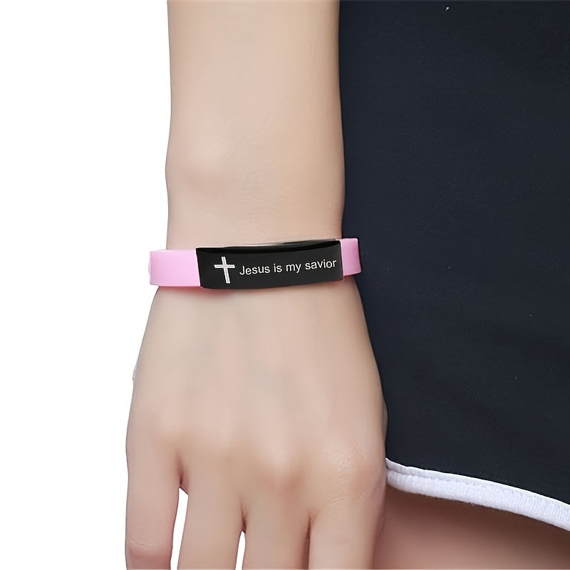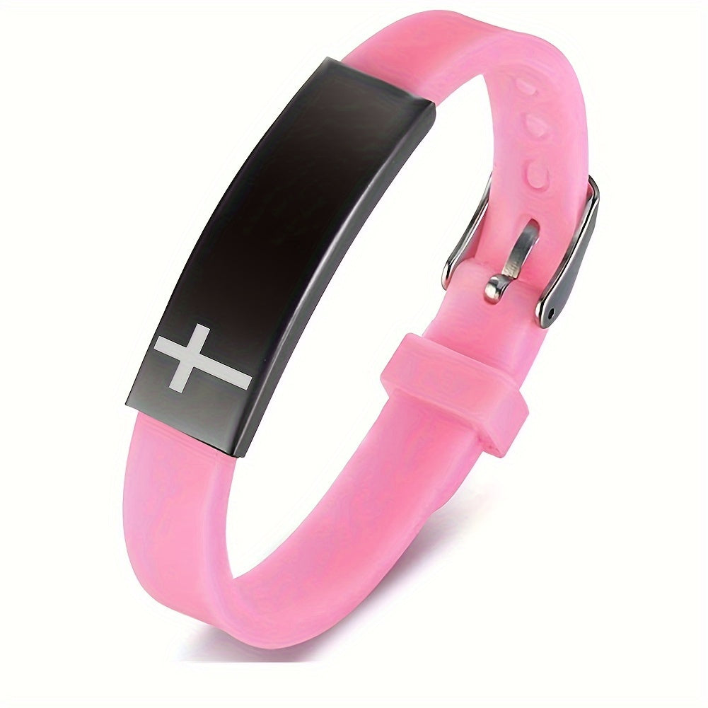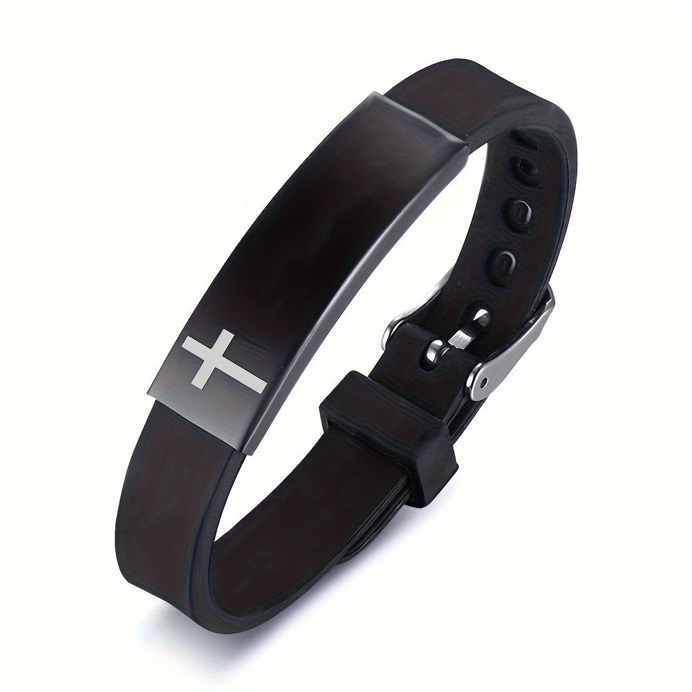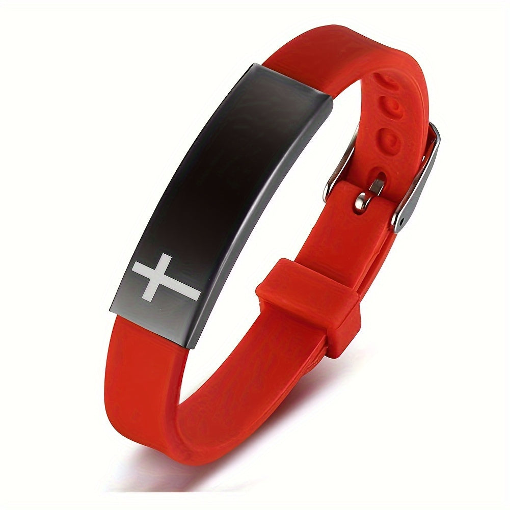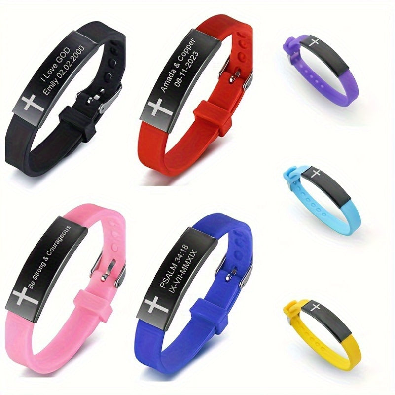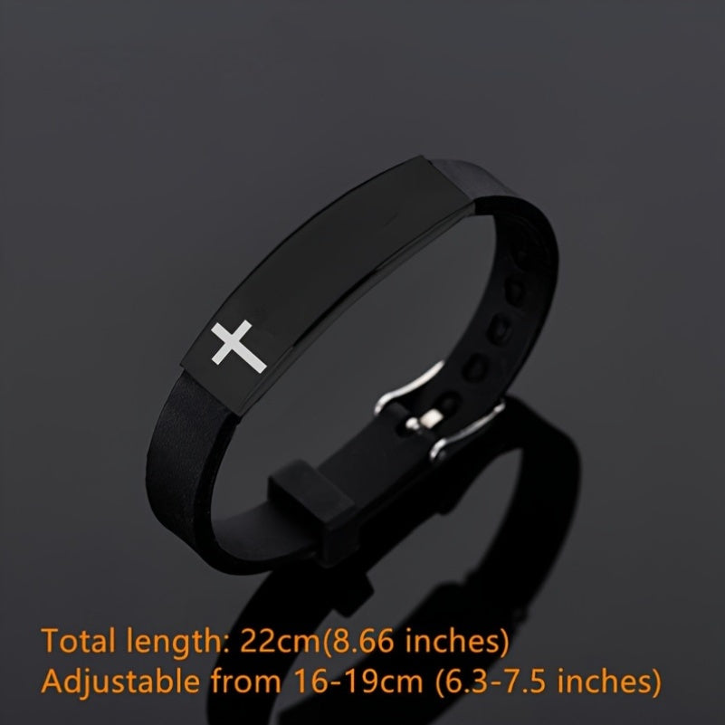This casual style bracelet is made of high-quality silica gel and features a cross pendant. Customize it with your own names, dates, or a special Bible verse for a unique and meaningful accessory.