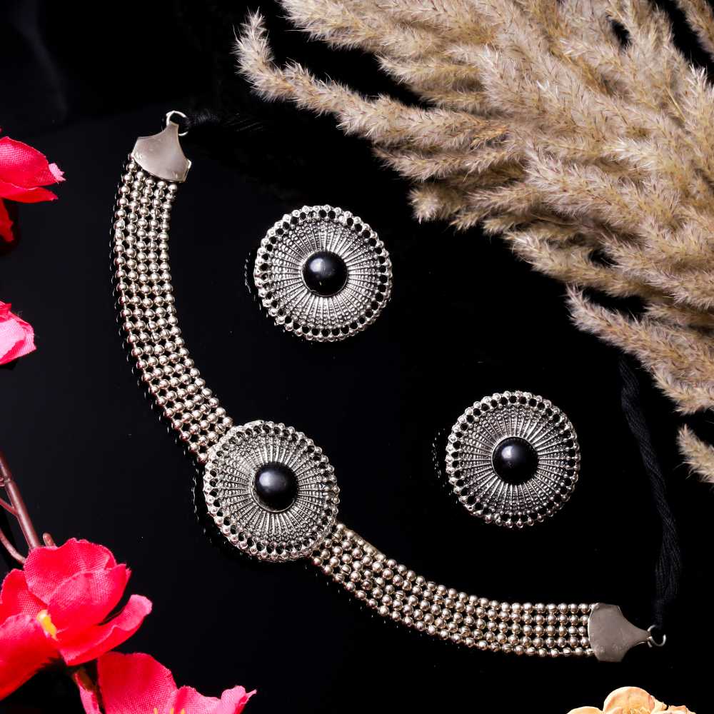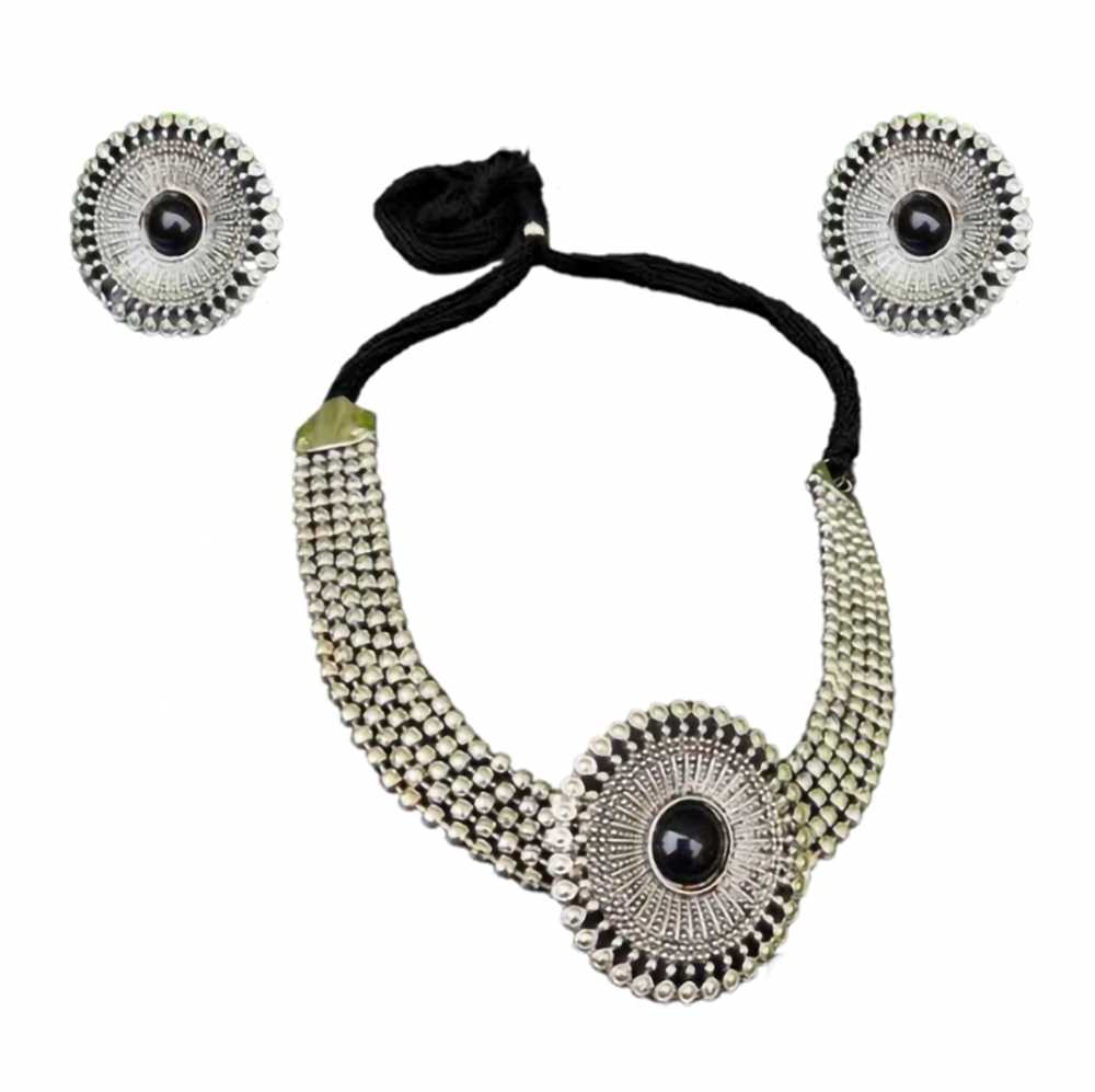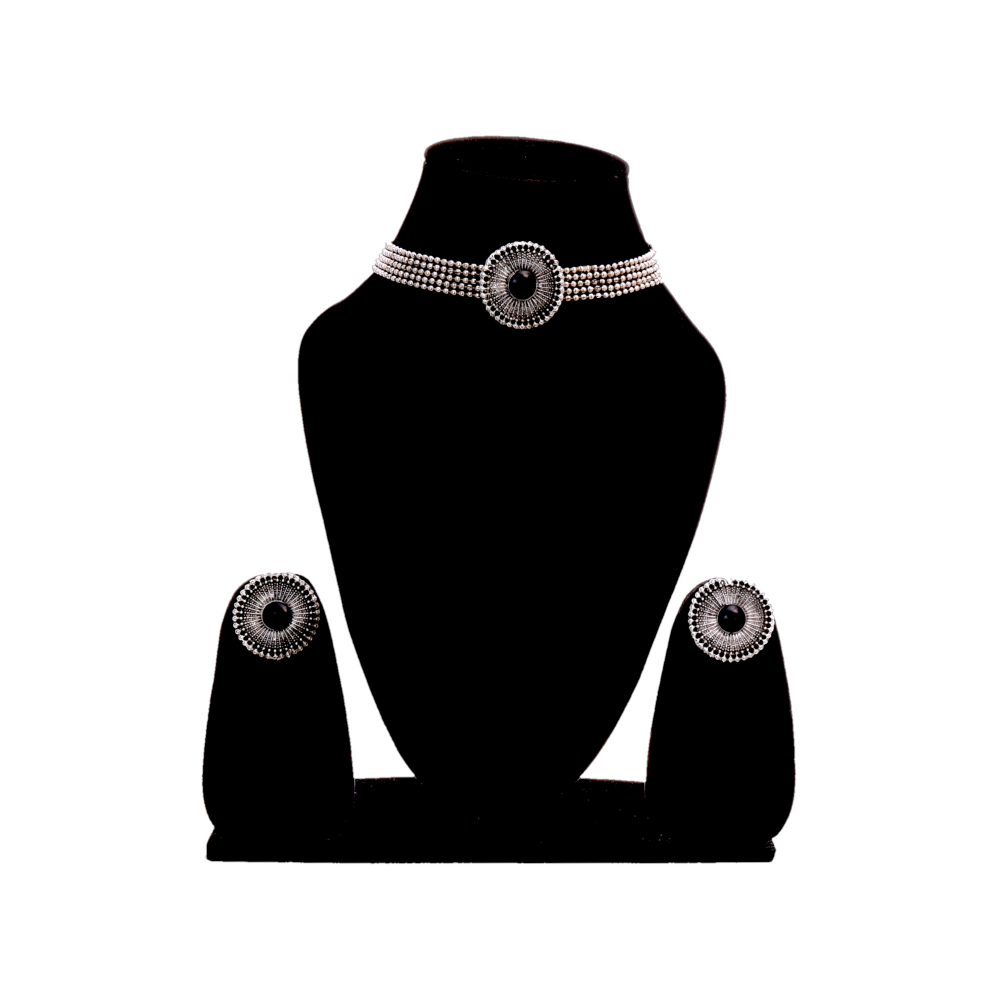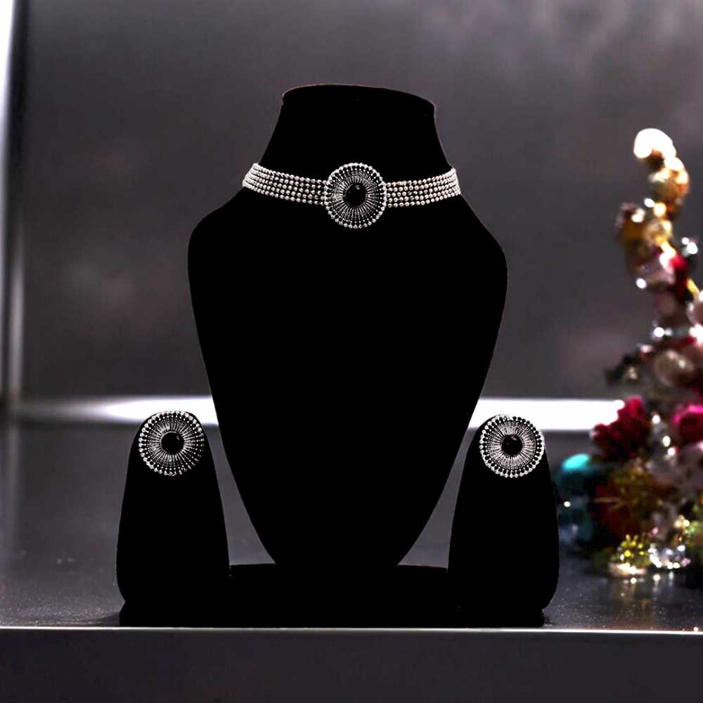 - Product Particulars: Crafted from high quality Brass metal plated with silver, necklace is of choker type which comes with adorable dangling earring.