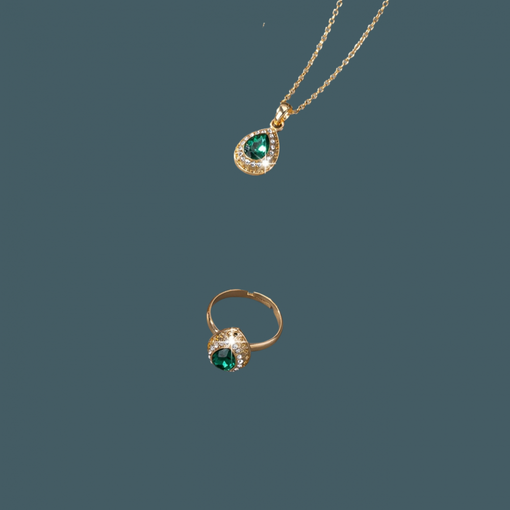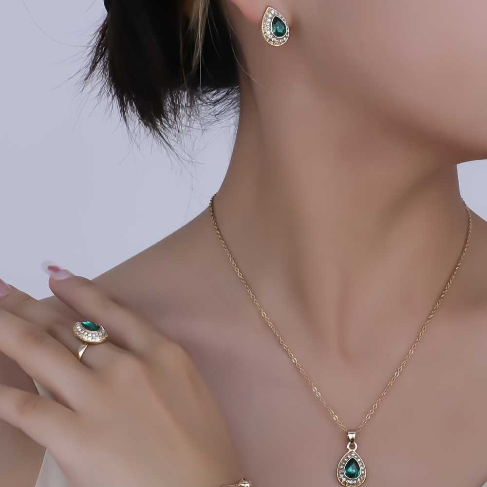 Bling Queen is an affordable fashion jewellery brand with various product types like bracelets, necklaces, earrings, rings, etc. suitable for women, men and kids. This exquisite set includes a teardrop gemstone pendant necklace, earrings, and a ring, all set in a luxurious gold tone finish. Perfect for brides, bridesmaids, or anyone looking to add a touch of vintage glamour to their special occasion, this set radiates sophistication and class. The focal point of the set, the teardrop shaped pendant, is designed with a sparkling synthetic gemstone that catches the light with every movement. Suspended from a delicate gold tone chain, the pendant sits gracefully on the collarbone, making it an ideal accessory for bridal wear or evening gowns. The matching teardrop earrings echo the design of the pendant, featuring a similarly cut synthetic gemstone that dangles delicately from secure hooks. The teardrop ring completes the set with a stunning synthetic gemstone centerpiece, framed by delicate details to accentuate its brilliance.