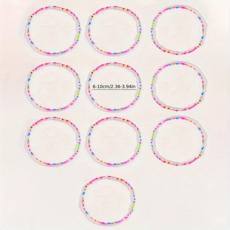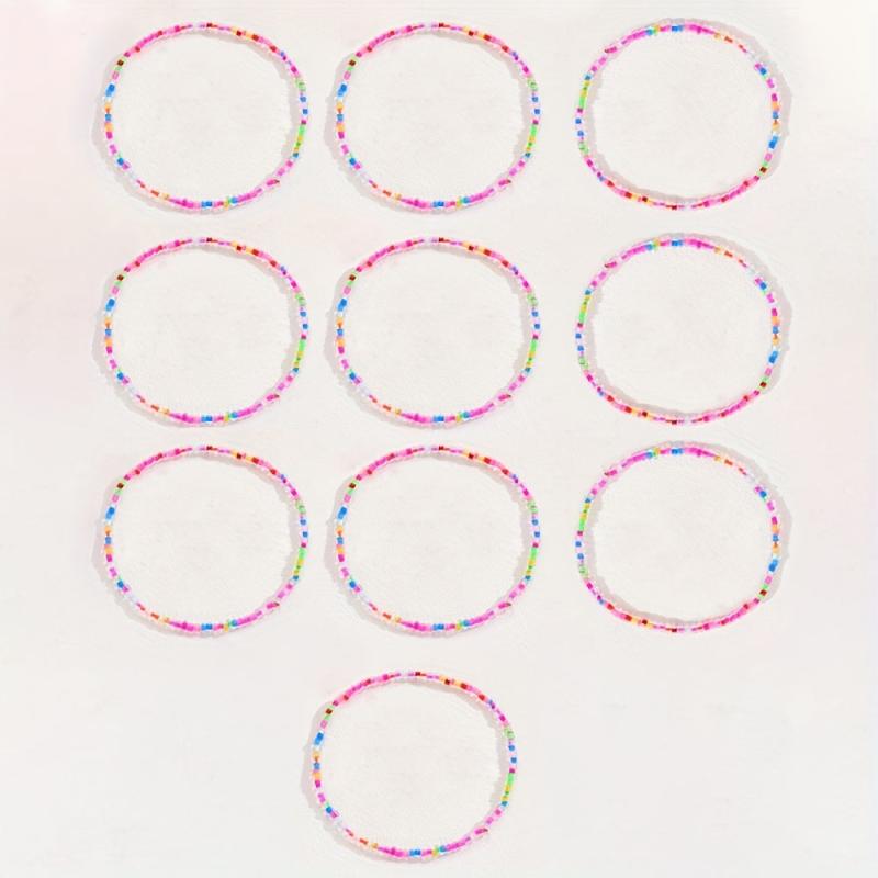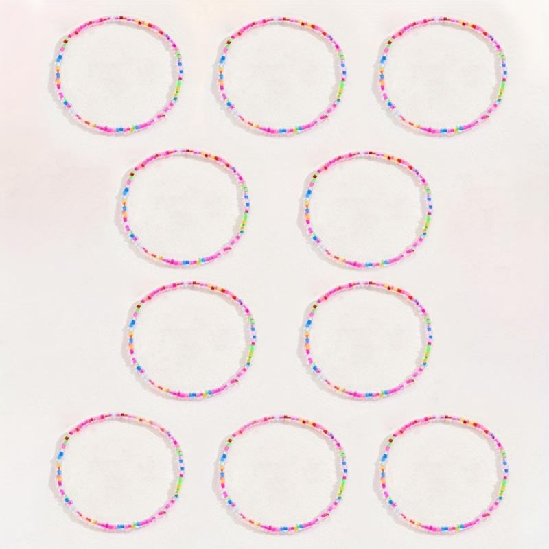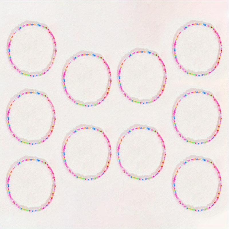 Add a pop of color to your summer look with this set of 10 colorful rice bead anklets. Made with elastic rope, these minimalist anklets are perfect for the beach or everyday wear.