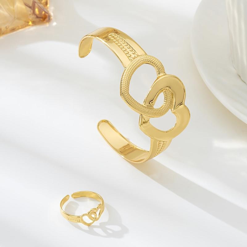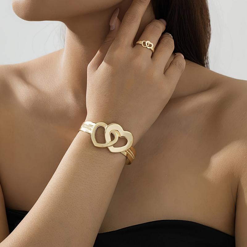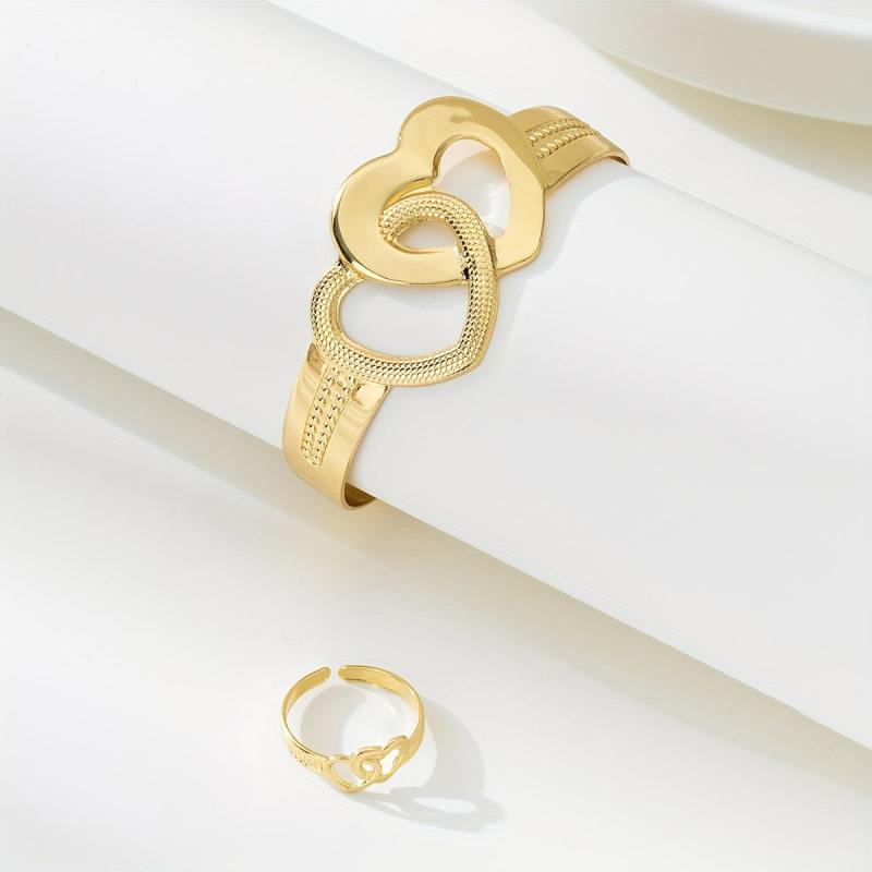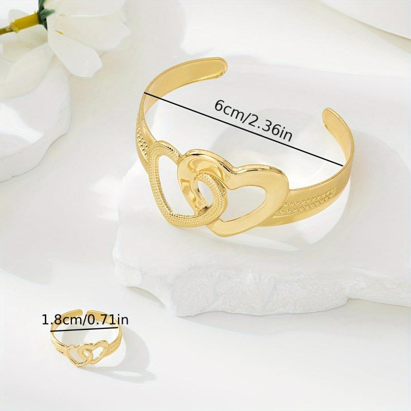 14K Double Heart Cuff Bracelet & Ring Set - Perfect for Valentine&
