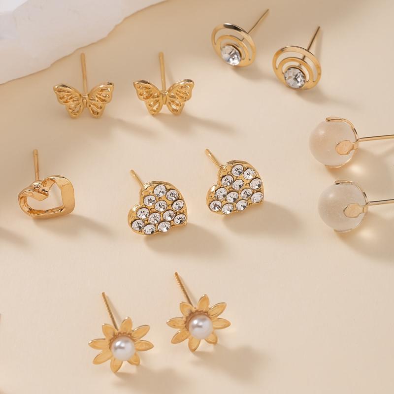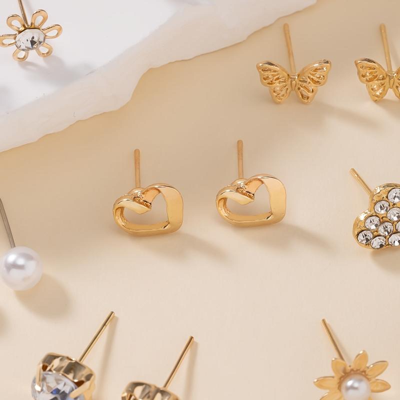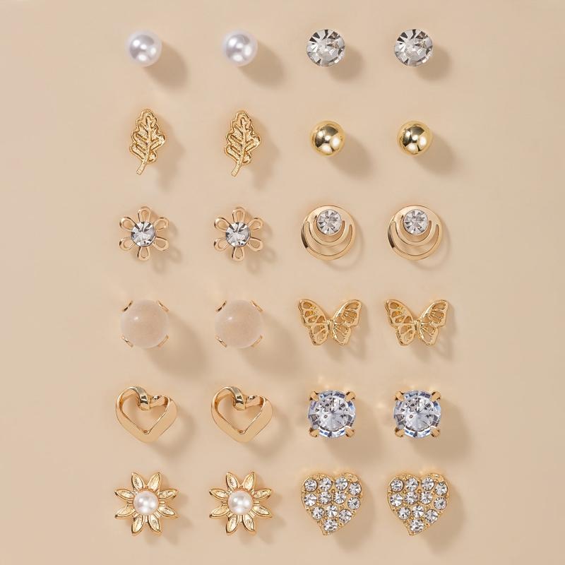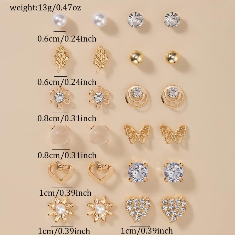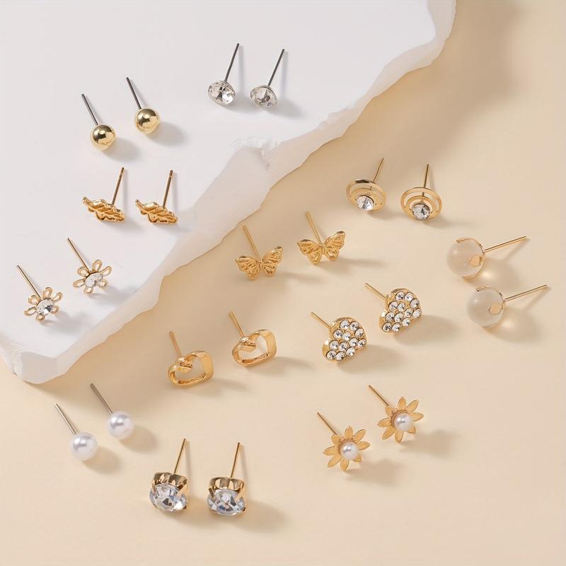 24pcs Metal Earrings Set Rhinestone Heart Leaf Flower Butterfly Studs Daily Wear