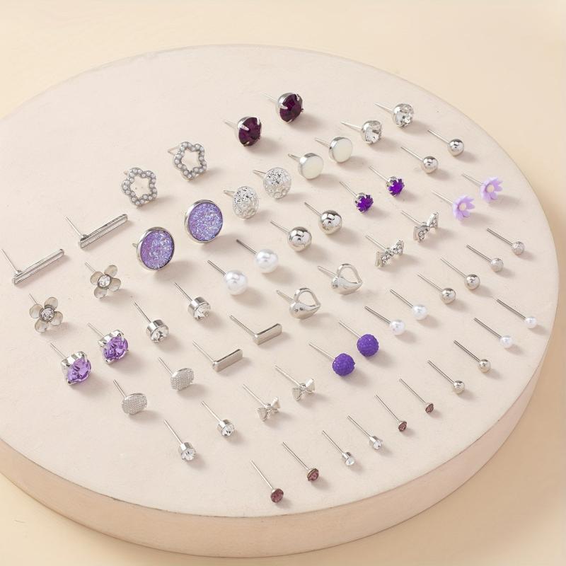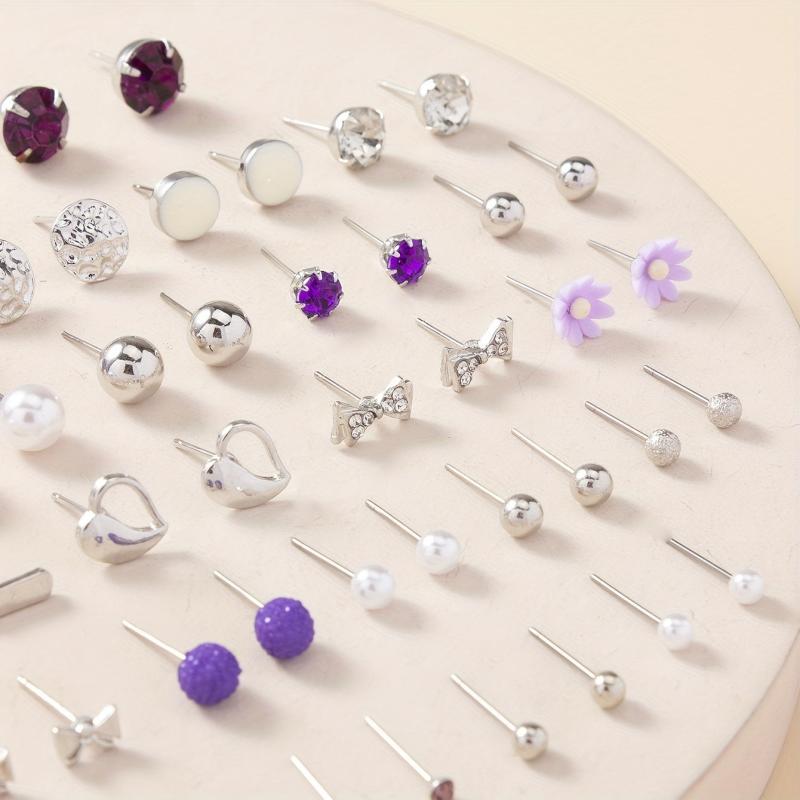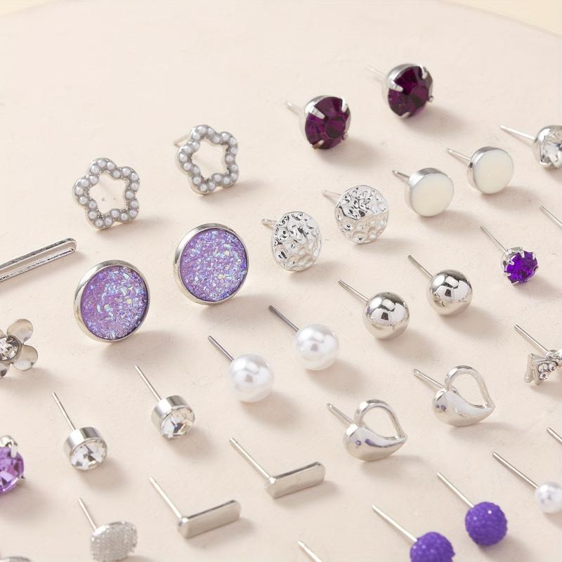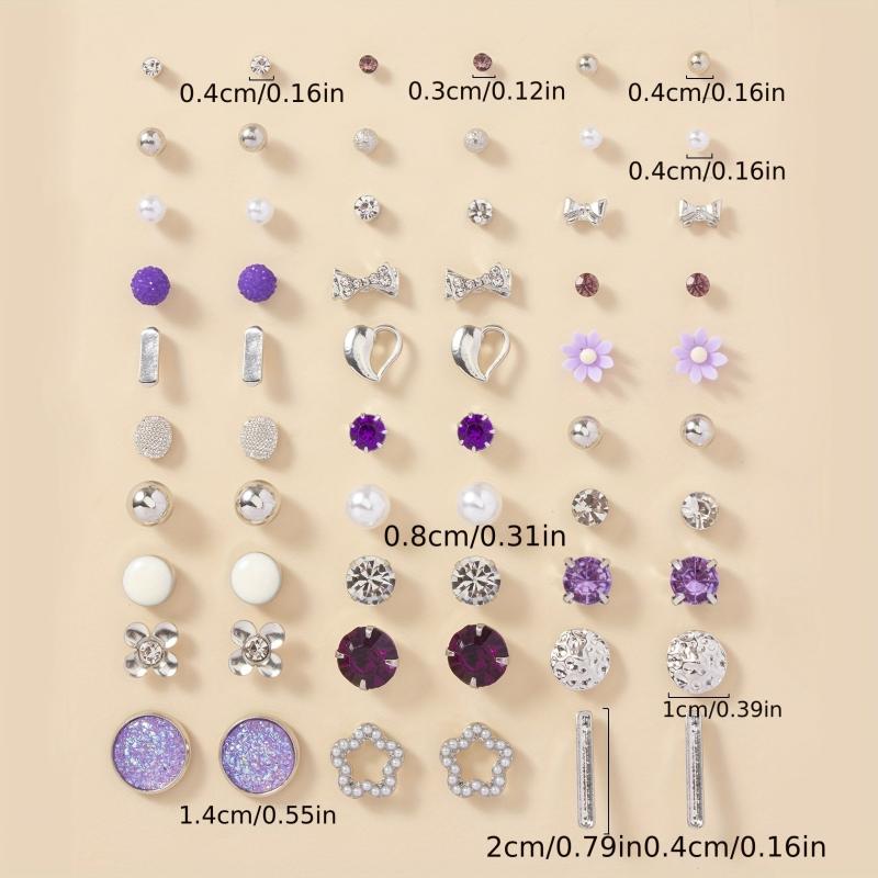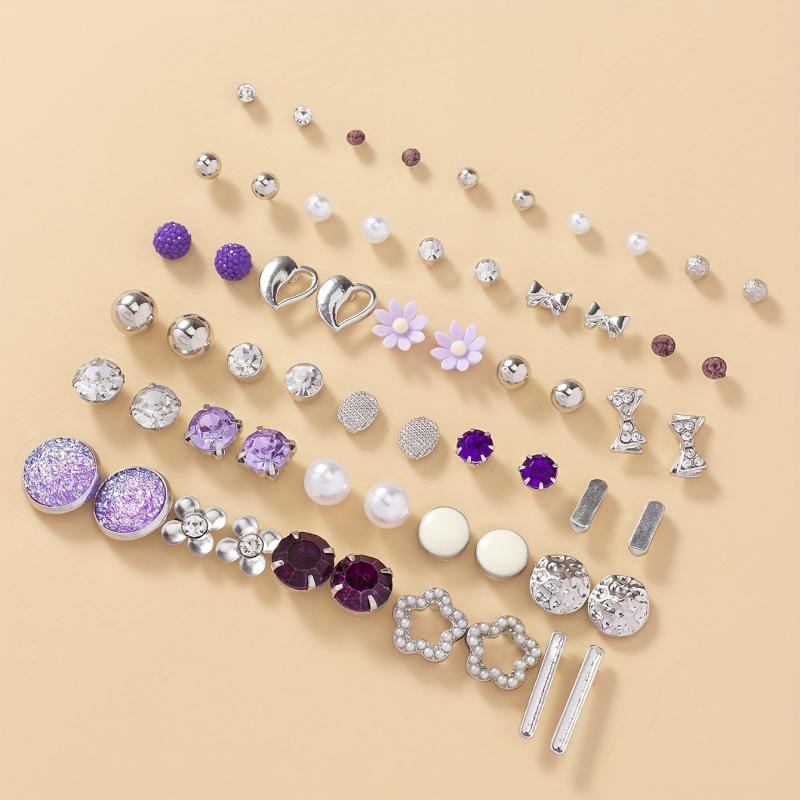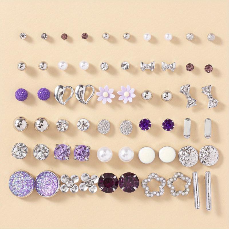 30 Pairs Heart Earrings: Purple Flower Crystal Pearl Diamond Heart Earri