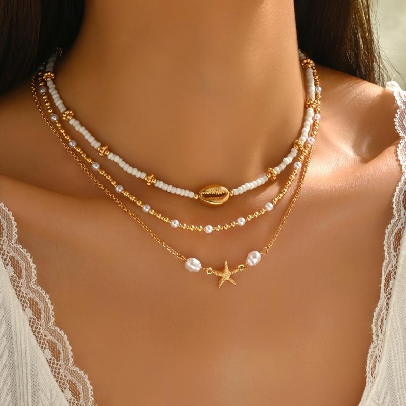 Elevate your seaside vacation look with this set of 3 bohemian choker necklaces featuring shell and starfish pendants, golden round beads, and retro style stacked beads.
