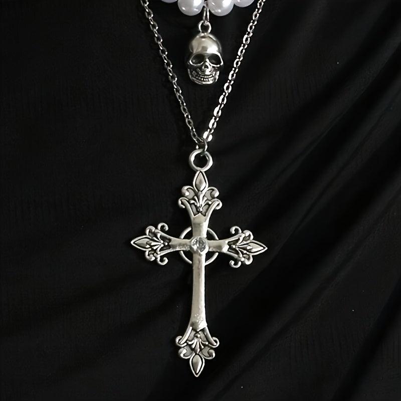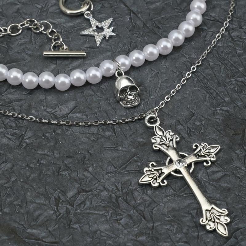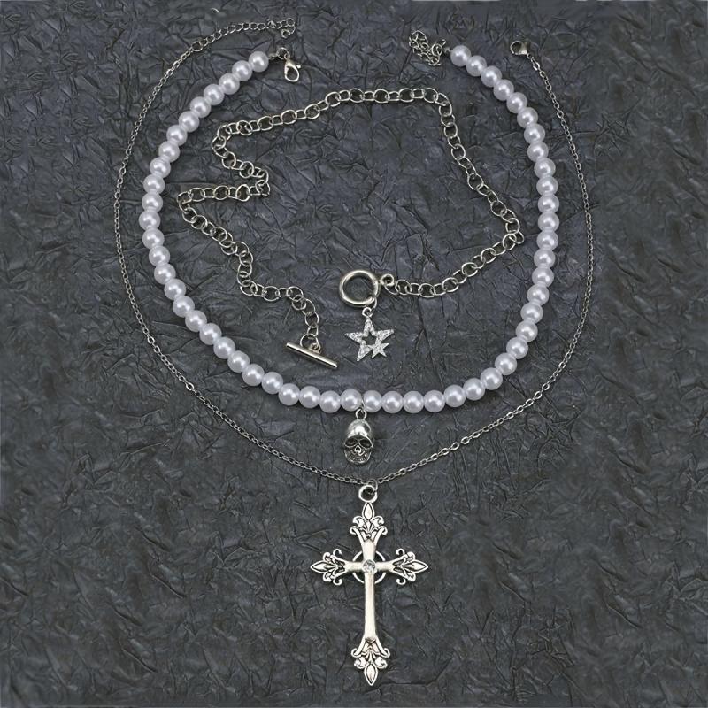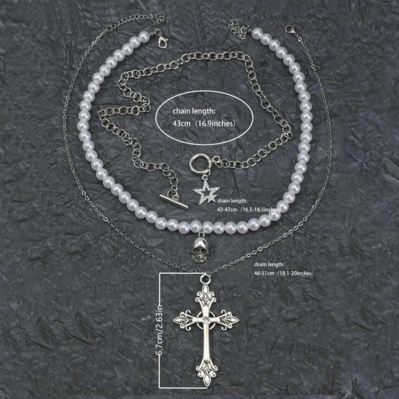 This vintage punk gothic necklace set features five pointed star and cross pendants. Perfect for adding a rebellious touch to your outfit.