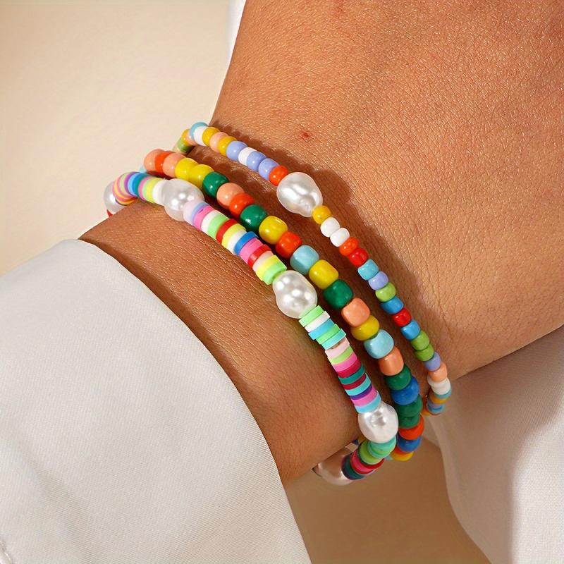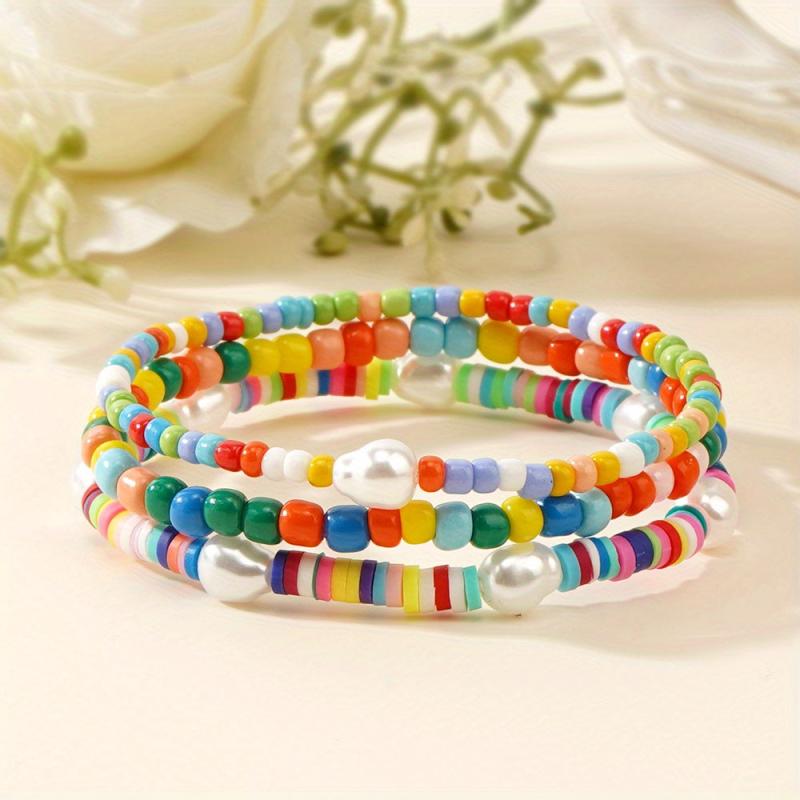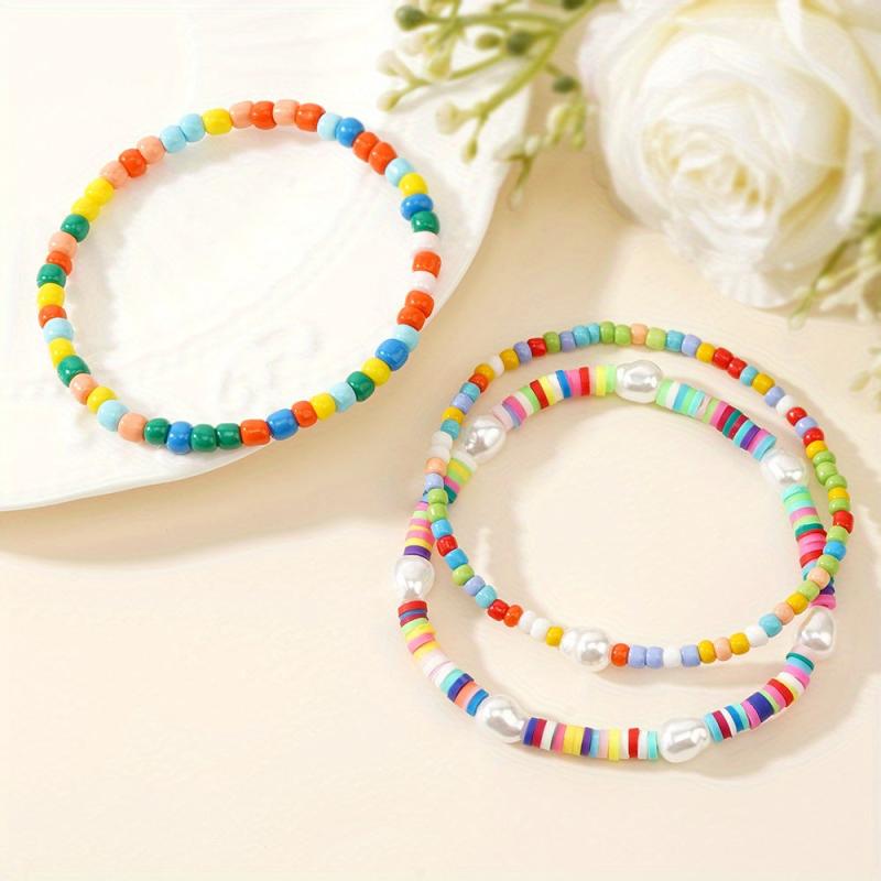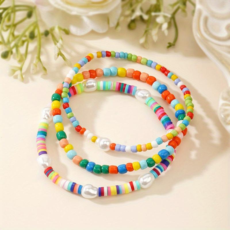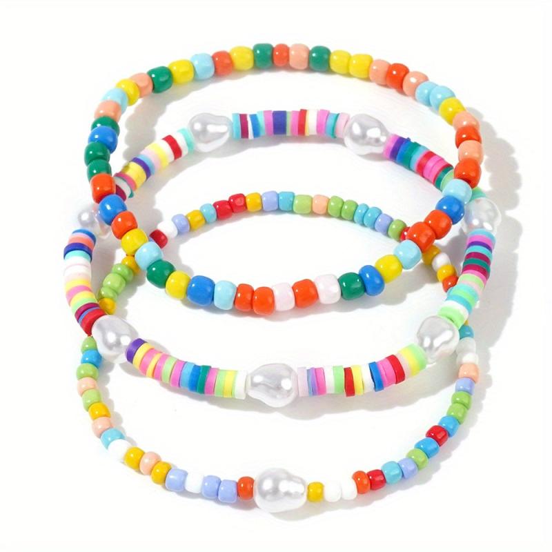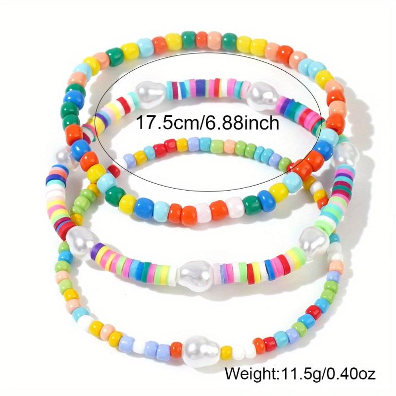 Add a touch of fun and color to your look with this 3-piece rainbow candy beaded bracelet set. Perfect for beach vacations, parties, and hanging out with friends.