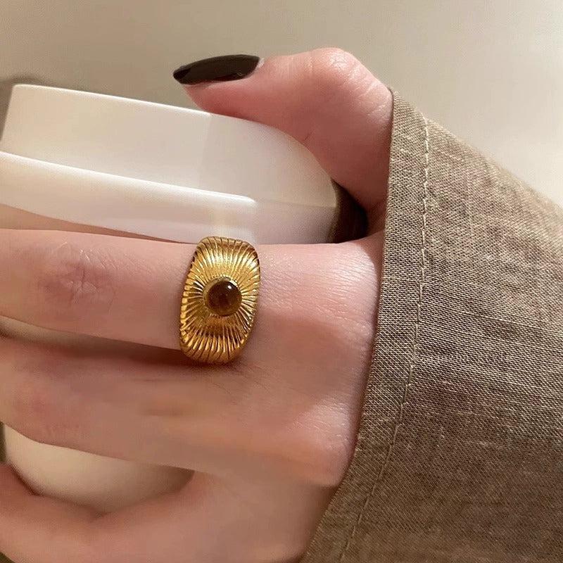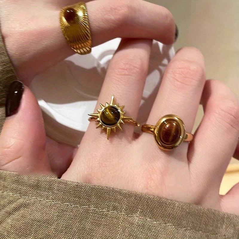 This set includes 3 vintage alloy rings featuring sunflower and tiger's eye designs. Perfect for adding a touch of retro charm.