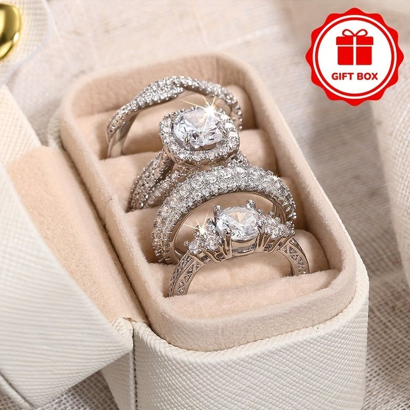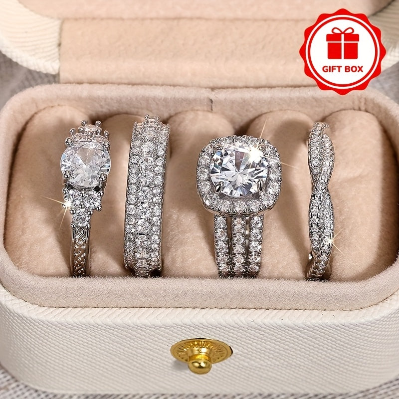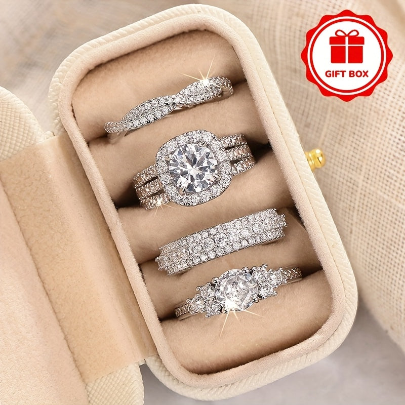 This 4pcs set features women's wedding rings with synthetic zirconia inlay. Perfect for engagements, the set comes in a beautiful PU ring jewelry box, making it a great gift for the bride.