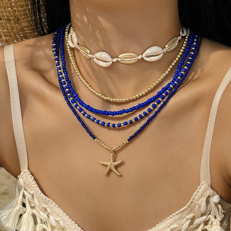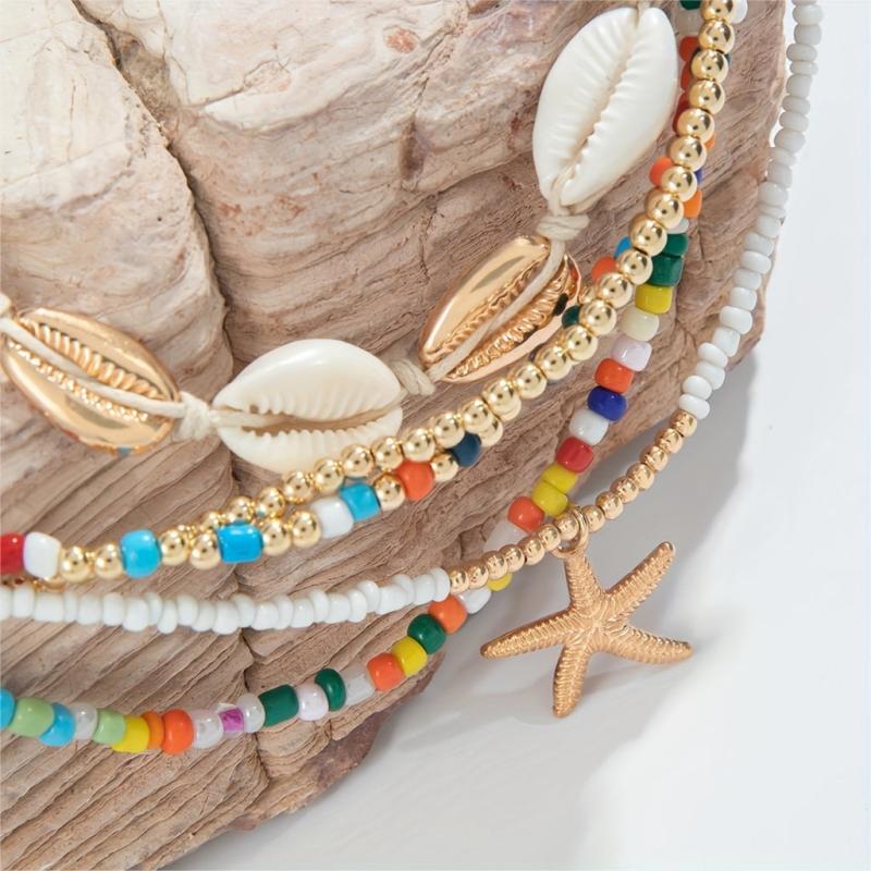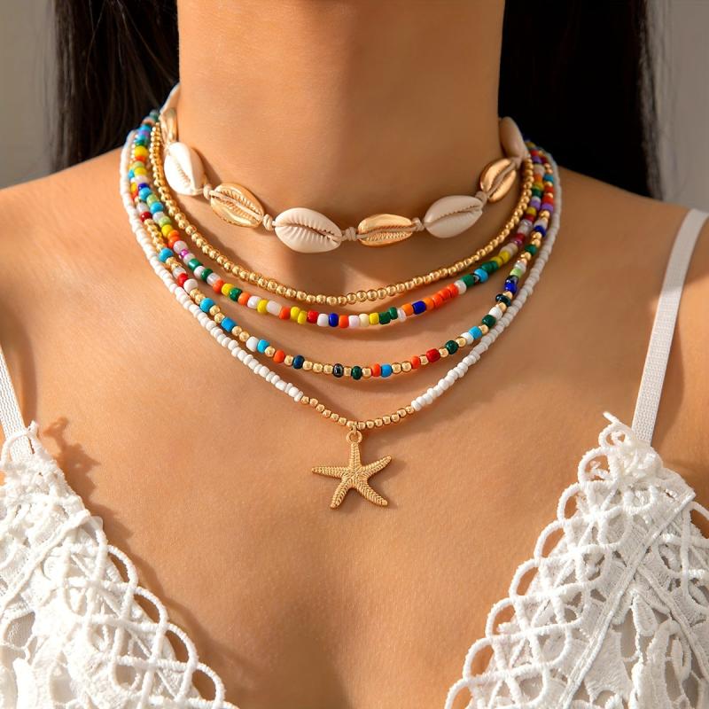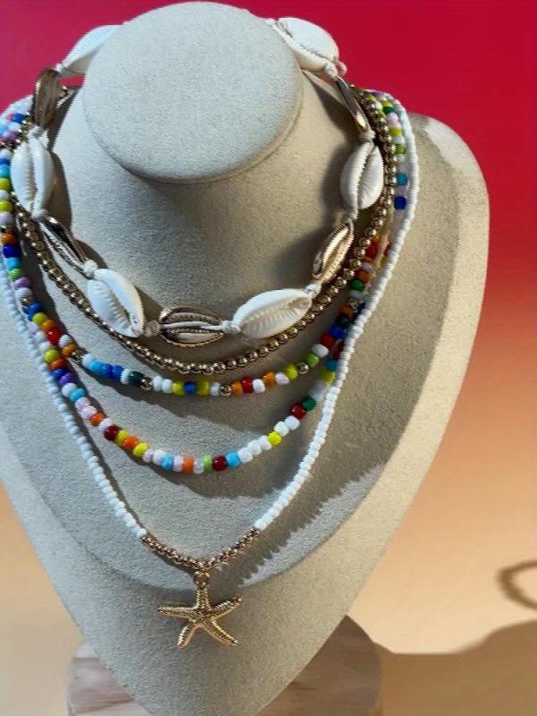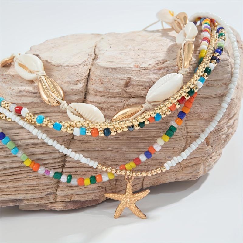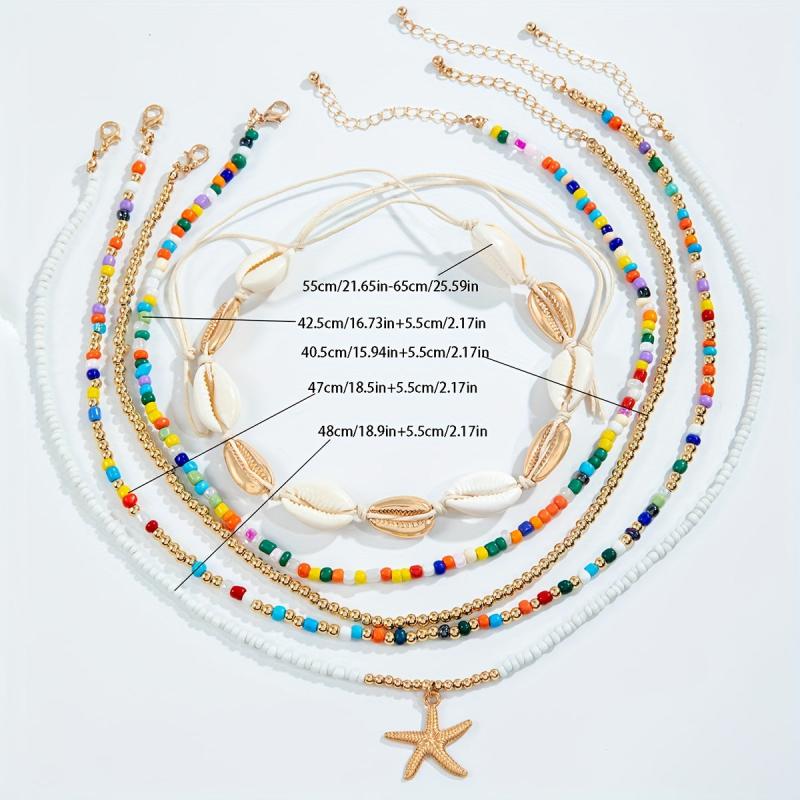 This set includes stylish starfish necklaces and versatile colorful rice beads alloy round bead string necklace, perfect for your beach vacation or Ramadan gatherings.