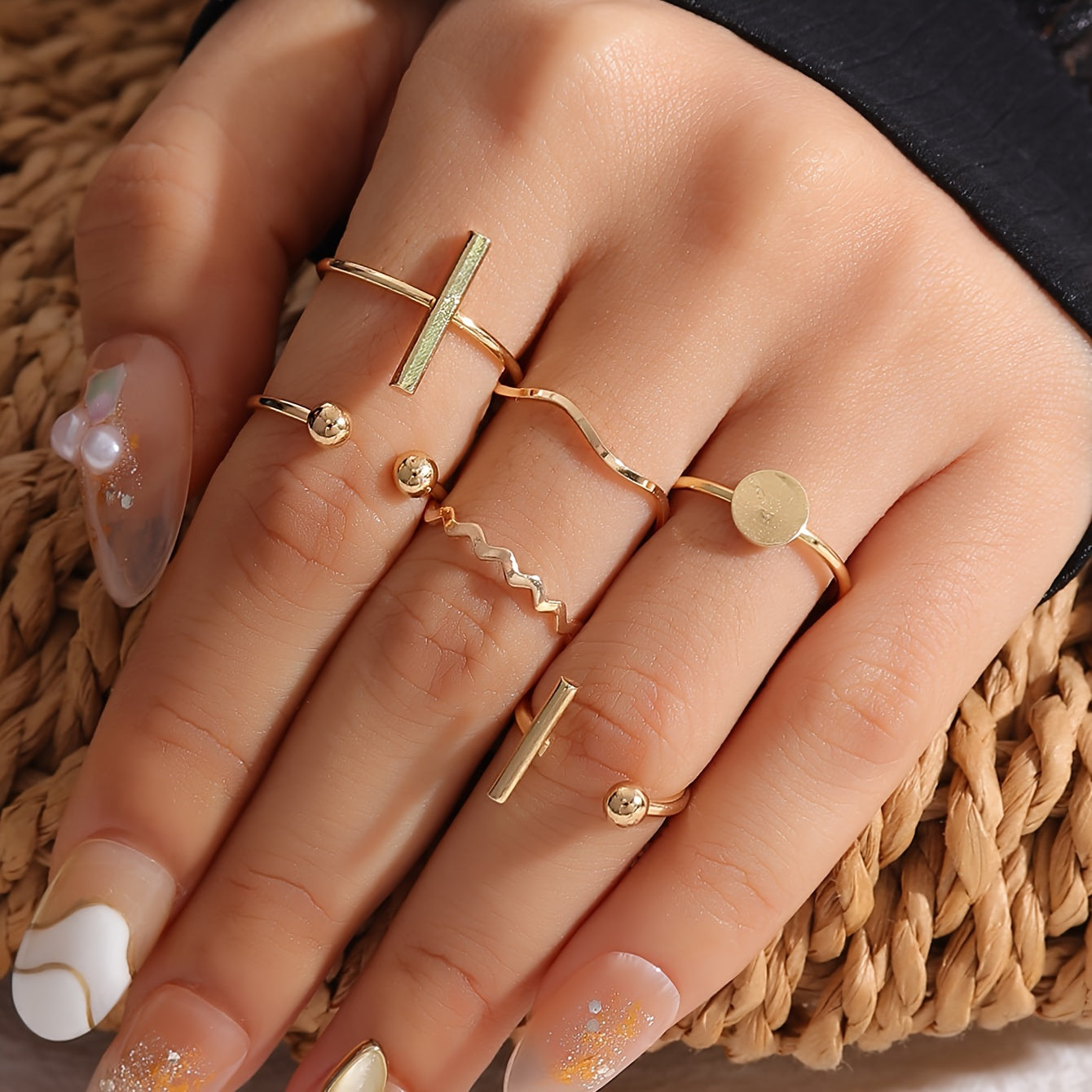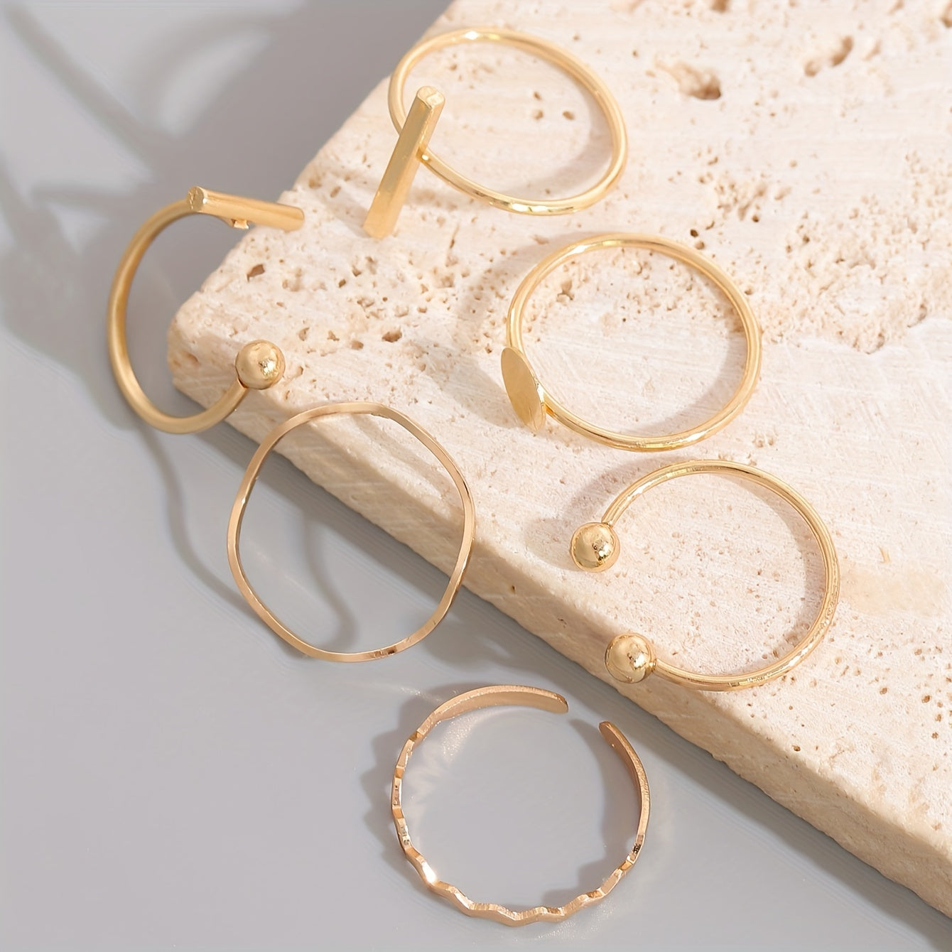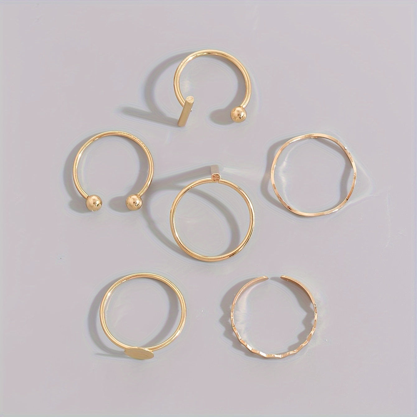 Enhance your style with this set of 6 vintage-inspired rings featuring a minimalist design in a stunning golden tone. Perfect for adding a touch of elegance to any outfit.
