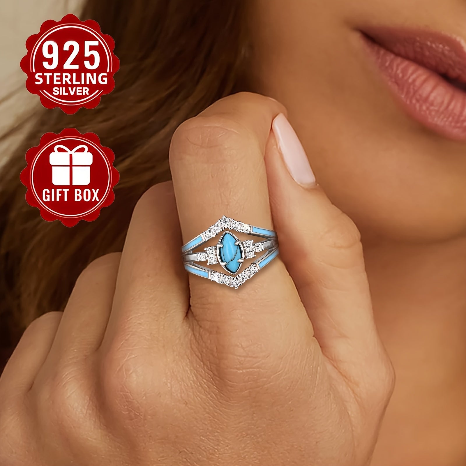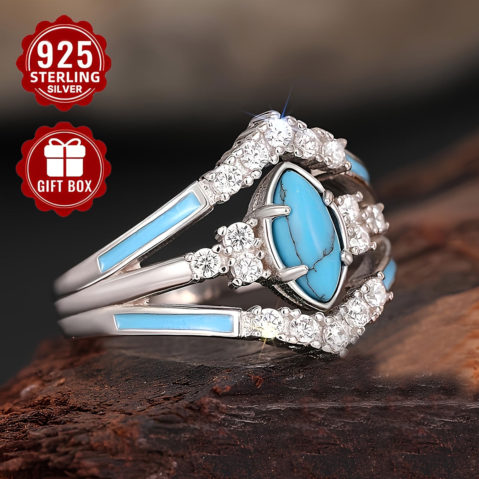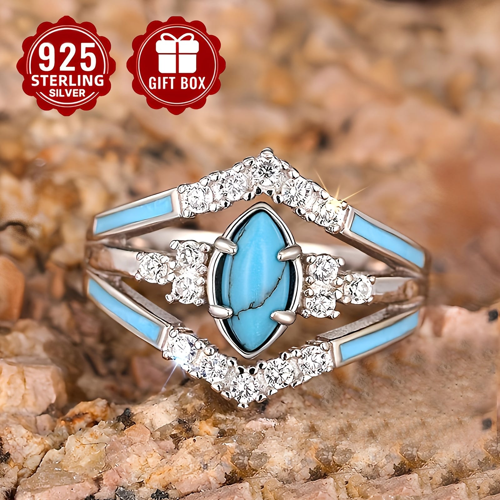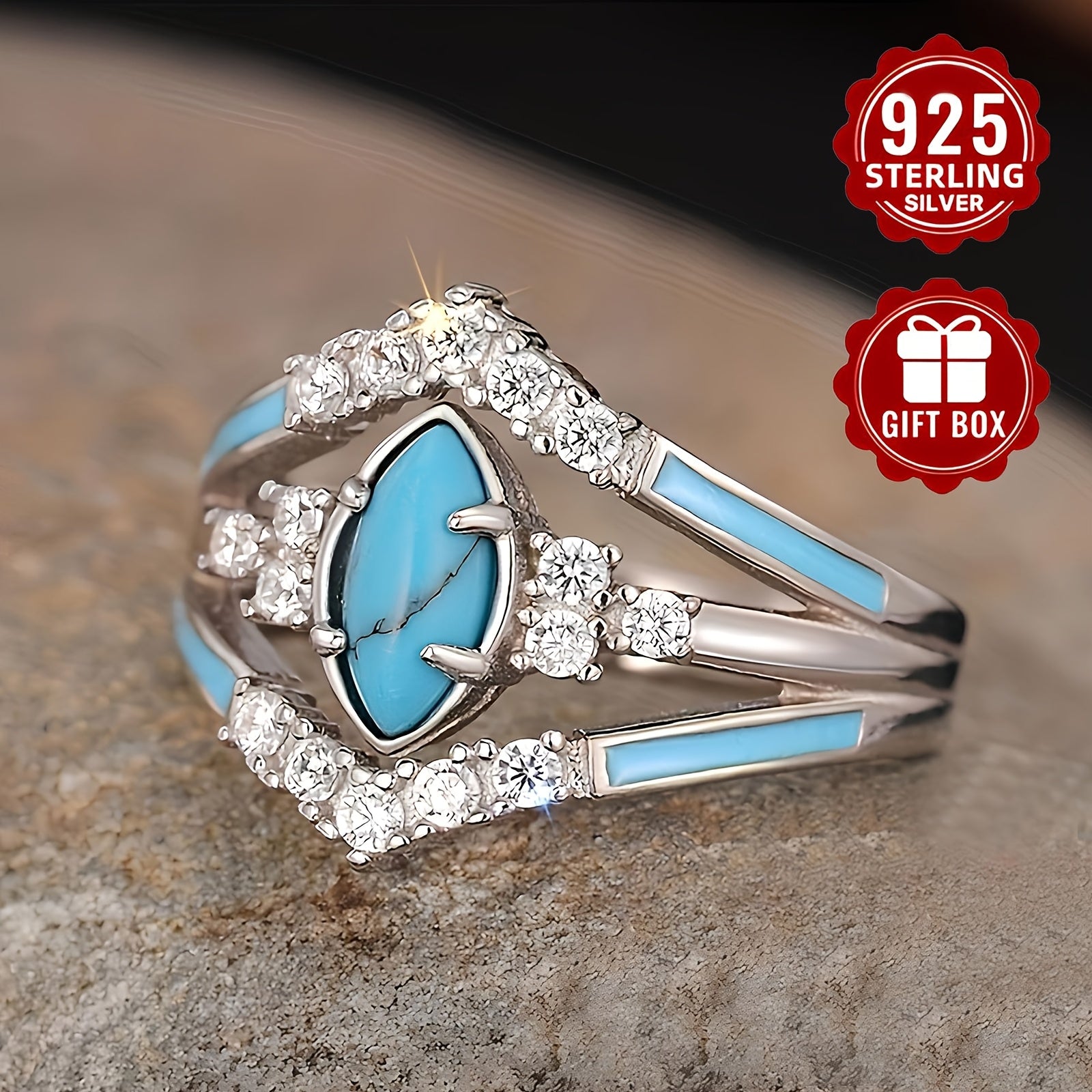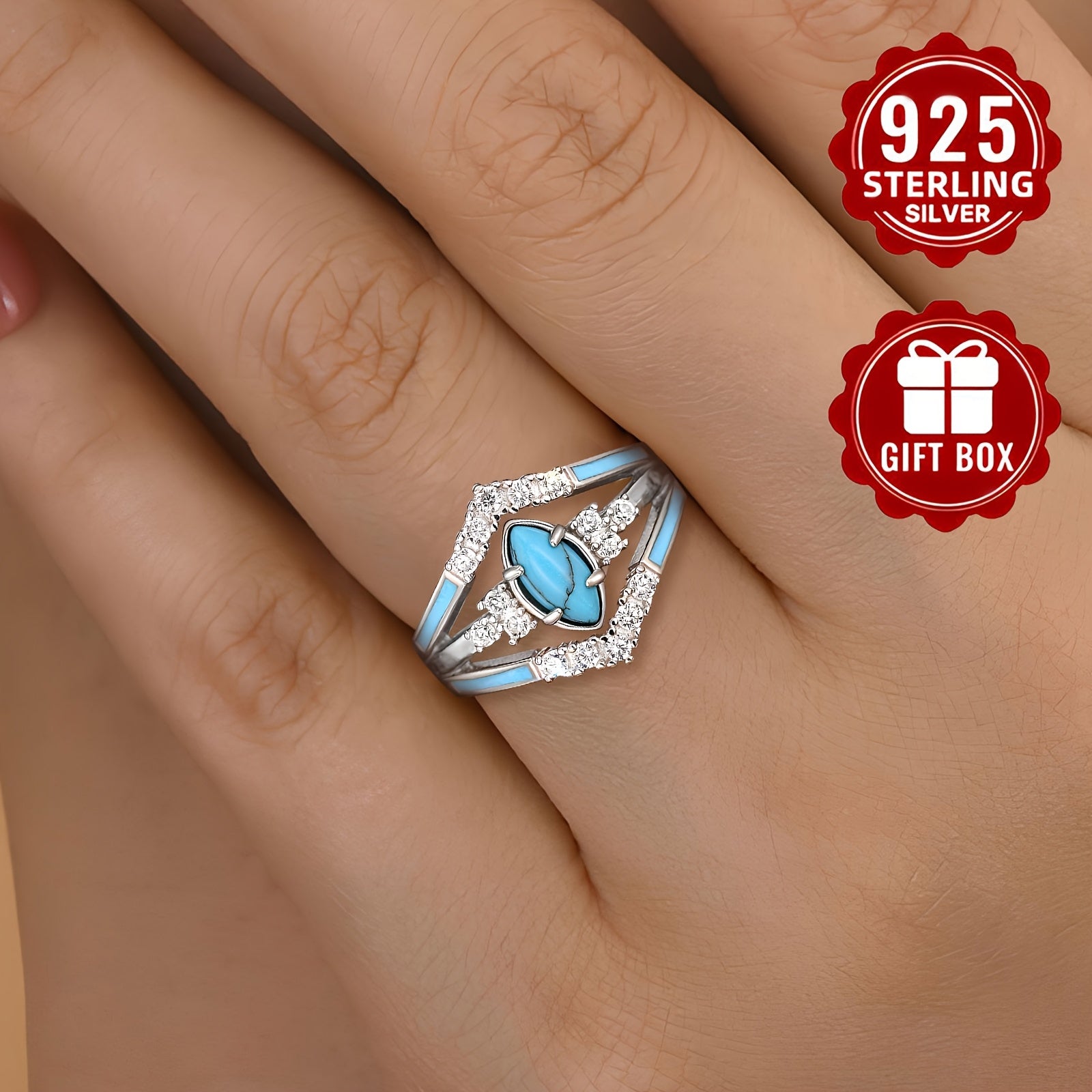 Add a pop of color and unique style to your look with this eye-shaped synthetic turquoise ring. Perfect for daily wear or special occasions, this vintage bohemian ring is adorned with sparkling zirconia and features enchanting enamel details.