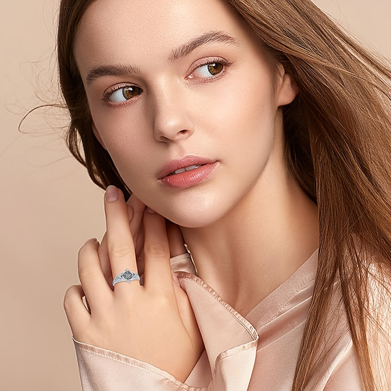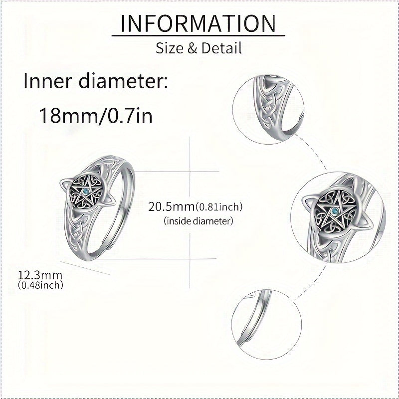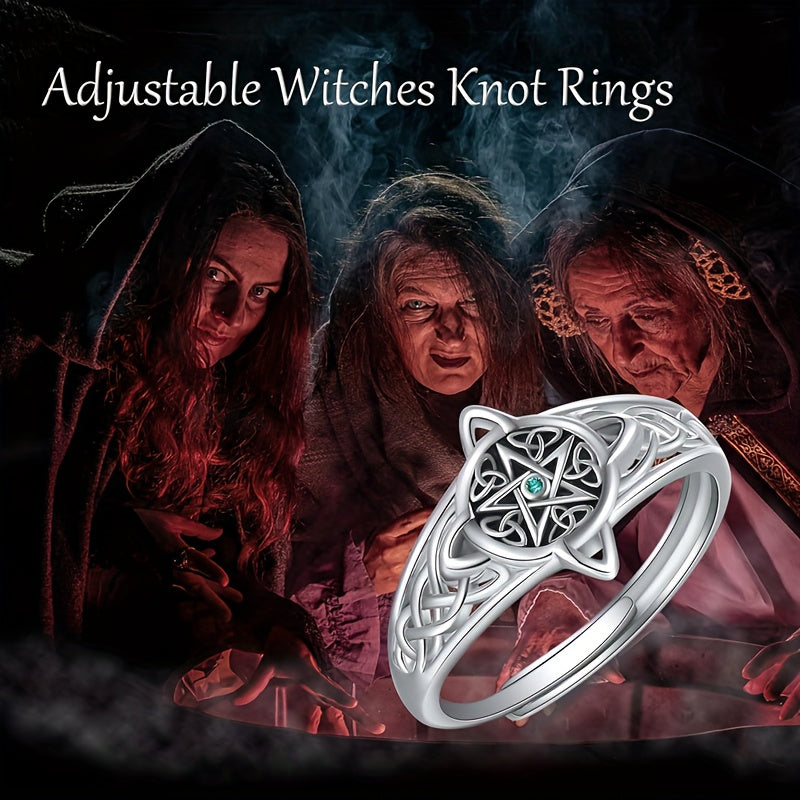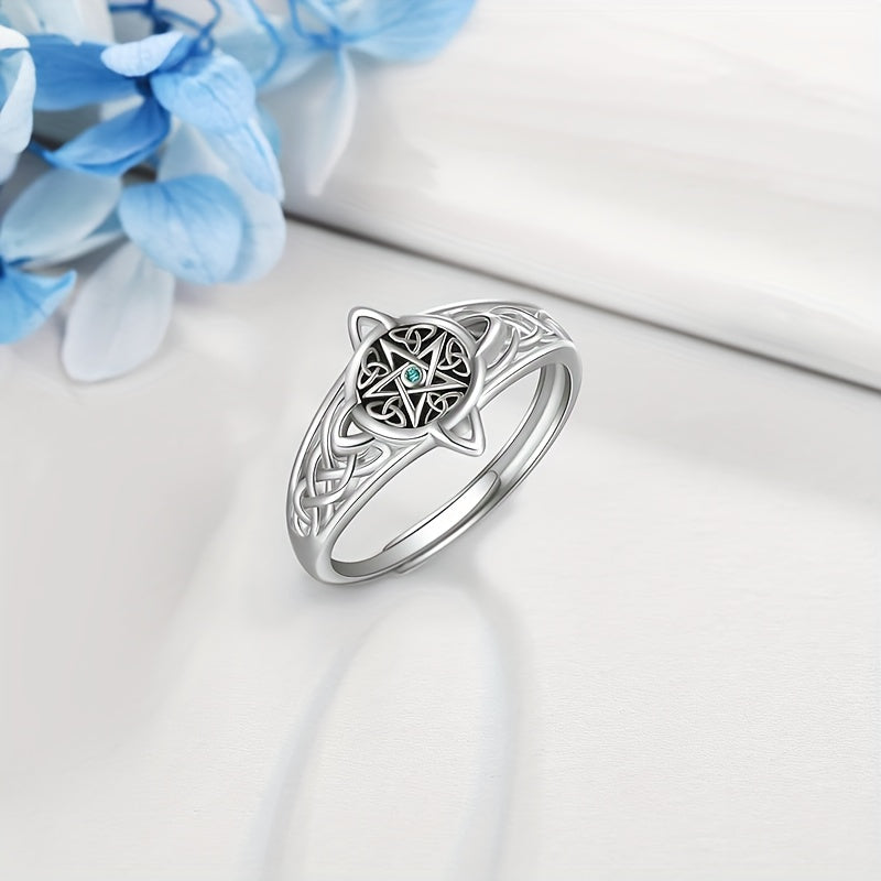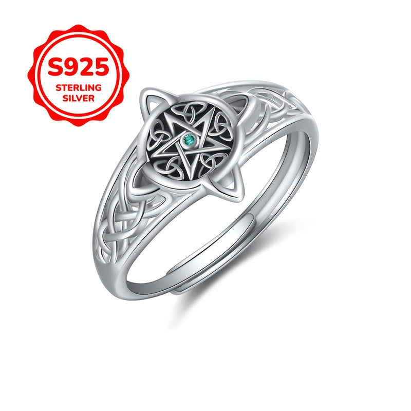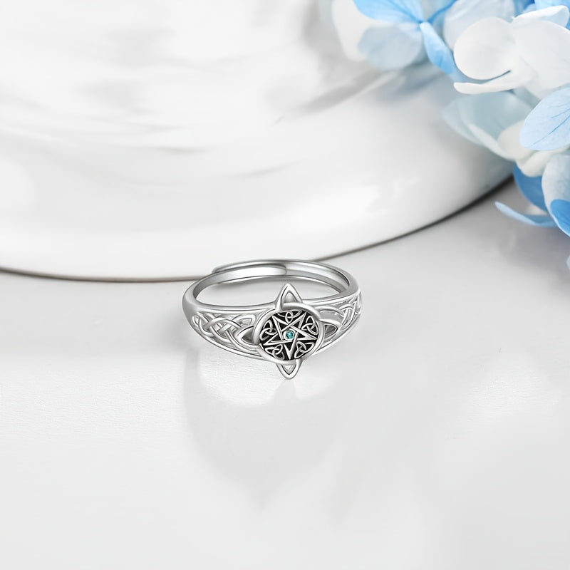 Vintage style Celtic knot ring crafted in 925 sterling silver featuring a pentagram design with zircon stones. Perfect for Halloween or Gothic-inspired outfits.