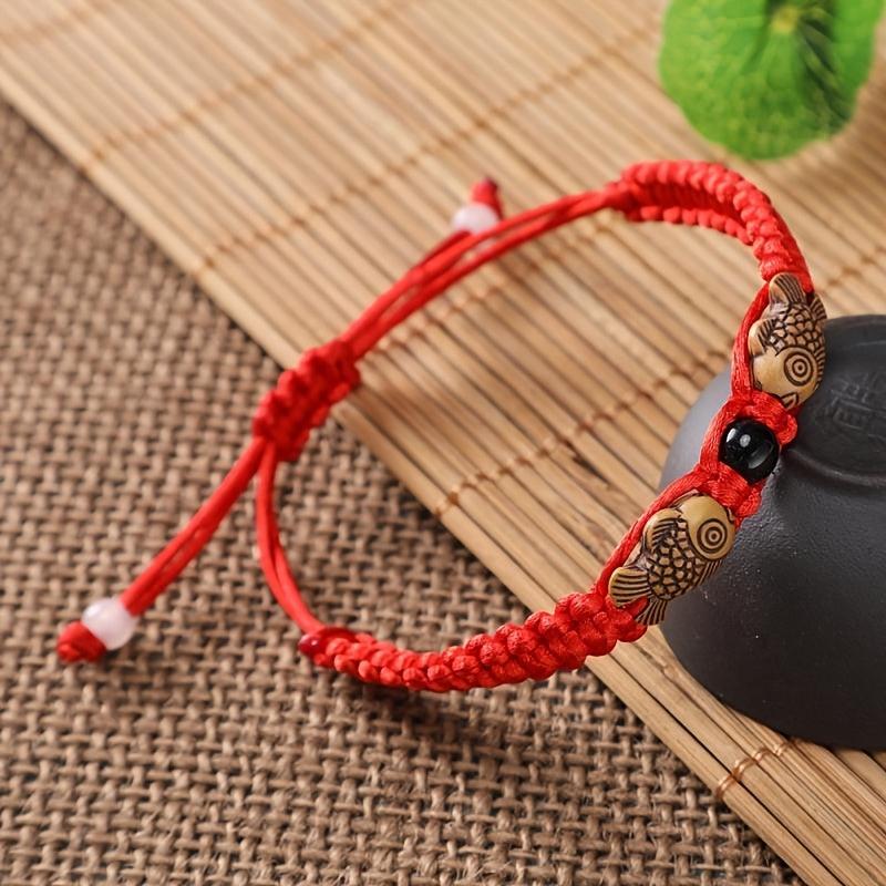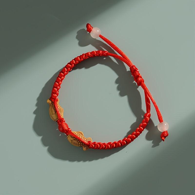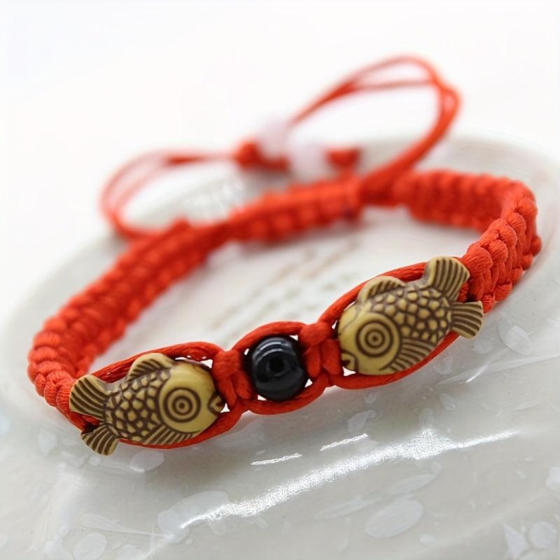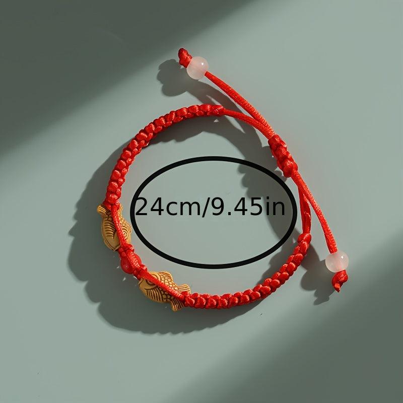 This bracelet features a fish charm on a lucky red lace, making it a versatile accessory for daily wear all season long. It is adjustable to fit most wrist sizes.