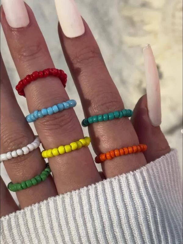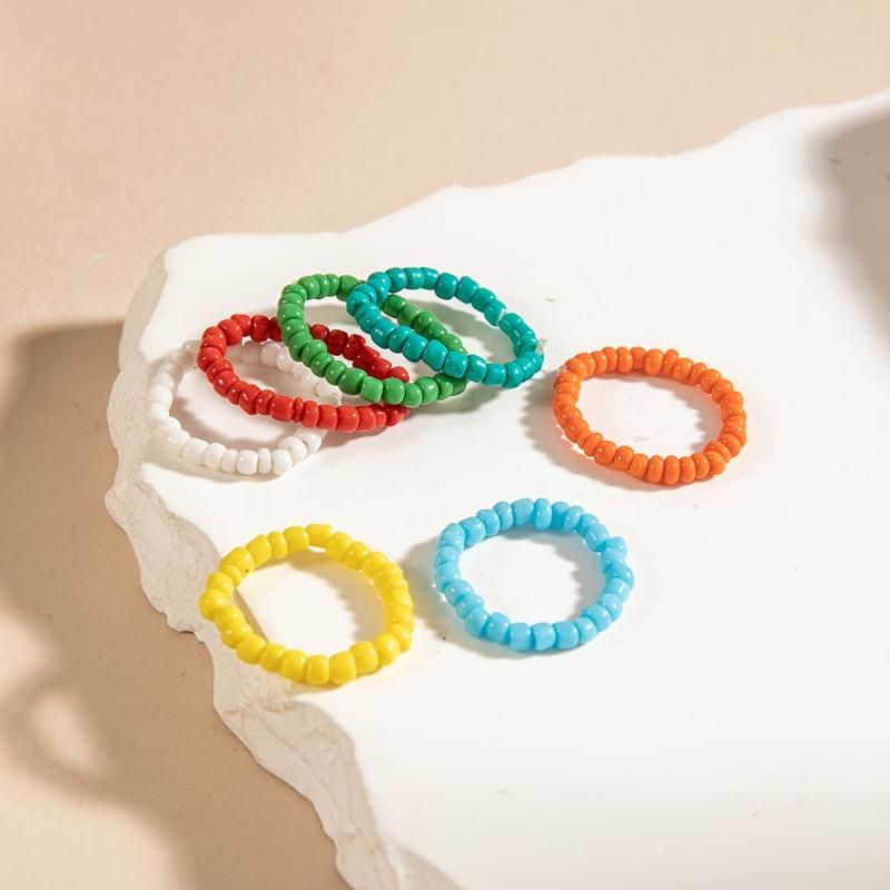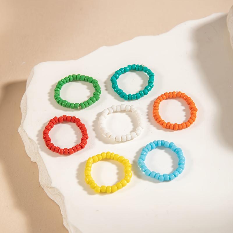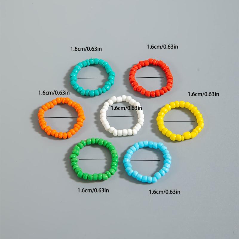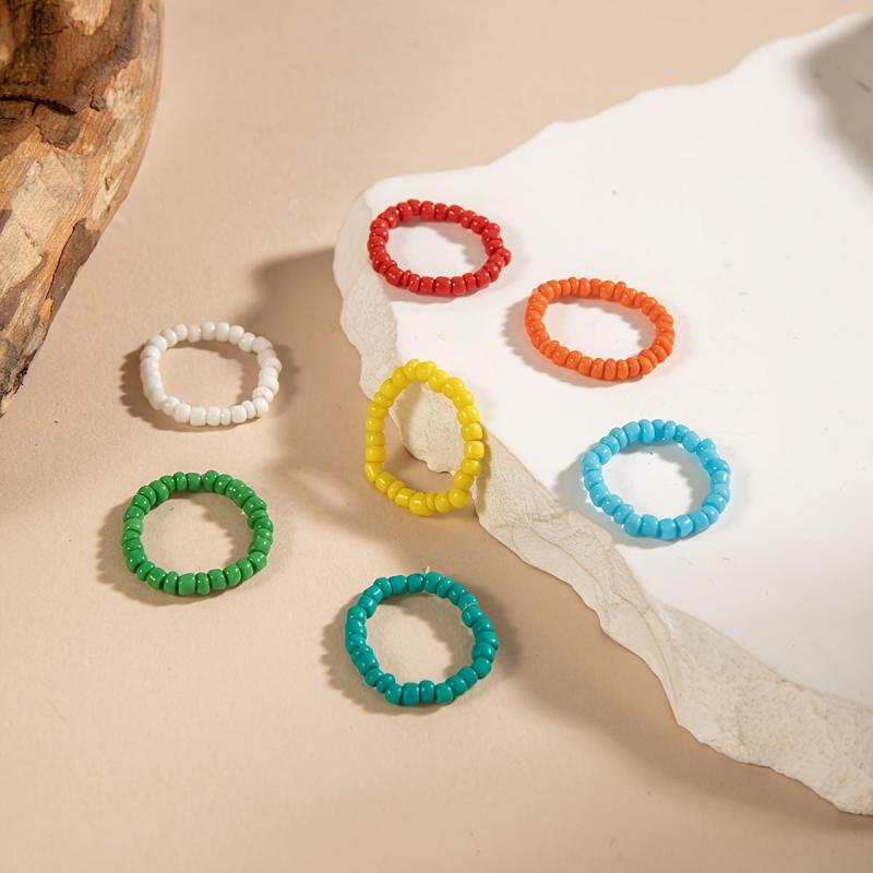 Enhance your vacation style with this set of 7 colorful beaded stretch rings, perfect for beach travel and casual attire. A great gift idea for a vacation jewelry lover!