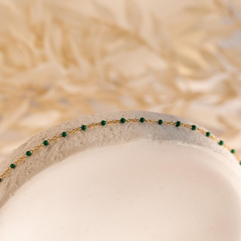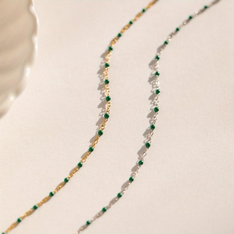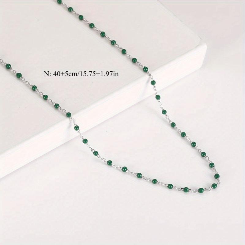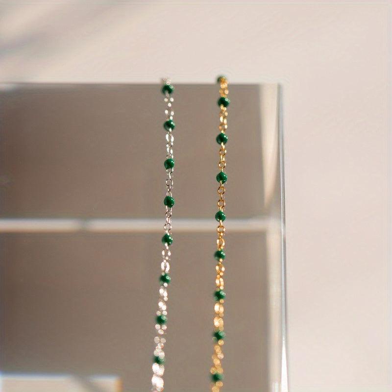 Add a touch of bohemian gothic charm to your outfit with this stylish stainless steel chain necklace. Featuring a golden tone with green beads, this layered jewelry piece is perfect for both casual and formal occasions.