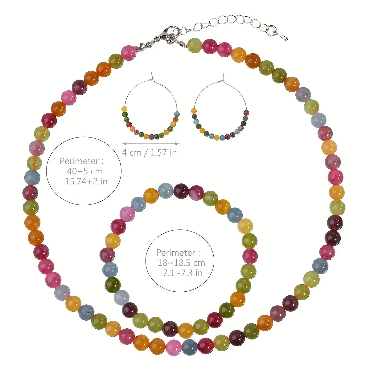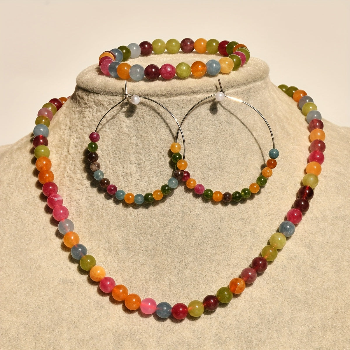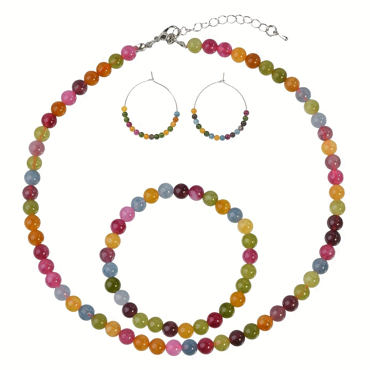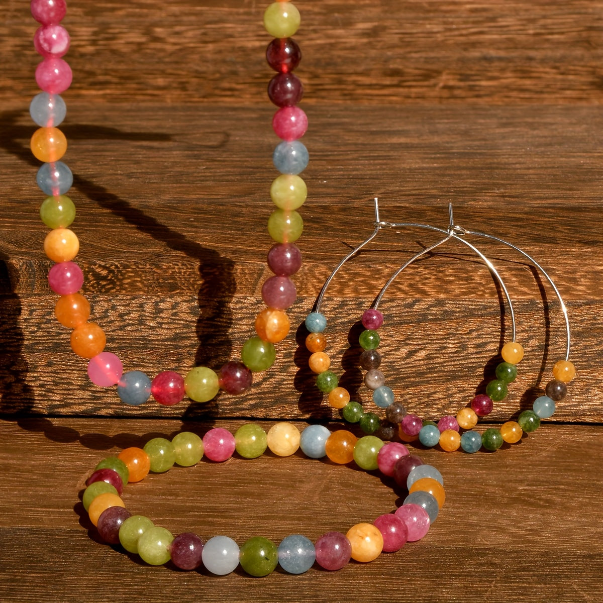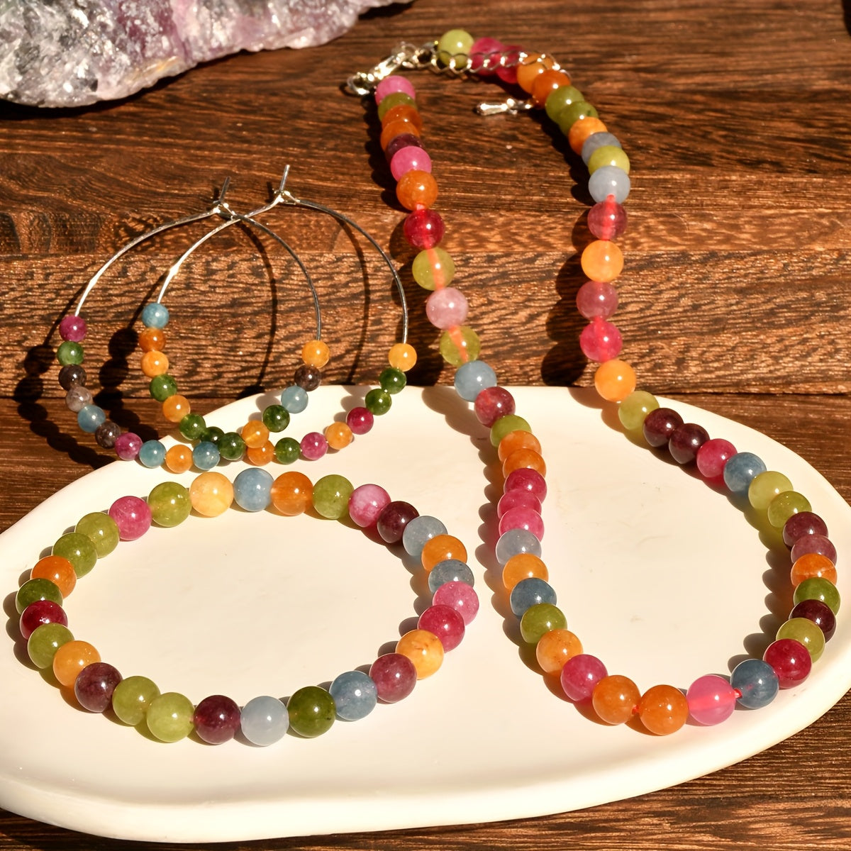Get ready for summer with this colorful and vibrant natural stone necklace, bracelet, and earrings set. Perfect for holiday and beach outings.