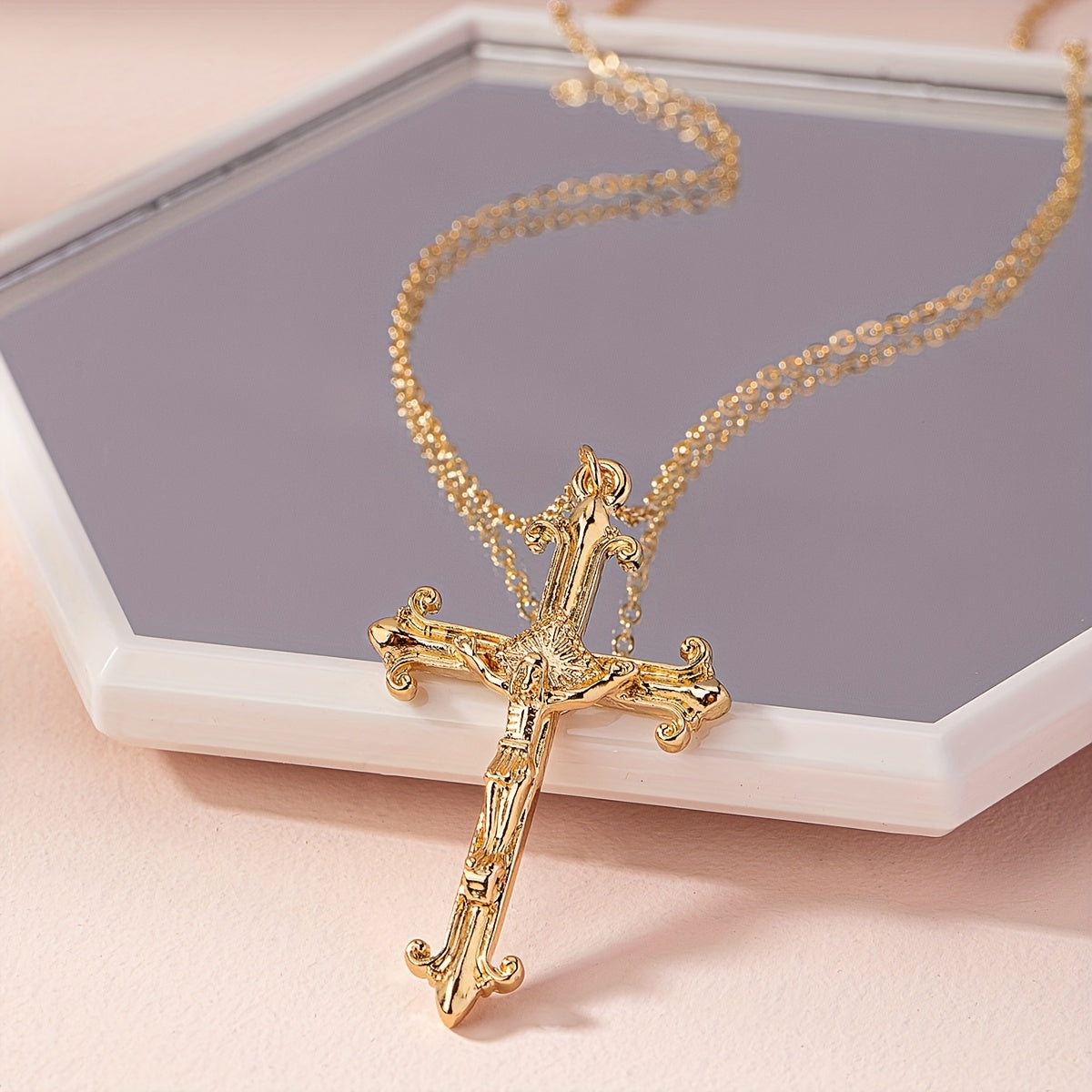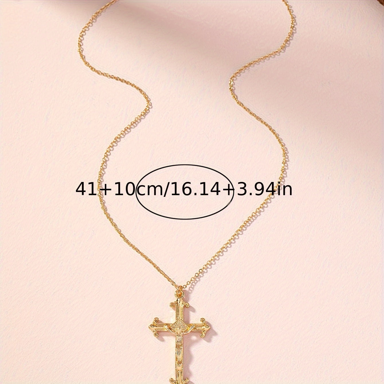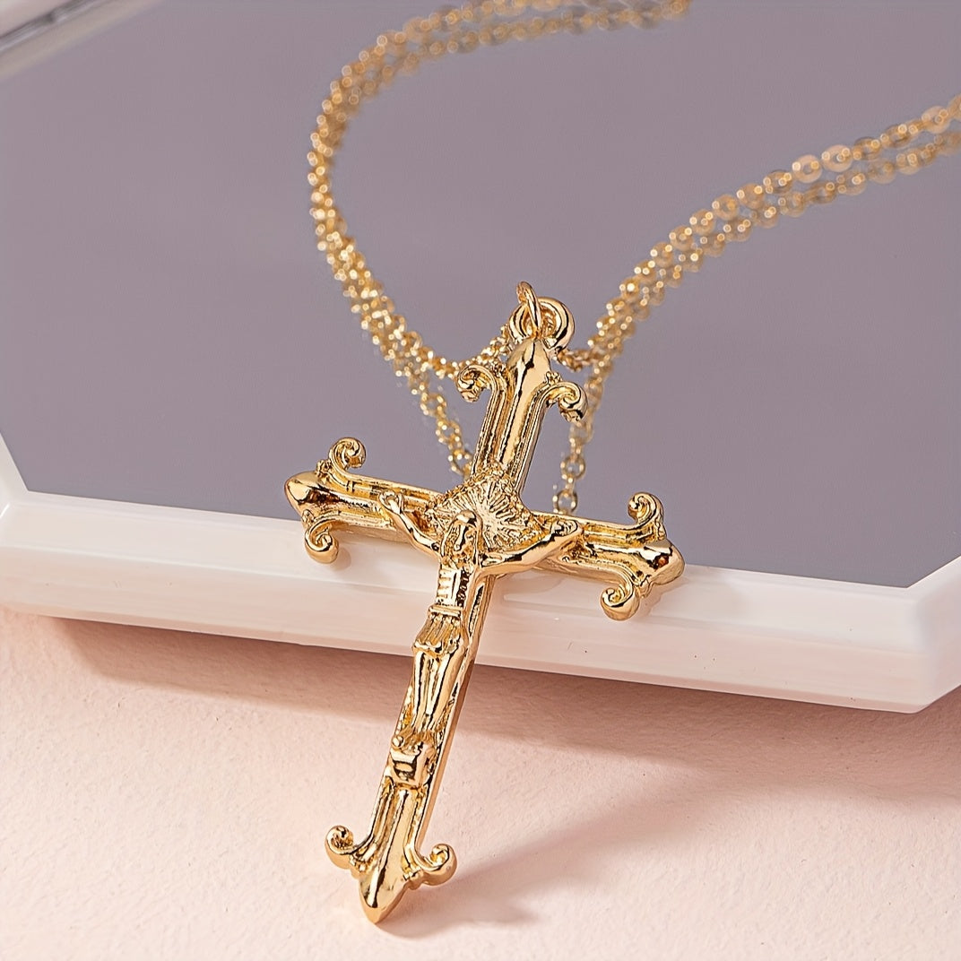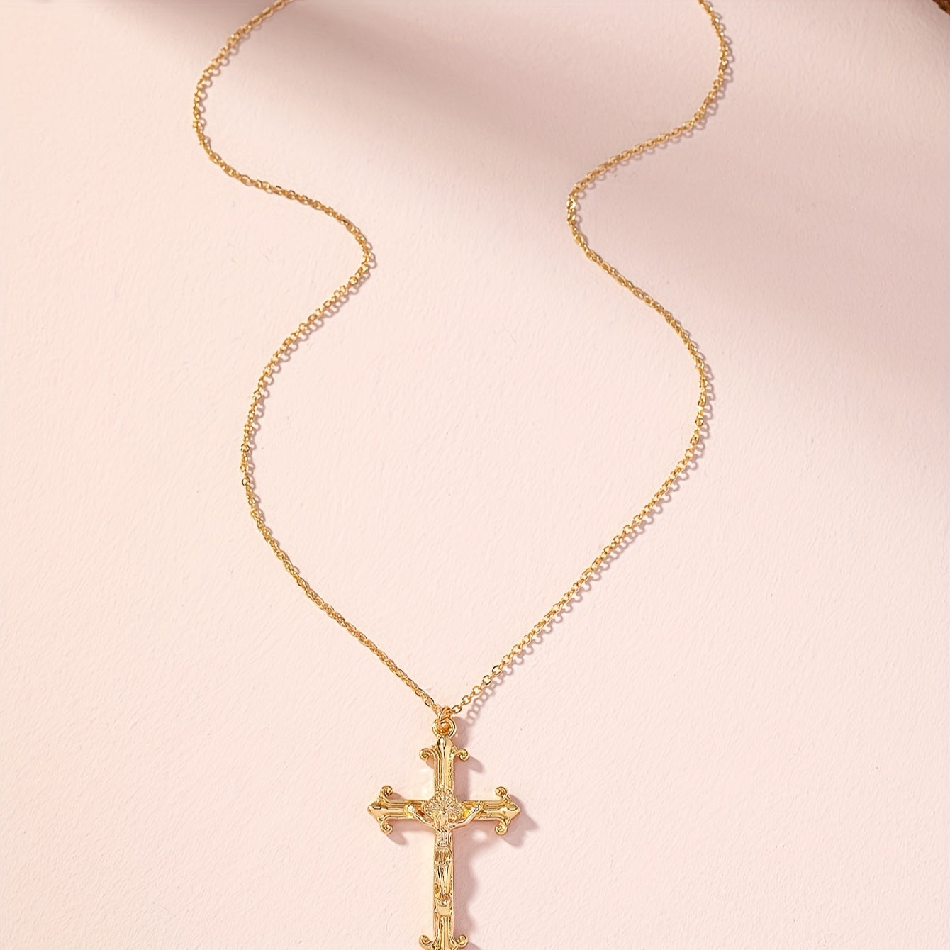 This intricate and delicate cross pendant necklace exudes a vintage bohemian charm. Its golden color adds an elegant touch to any outfit.