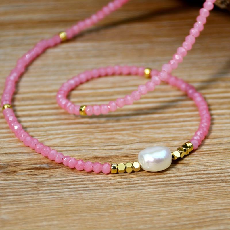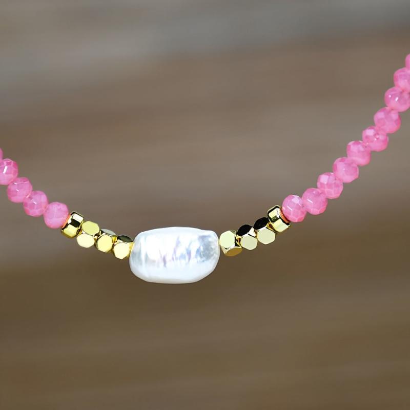 Boho Pink & Freshwater Pearl Necklace with Golden Spacers