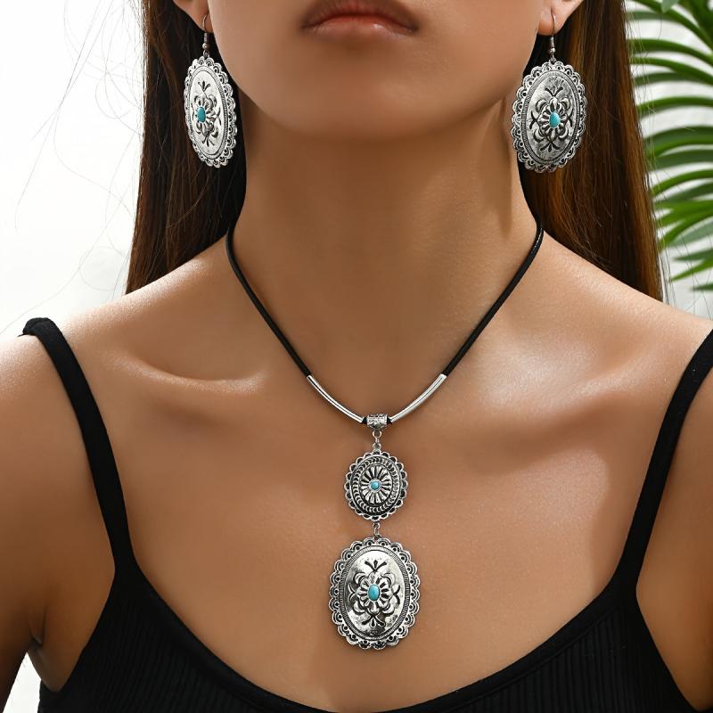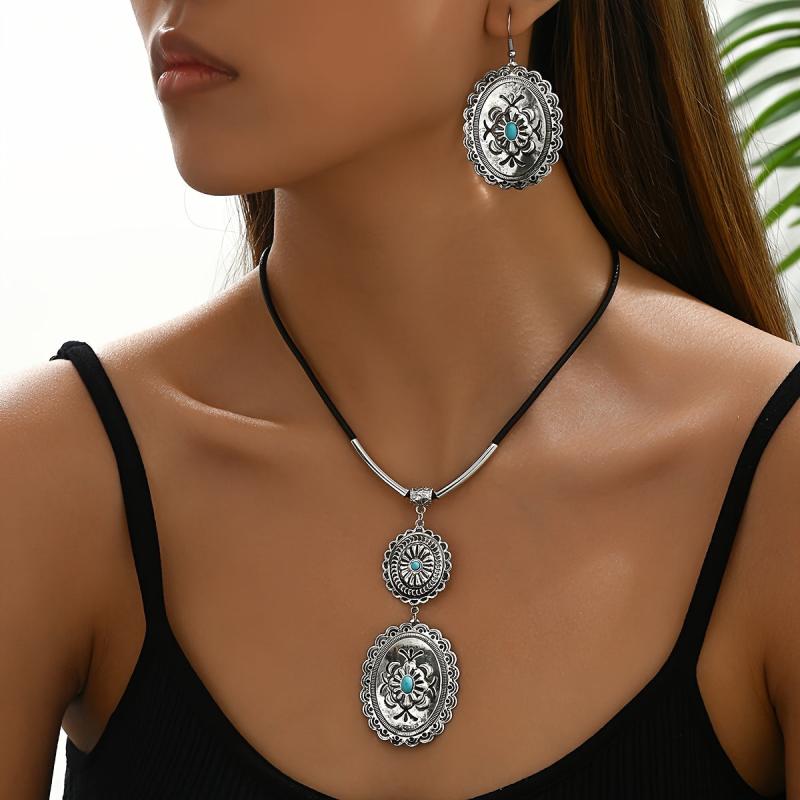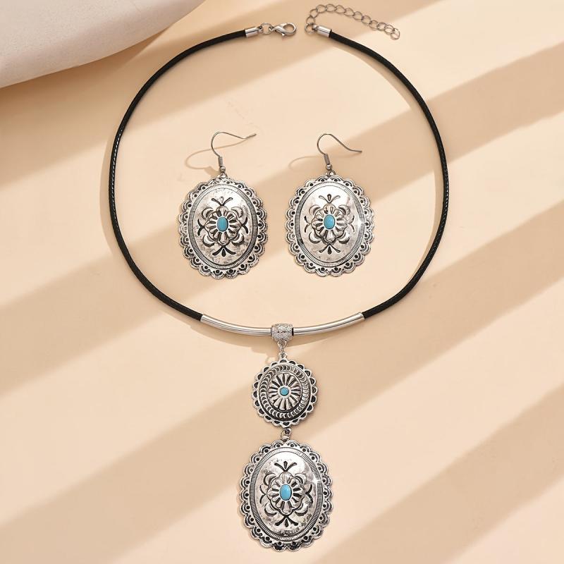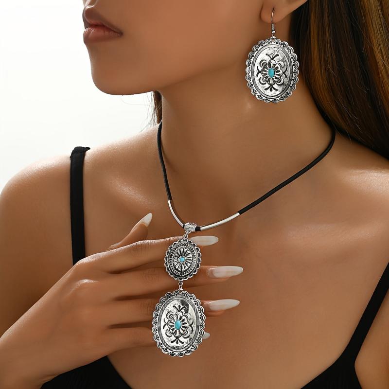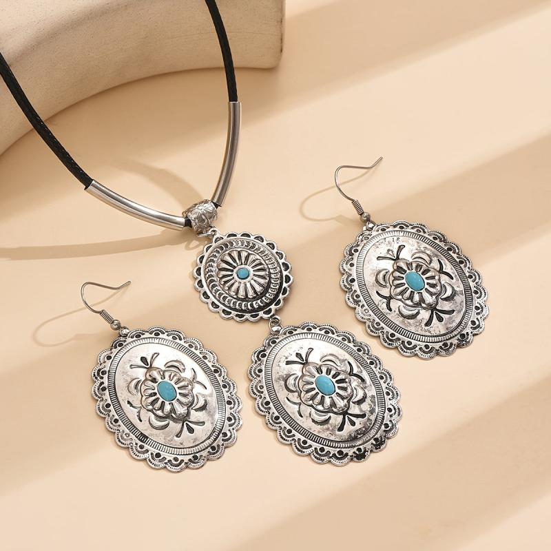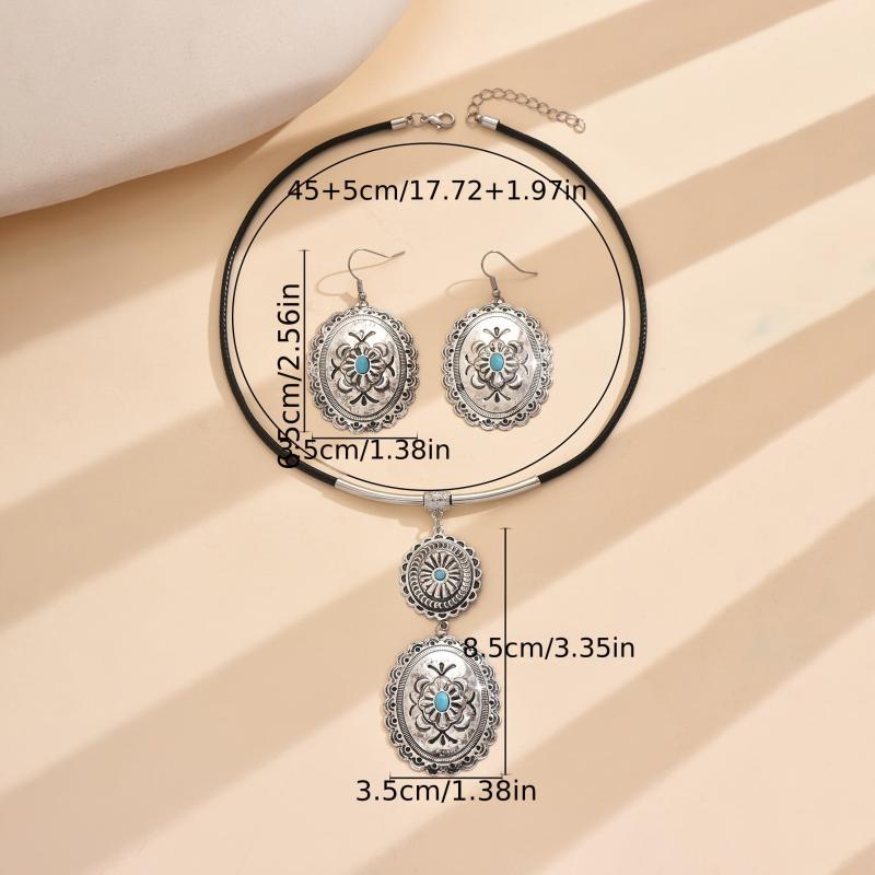 Complete your retro look with this bohemian jewelry set featuring a green turquoise oval pendant necklace and matching earrings. Stand out with this exaggerated vintage statement piece.