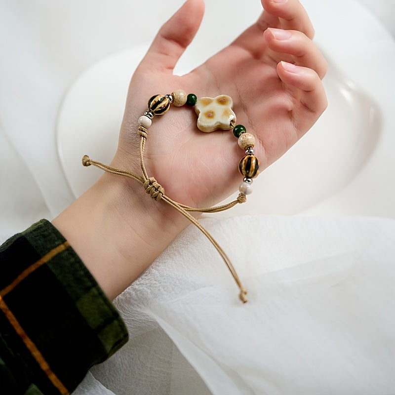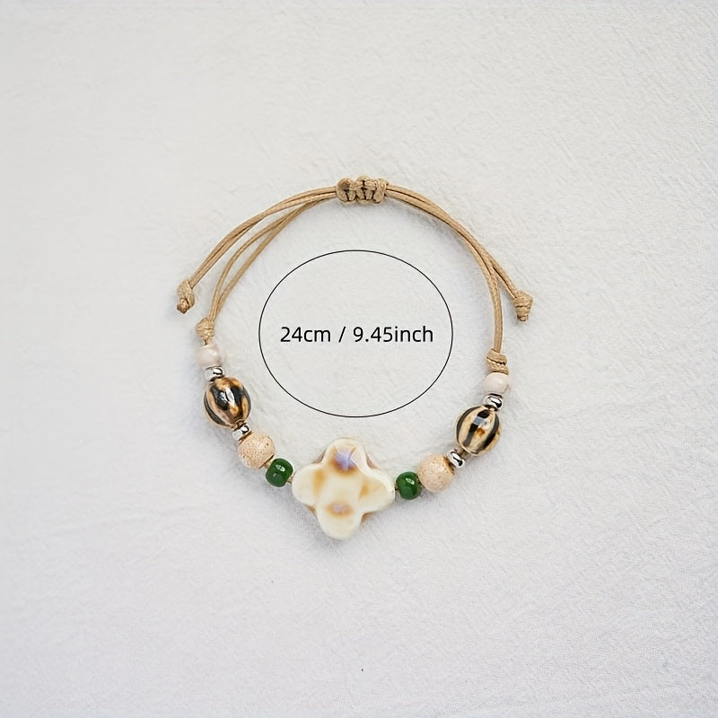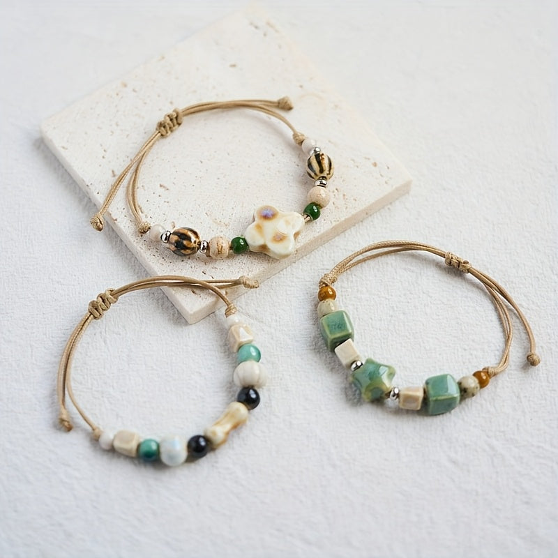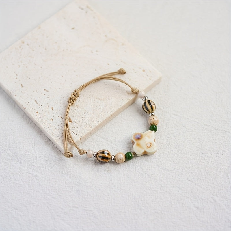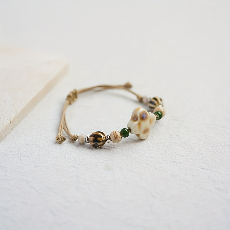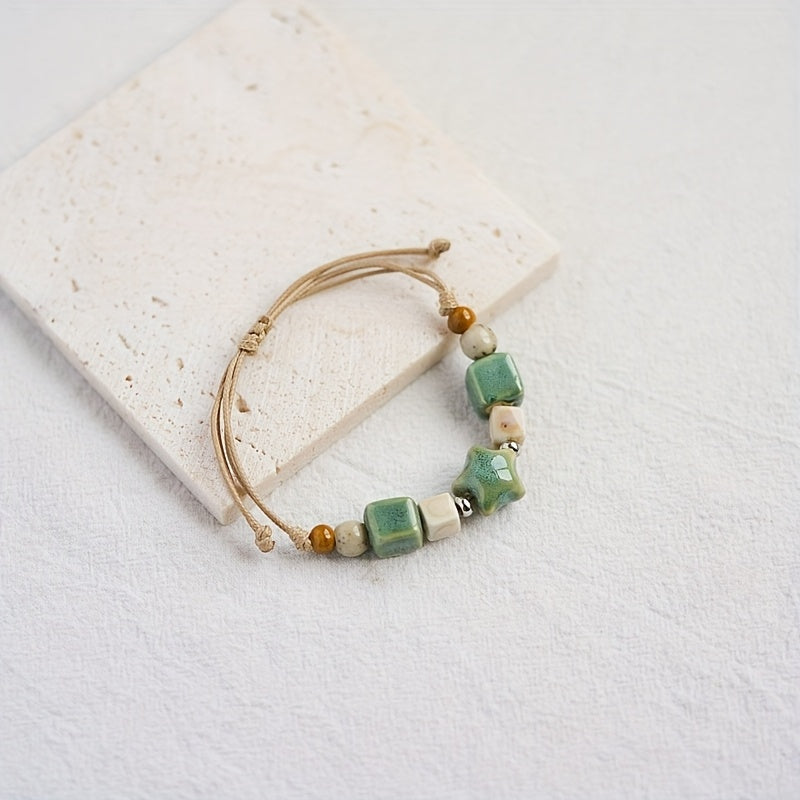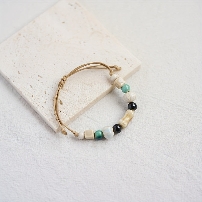 This handcrafted bracelet features an adjustable design with ceramic beads and synthetic stones. Ideal for daily wear, travel, and vacations.