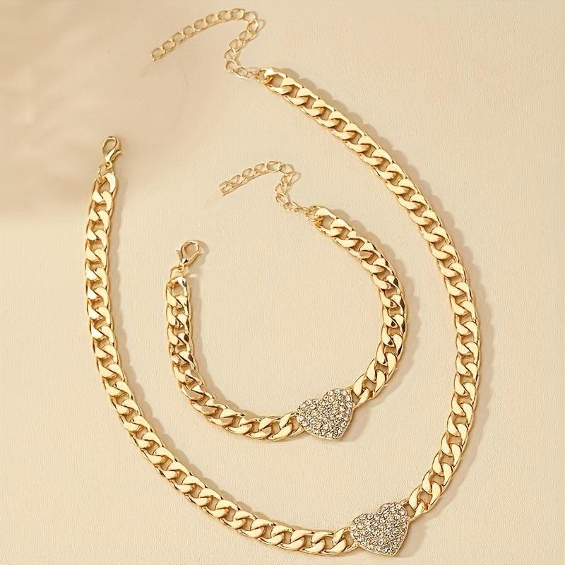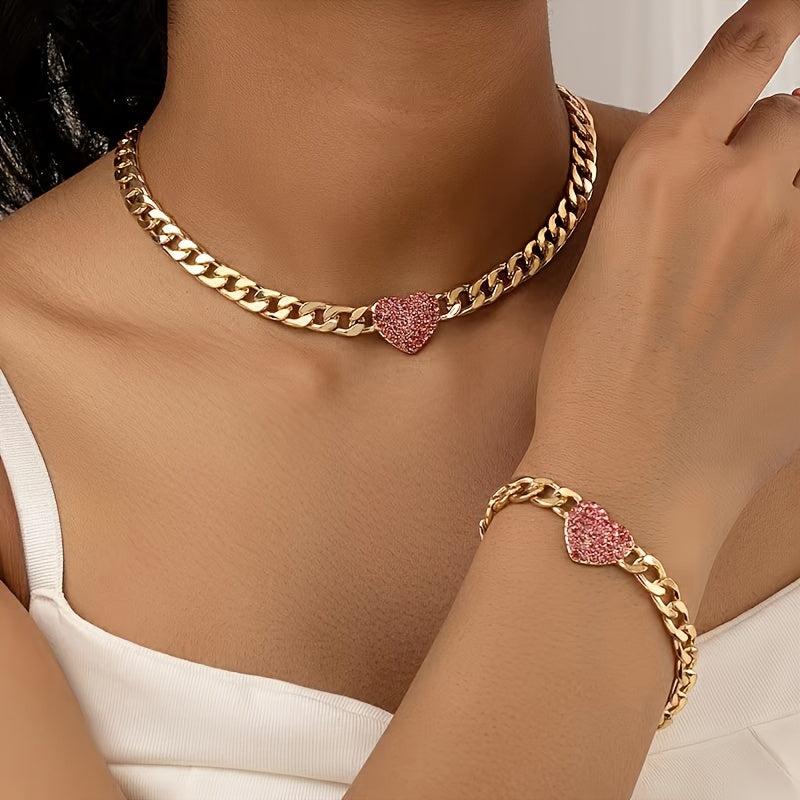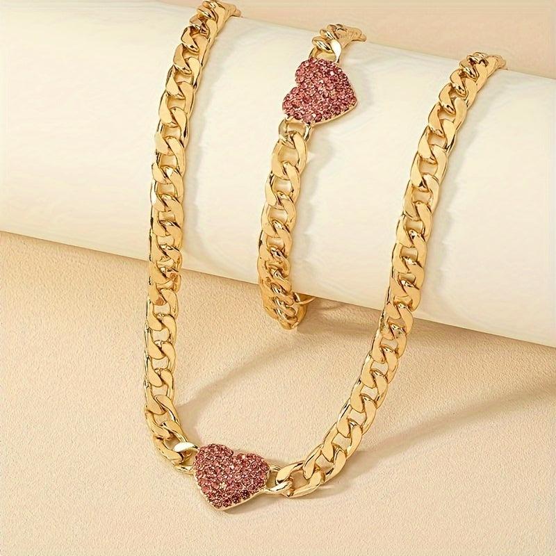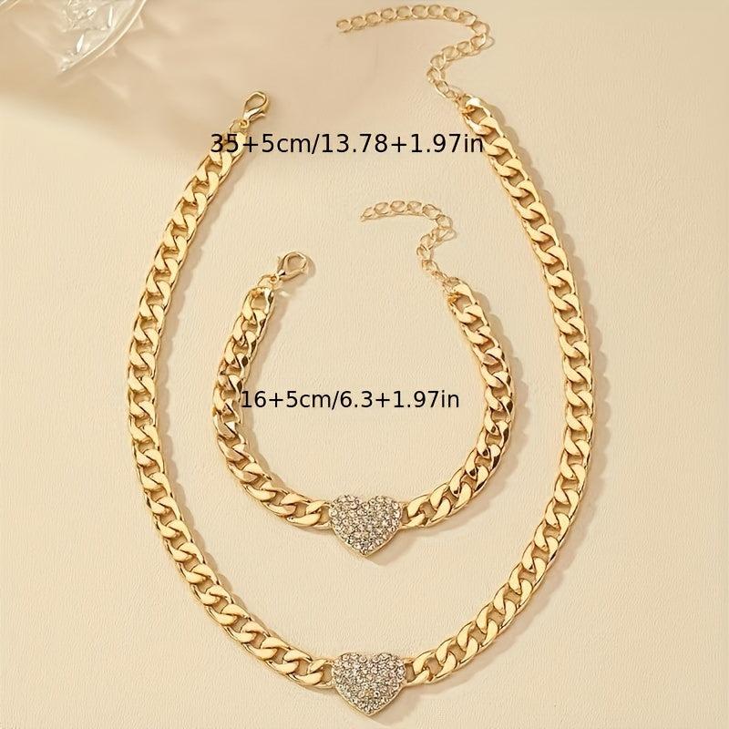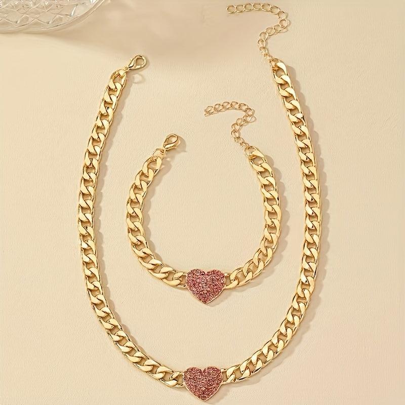 Elegant vintage set featuring a heart pendant necklace and matching hand pendant. Adorned with sparkling rhinestones, perfect for a romantic look.