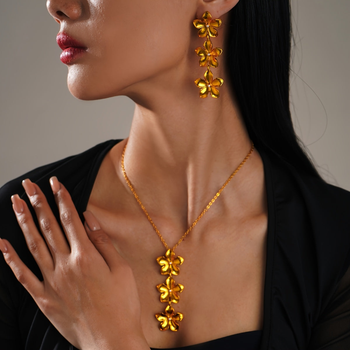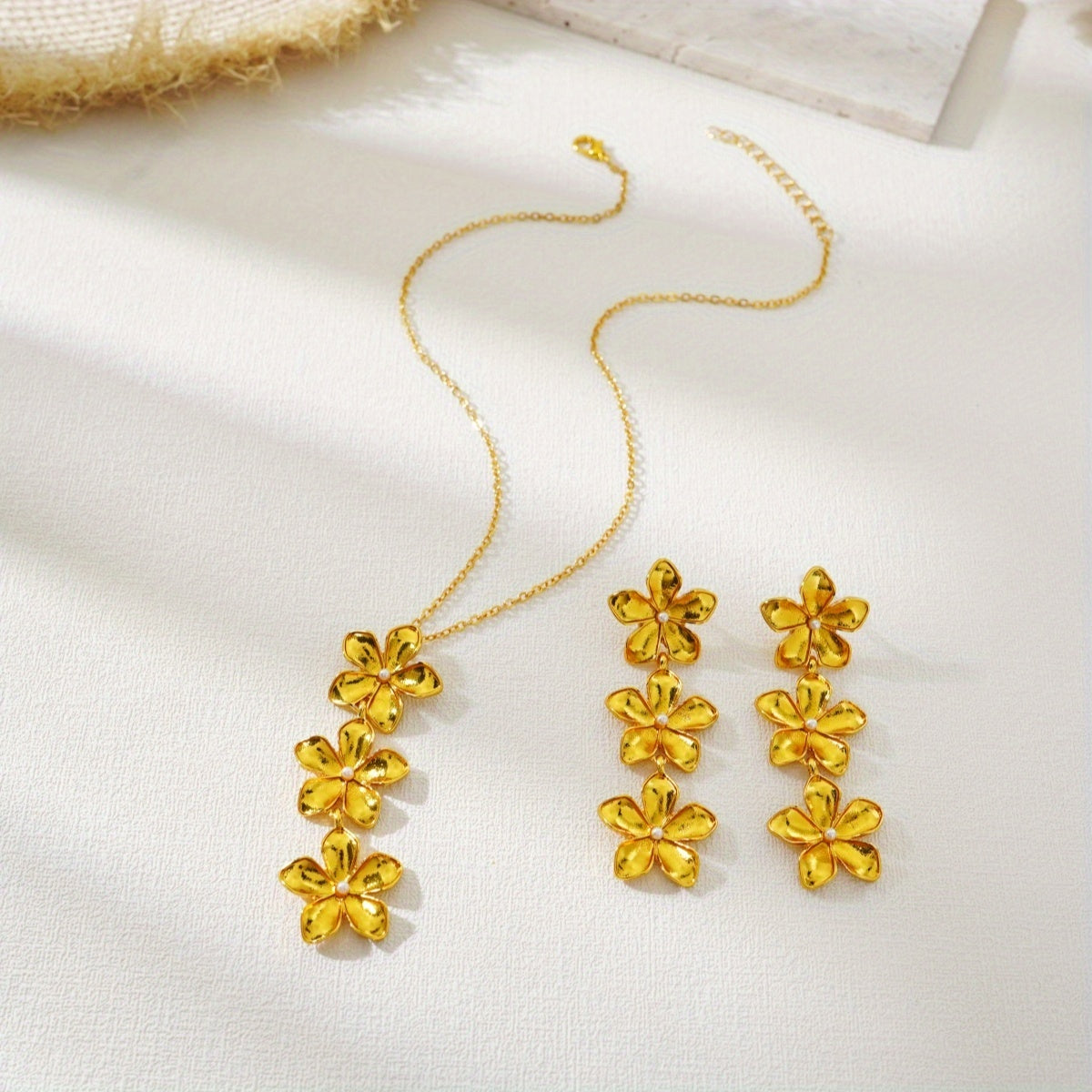 Elegant French vintage style jewelry set with three flower pendant necklace and matching earrings. Perfect for casual daily wear or special occasions.