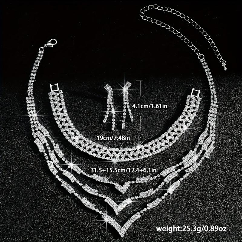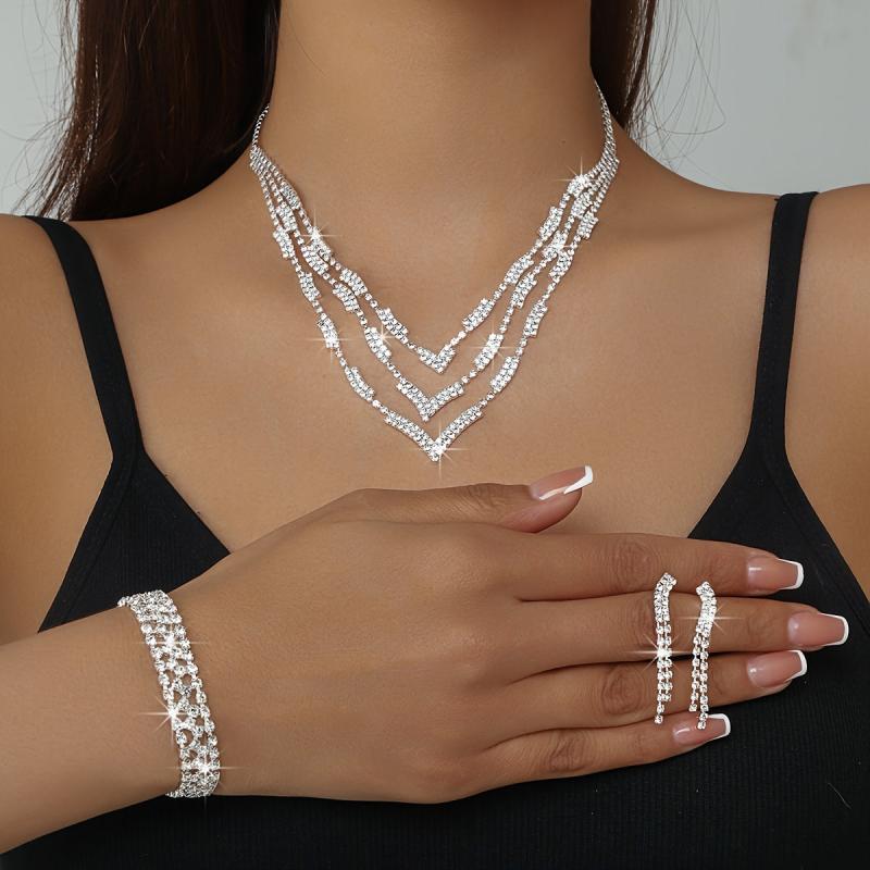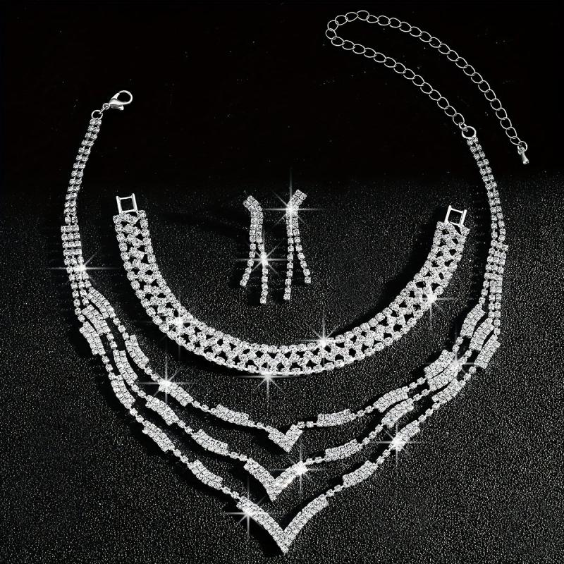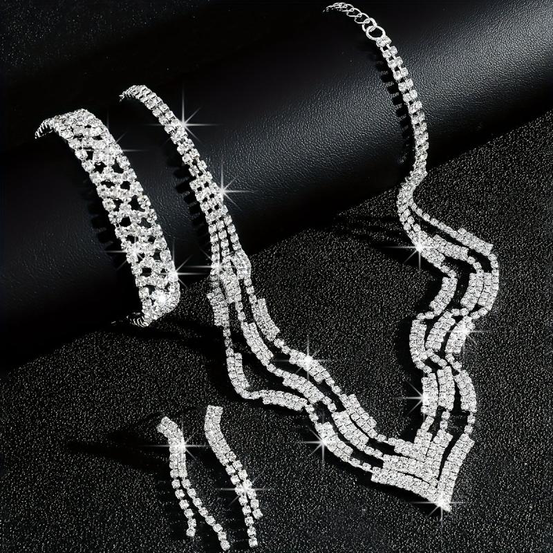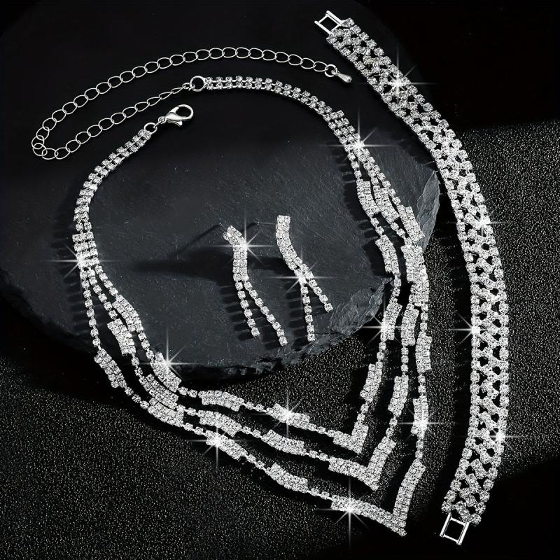Elegant jewelry set featuring necklace, bracelet, and earrings with a golden tone finish and rhinestone accents.