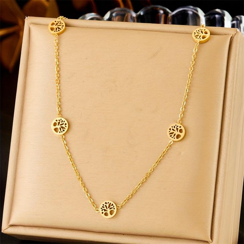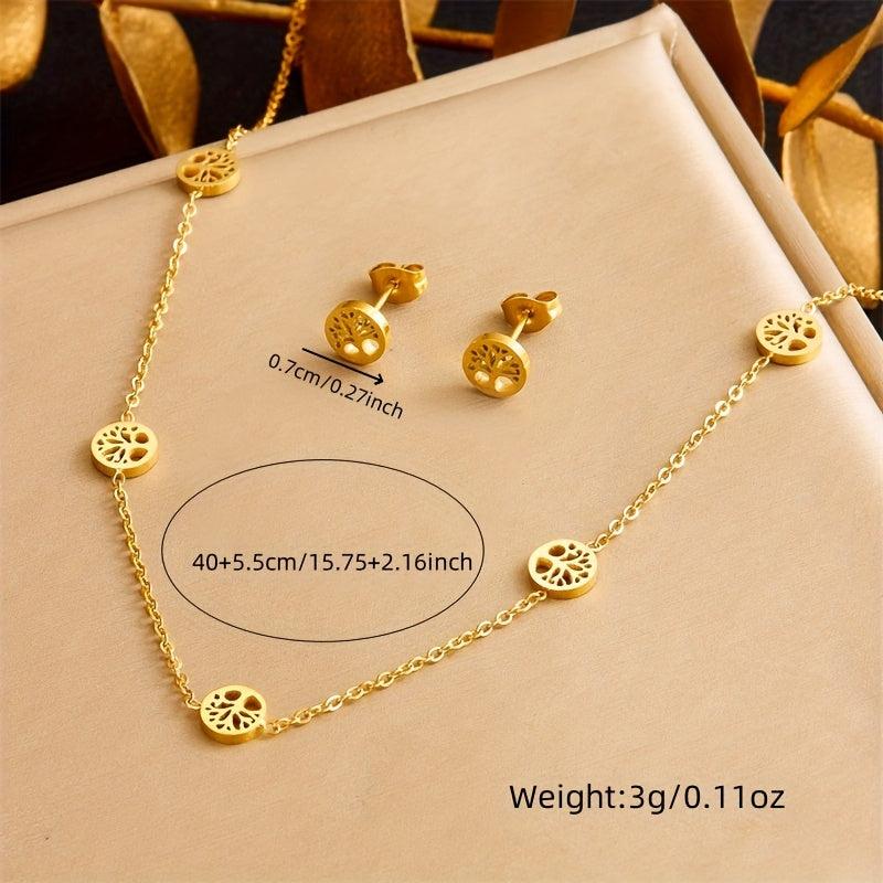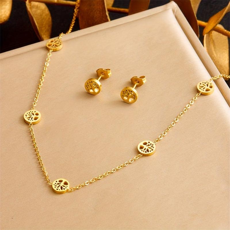 Elegant stainless steel jewelry set featuring a tree of life design, perfect for holiday parties and gift giving.