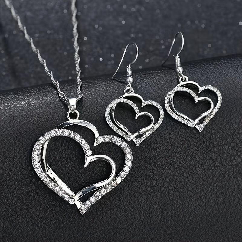 Elegant jewelry set featuring a classic heart pendant necklace and matching earrings with sparkling rhinestones.