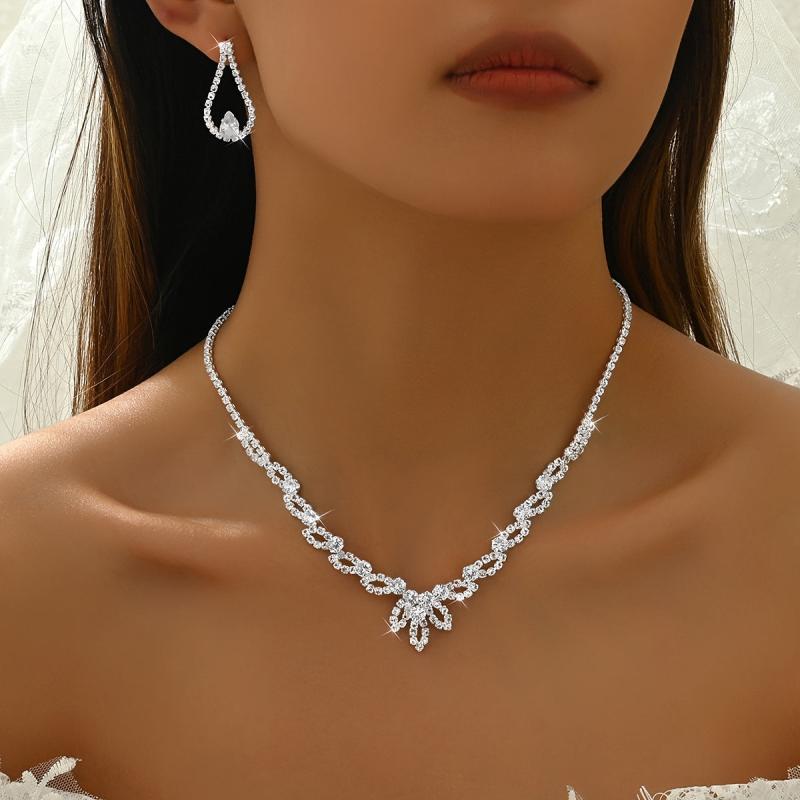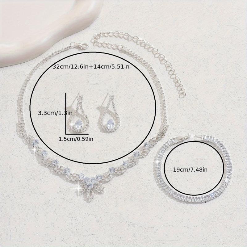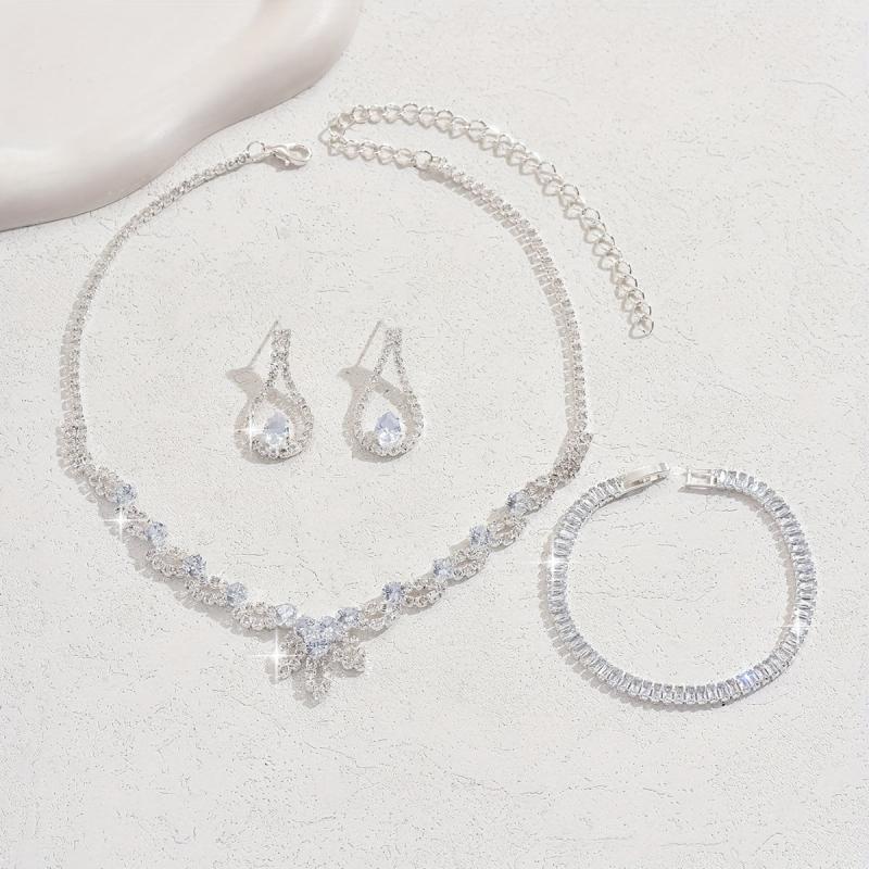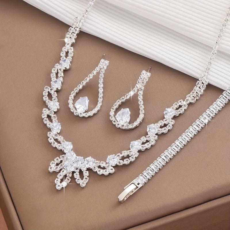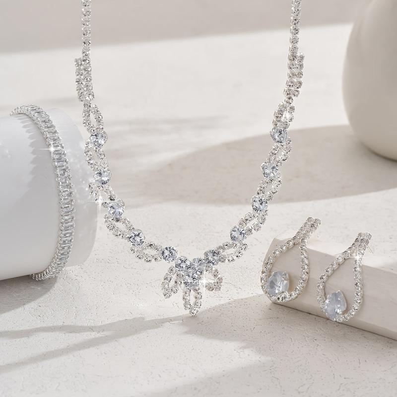 Complete your festive look with this three-piece silver jewelry set featuring rhinestone inlay. The set includes a necklace, earrings, and bracelet, all plated with silver for a minimalist style.