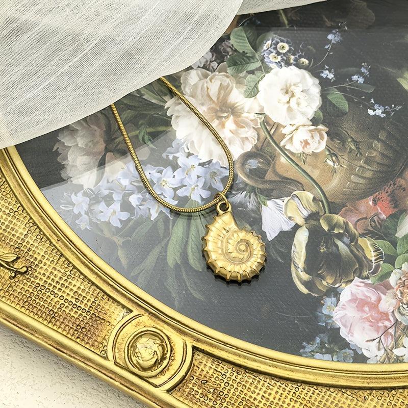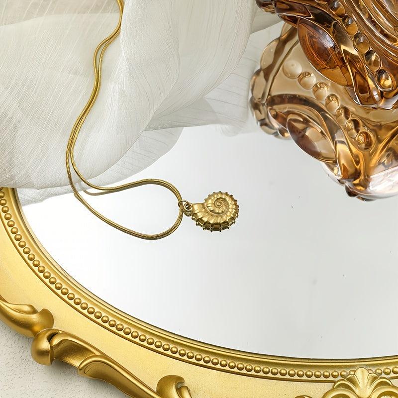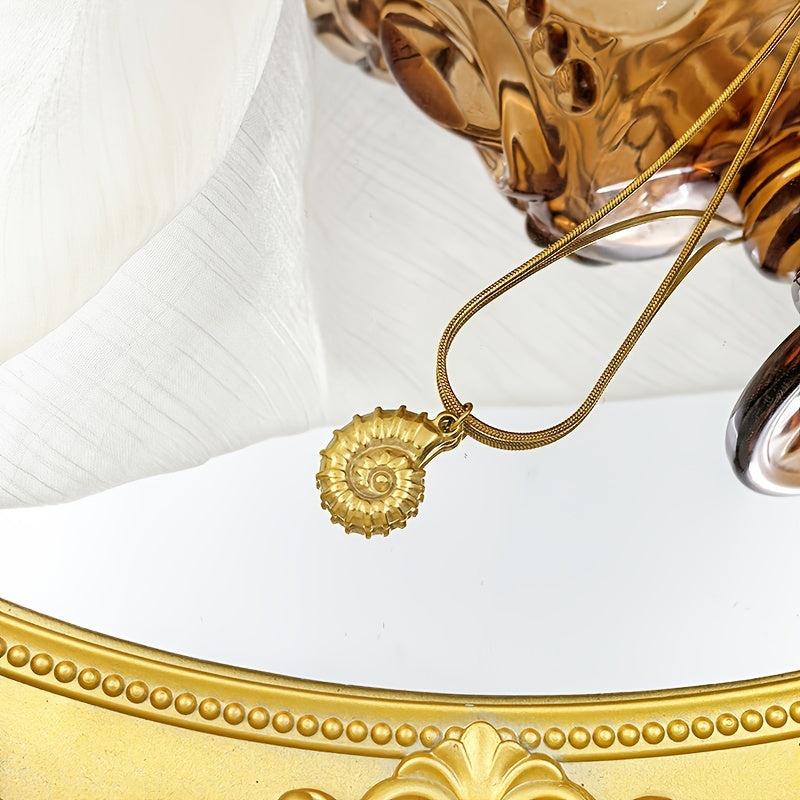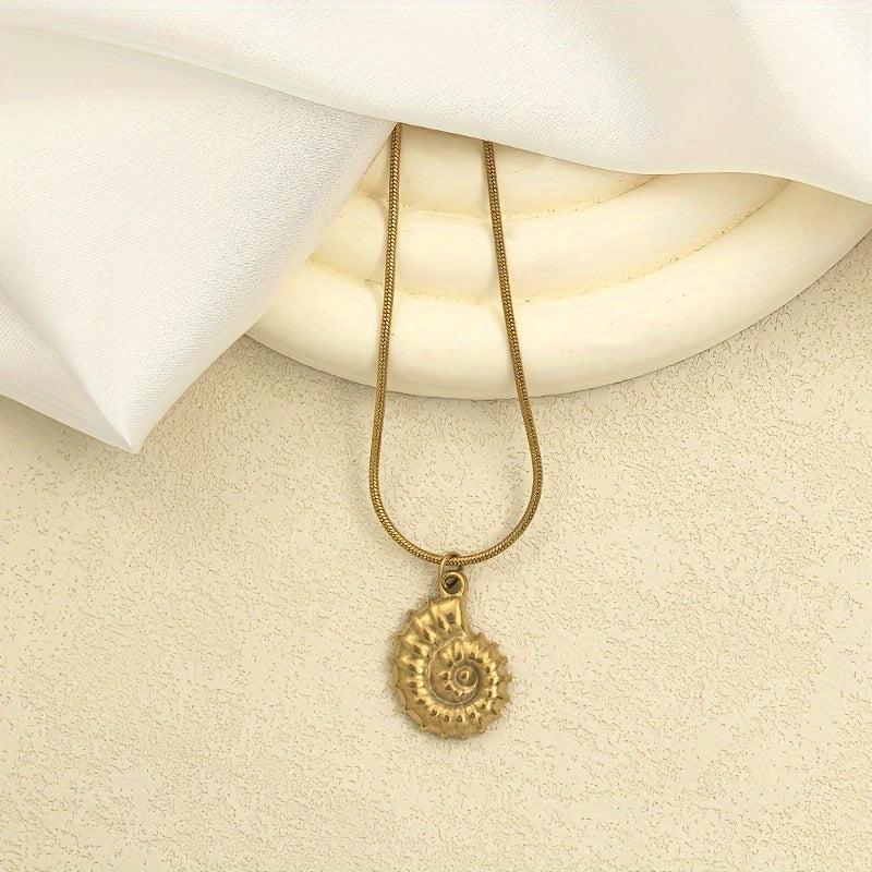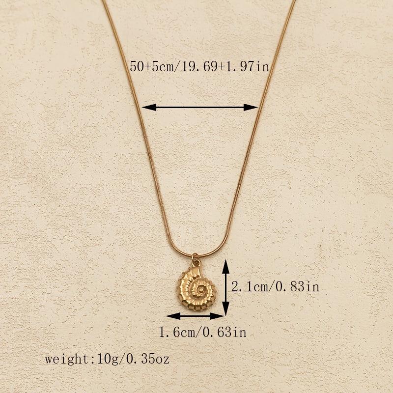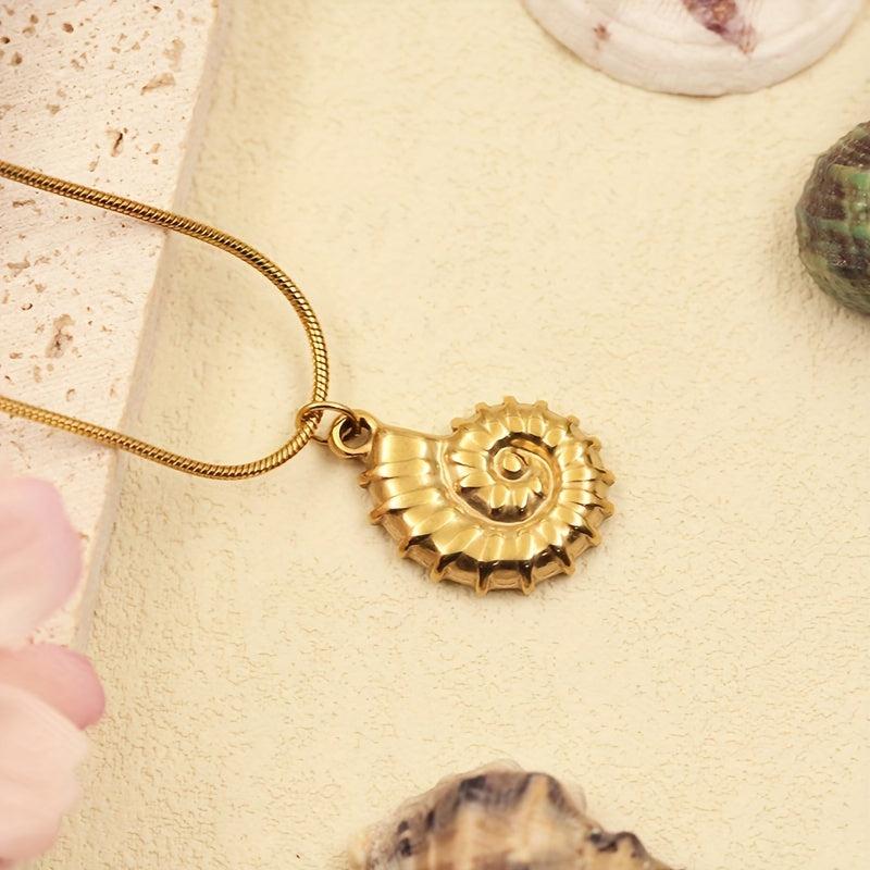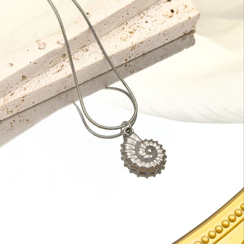 Elevate your beach vacation look with this elegant stainless steel necklace featuring a seashell and snail pendant. The delicate chain adds a touch of sophistication to your outfit.