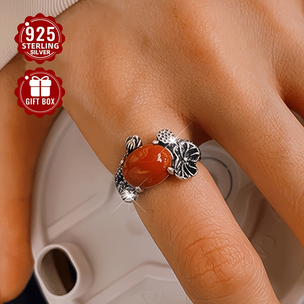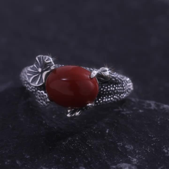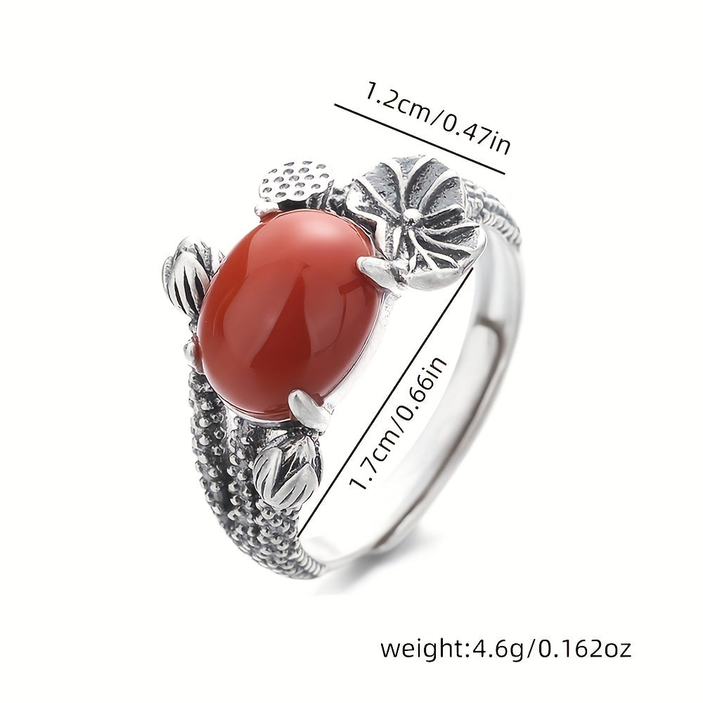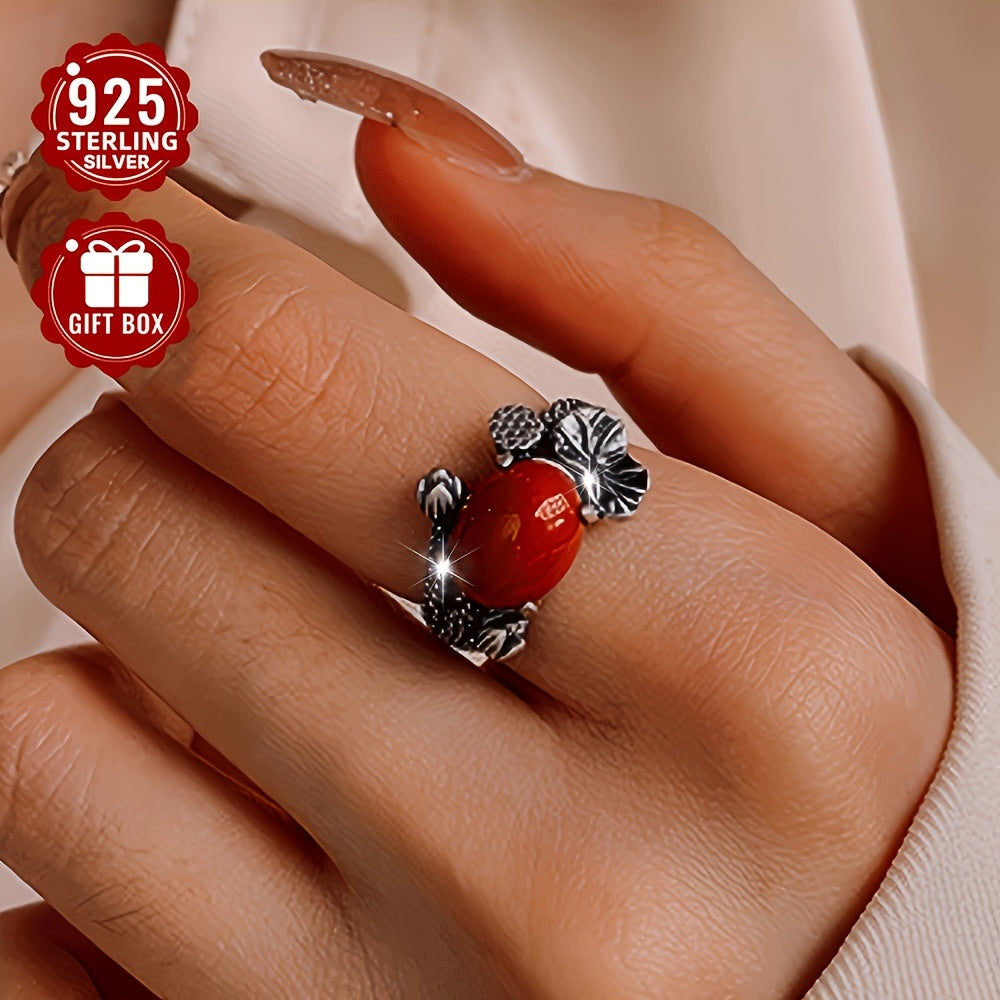 S925 Pure Silver Lotus Leaf Red Agate Inlay Ring Ethnic Style