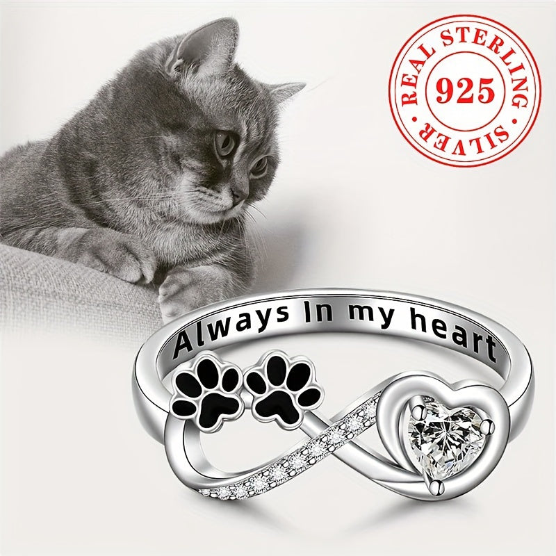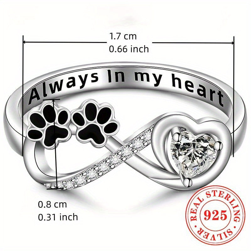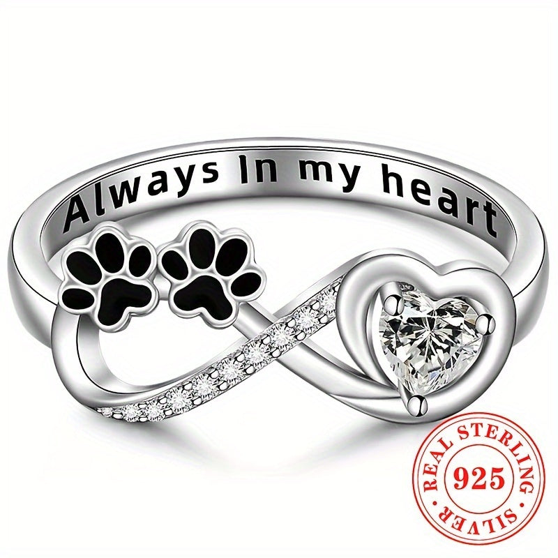 This stunning S925 silver ring features an infinity symbol with a paw print and heart design, adorned with sparkling cubic zirconia. Perfect for daily wear and special occasions, this ring is a must-have accessory.