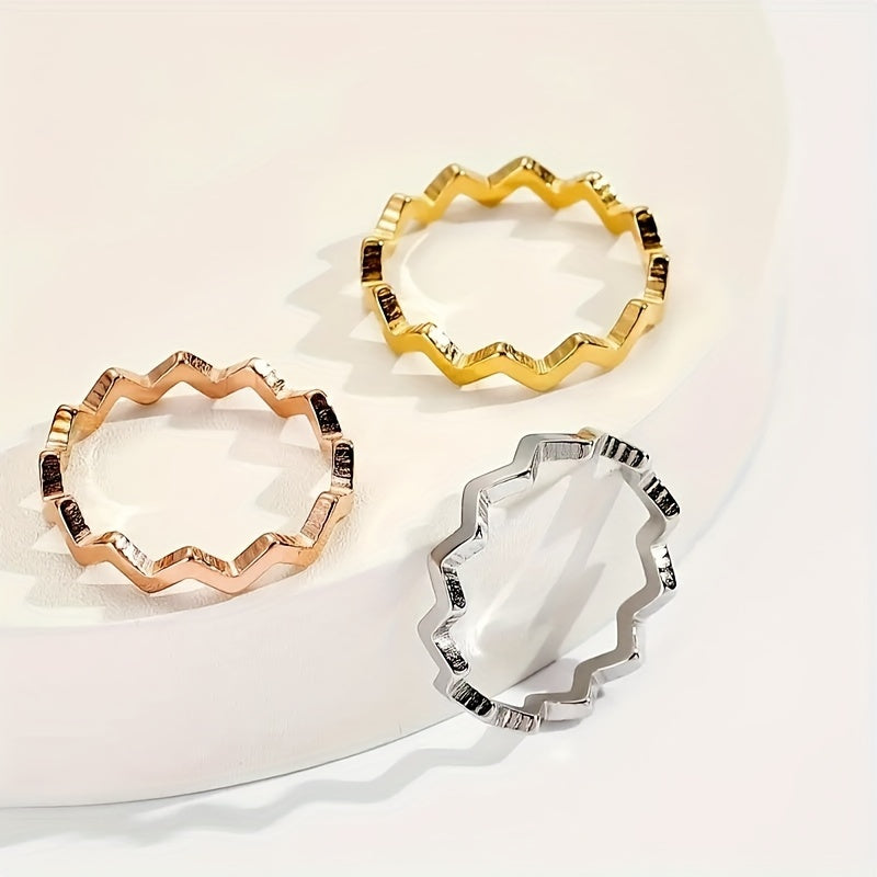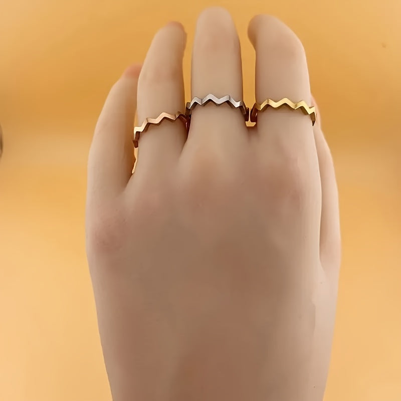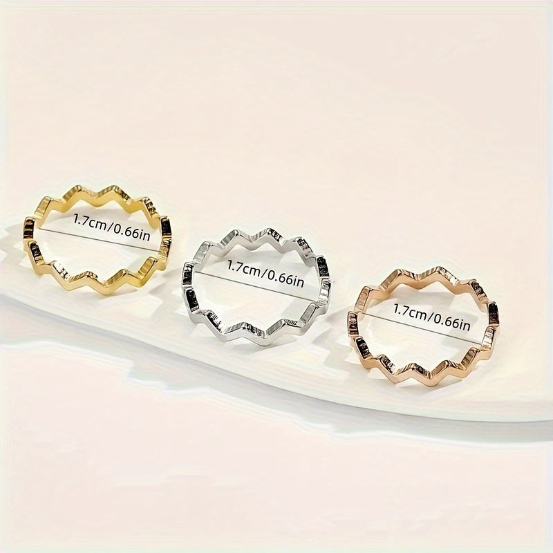 This set includes 3 stylish stainless steel stackable wave rings that are perfect for daily wear. Mix and match them to create your own unique look!