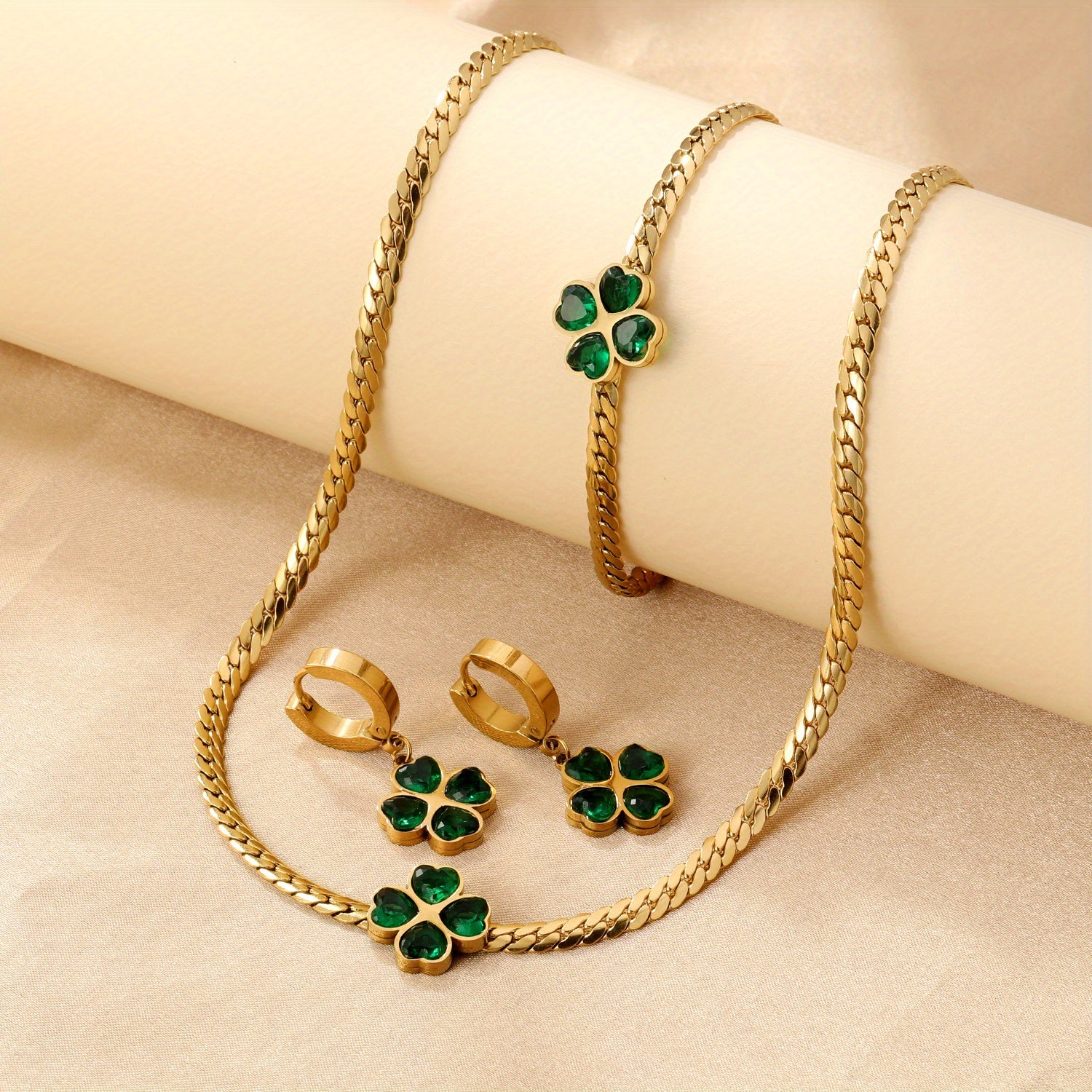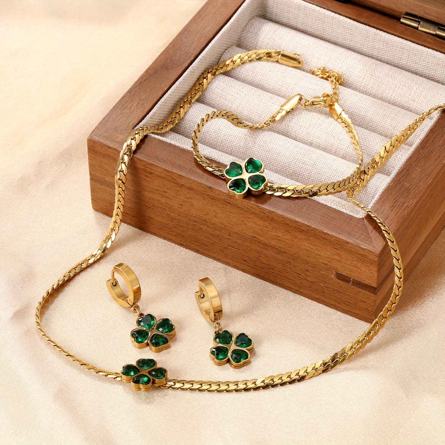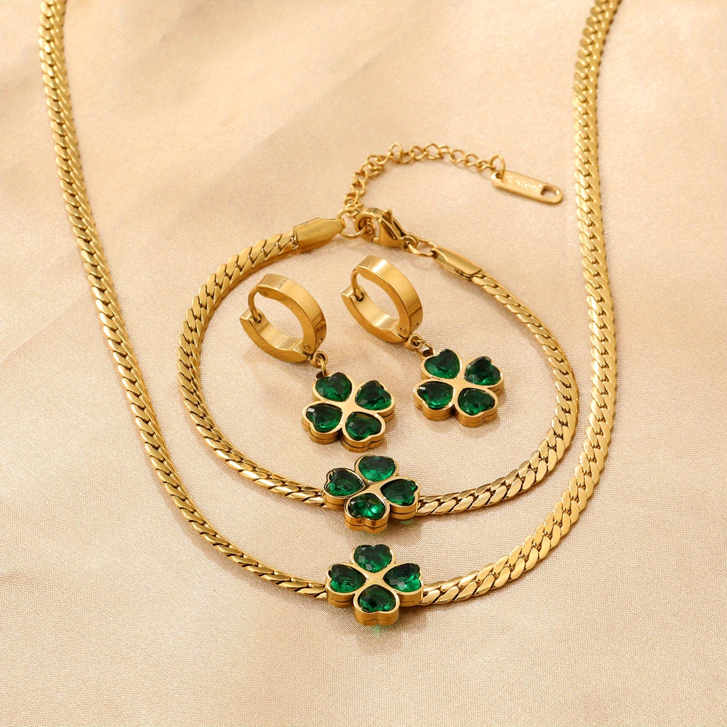 Elegant and high-quality stainless steel necklace, bracelet, and earrings set featuring a beautiful created emerald clover pendant. Perfect for adding a touch of sophistication to any outfit.