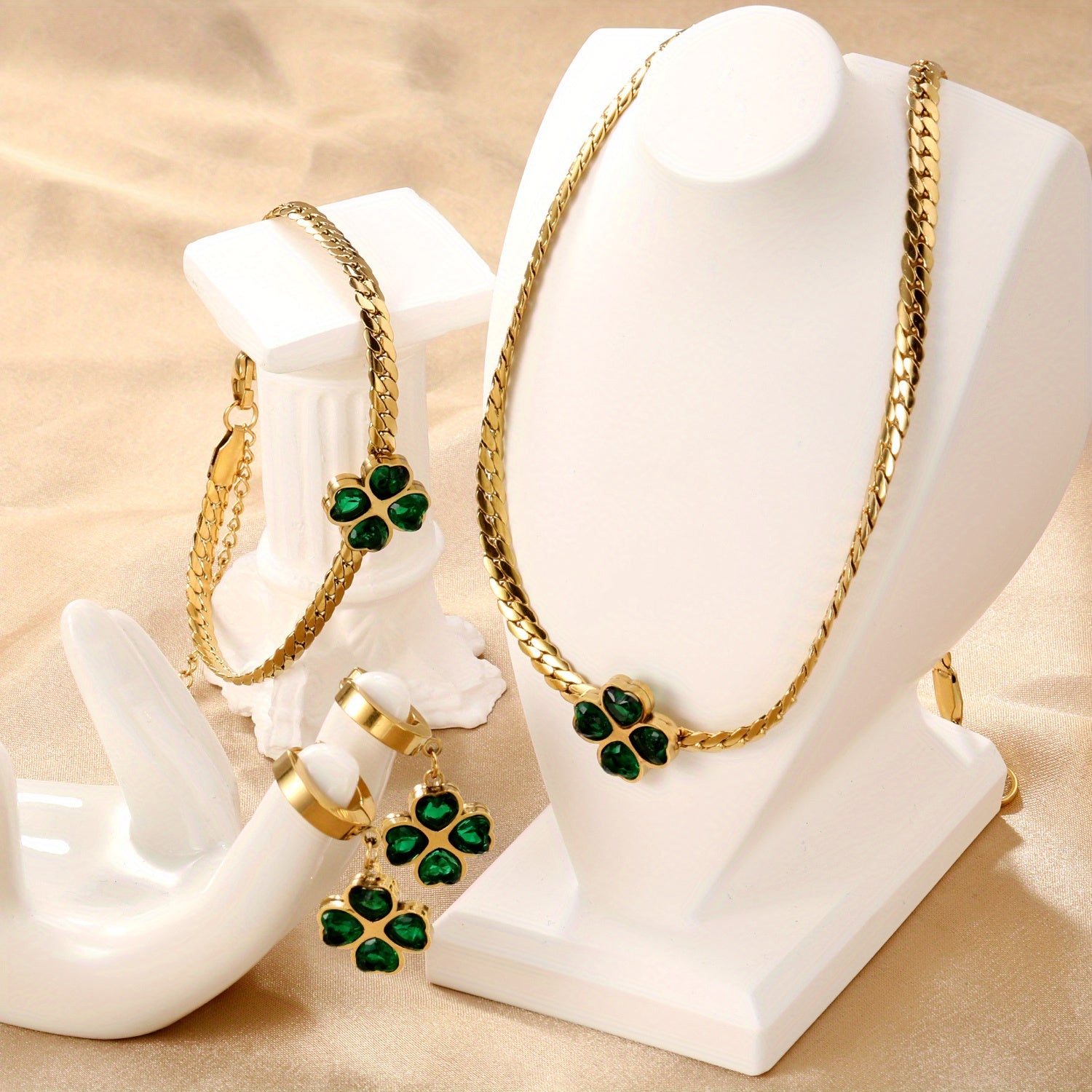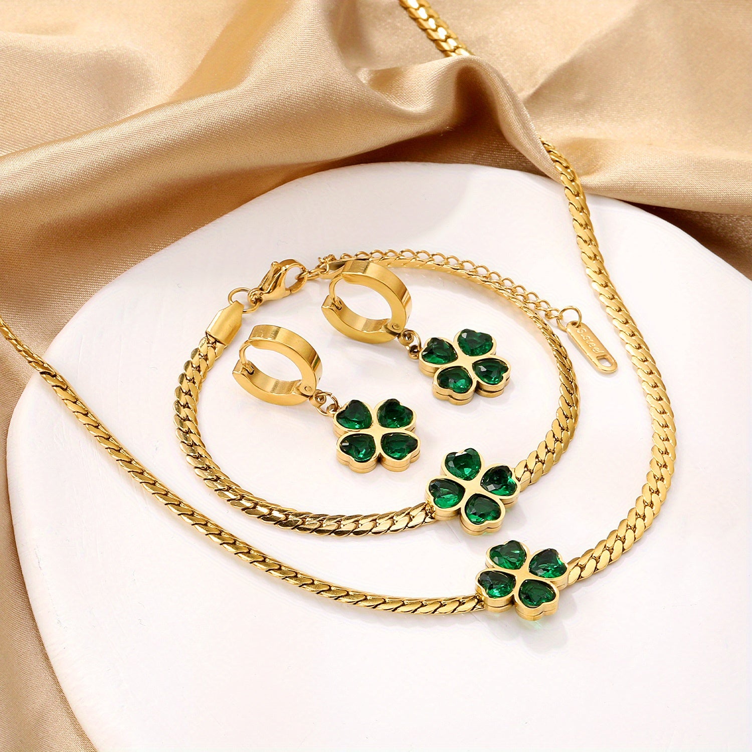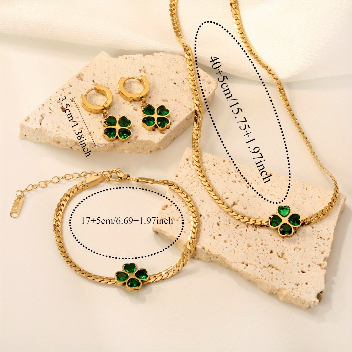 Elegant and high-quality stainless steel necklace, bracelet, and earrings set featuring a beautiful created emerald clover pendant. Perfect for adding a touch of sophistication to any outfit.