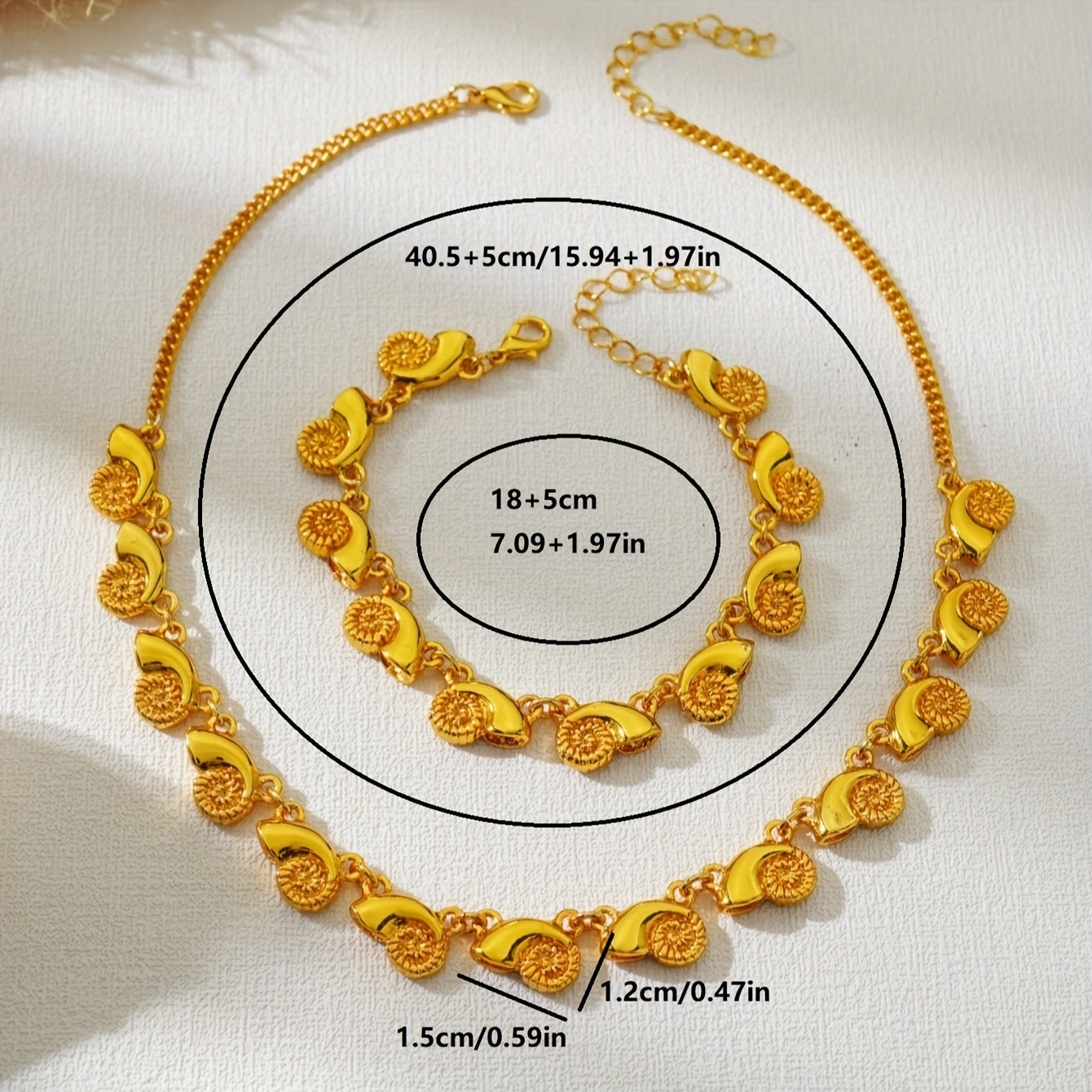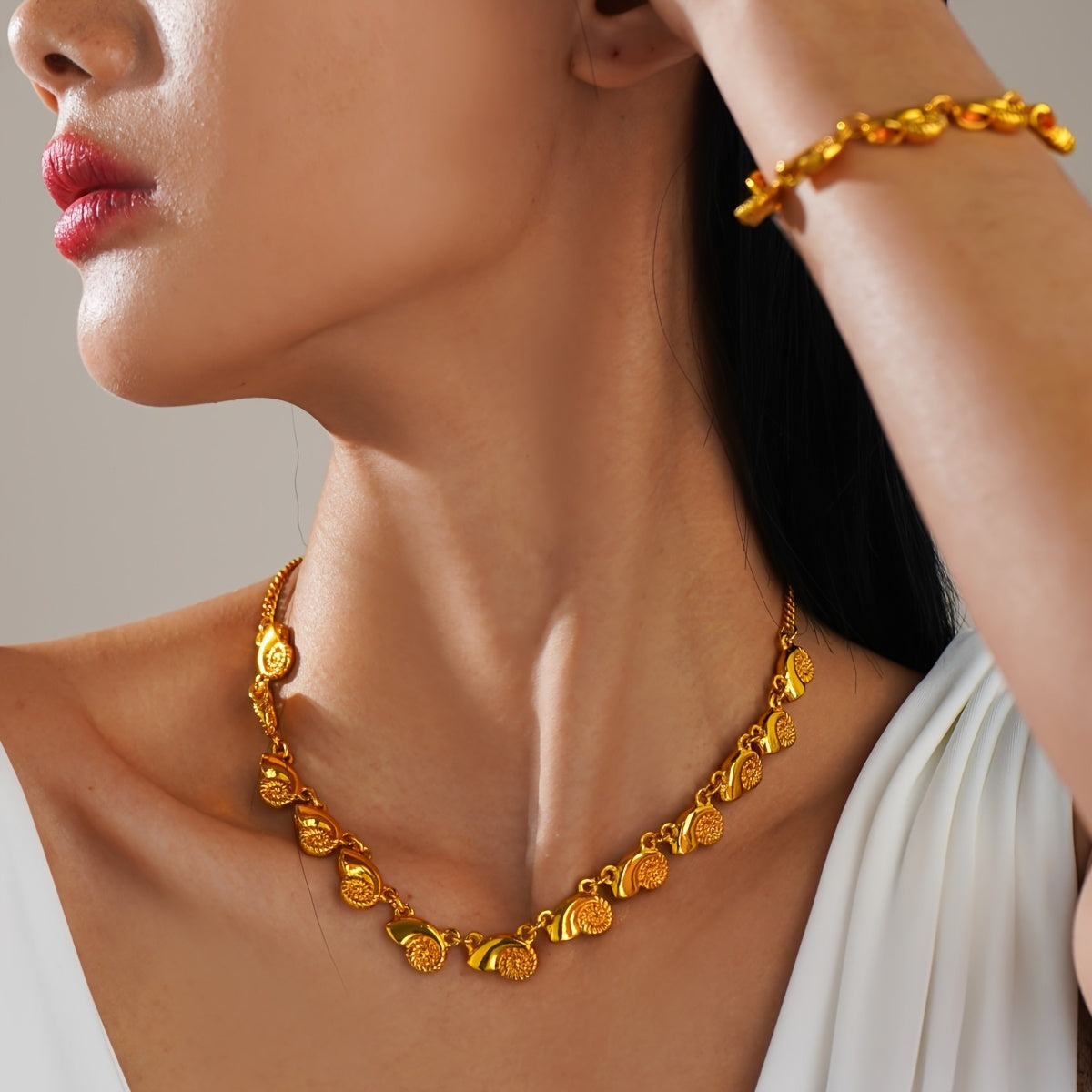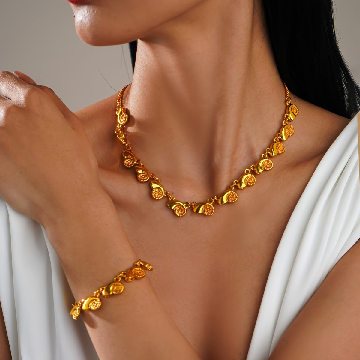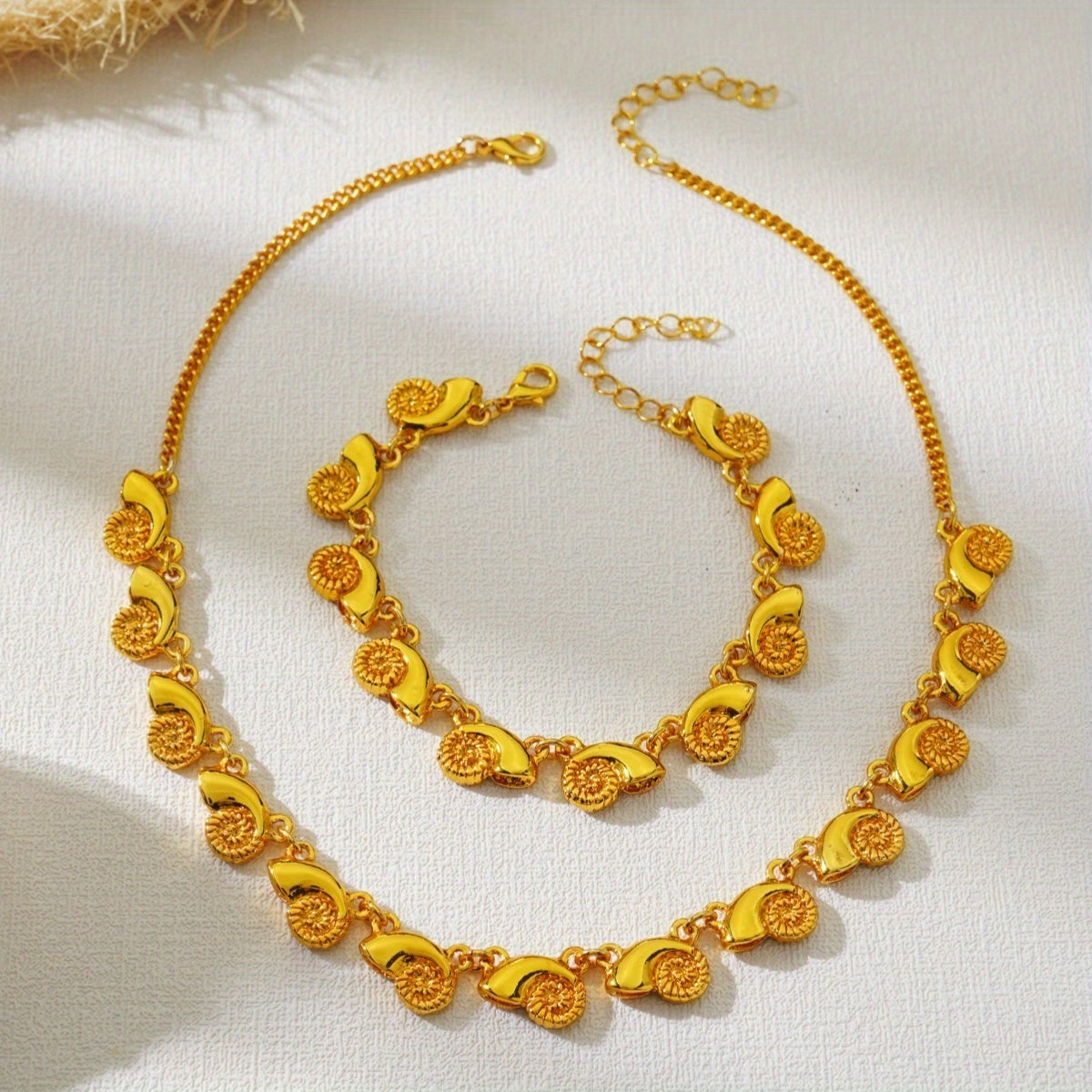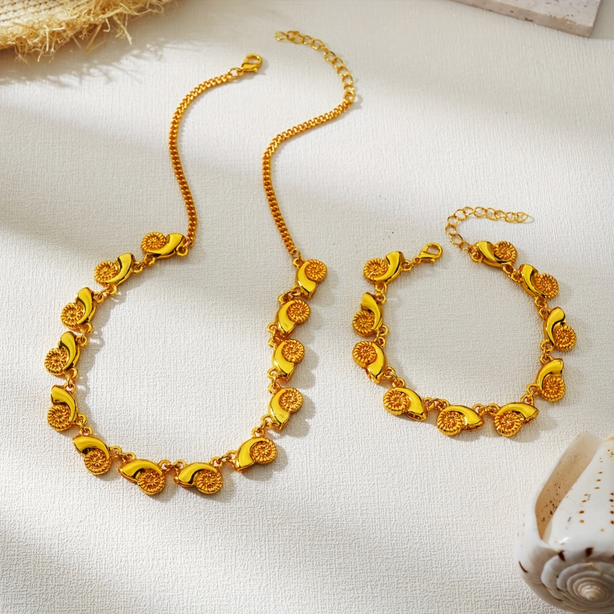 Fashionable two piece women's jewelry set featuring metal seashell shape necklace and bracelet. Create multiple combination arrangements with this connected set.