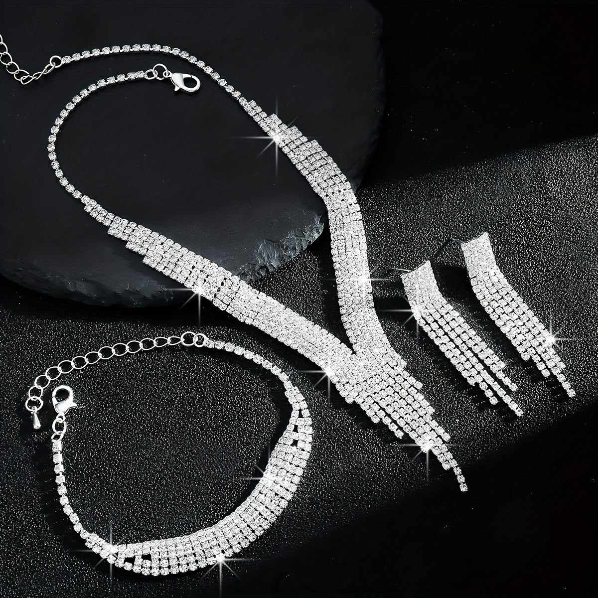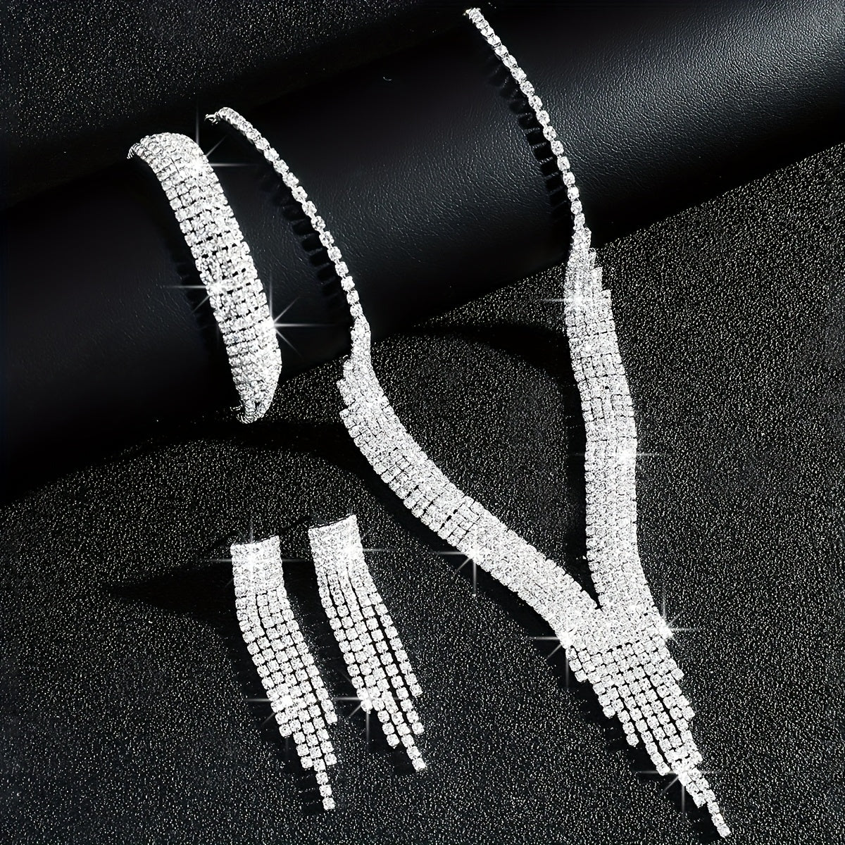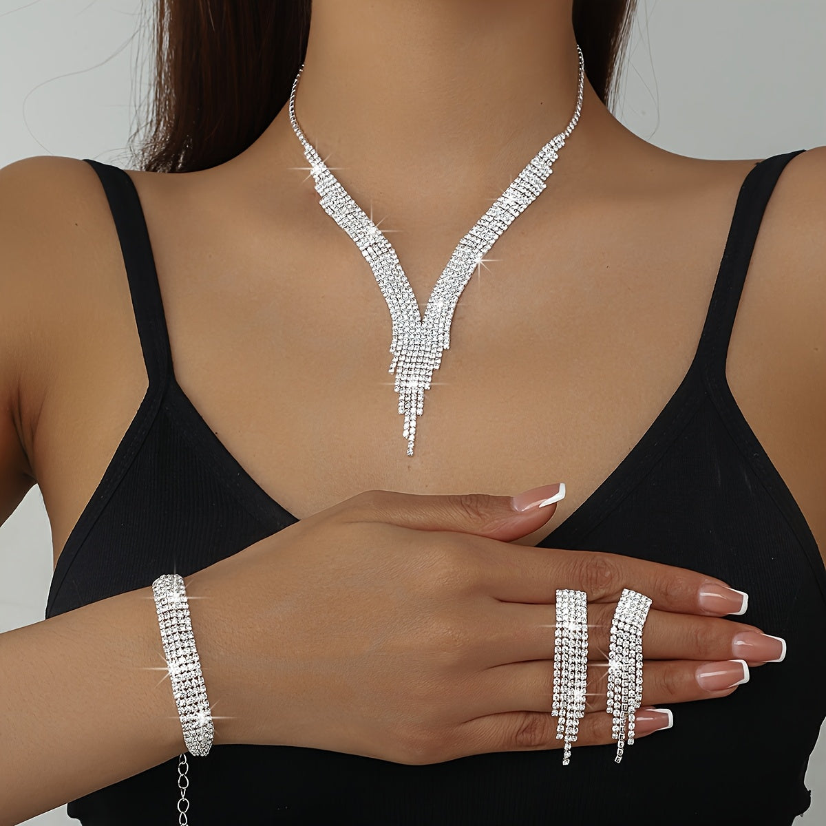 Sparkling rhinestone jewelry set with tassel design, perfect for music festivals and Mardi Gras. Copper plated in golden color.