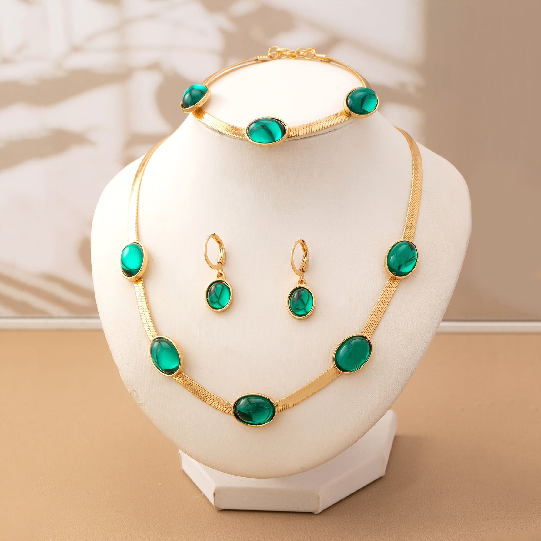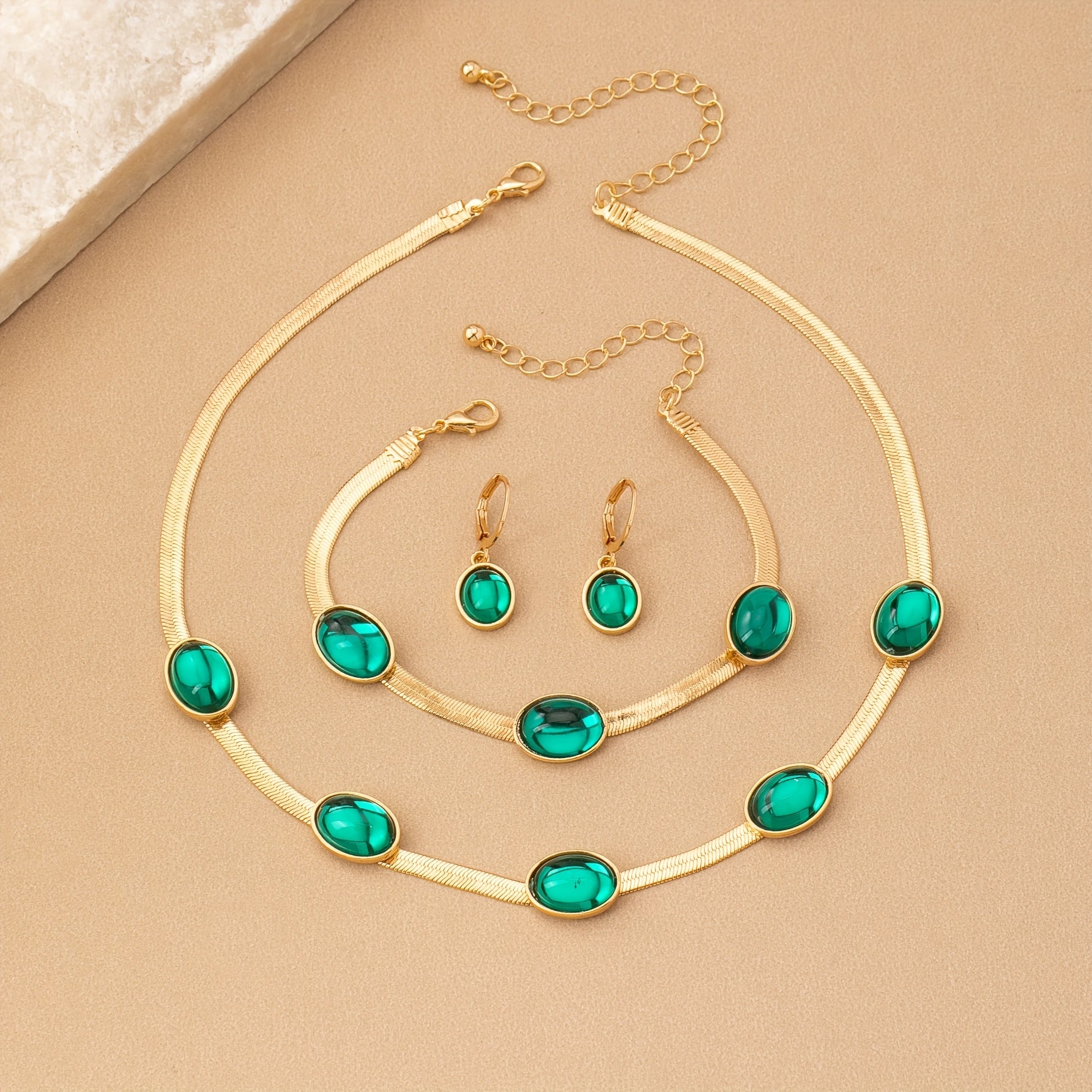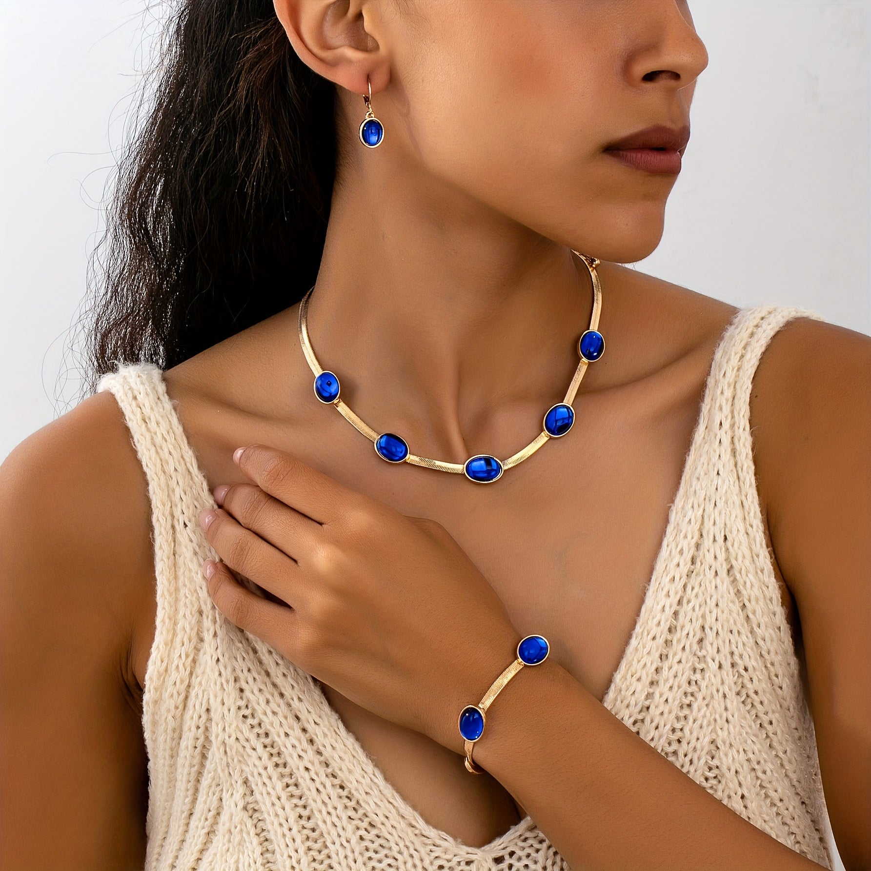 Complete your look with this vintage bohemian style jewelry set featuring an oval pendant necklace, bracelet, and earrings. Perfect for daily wear.