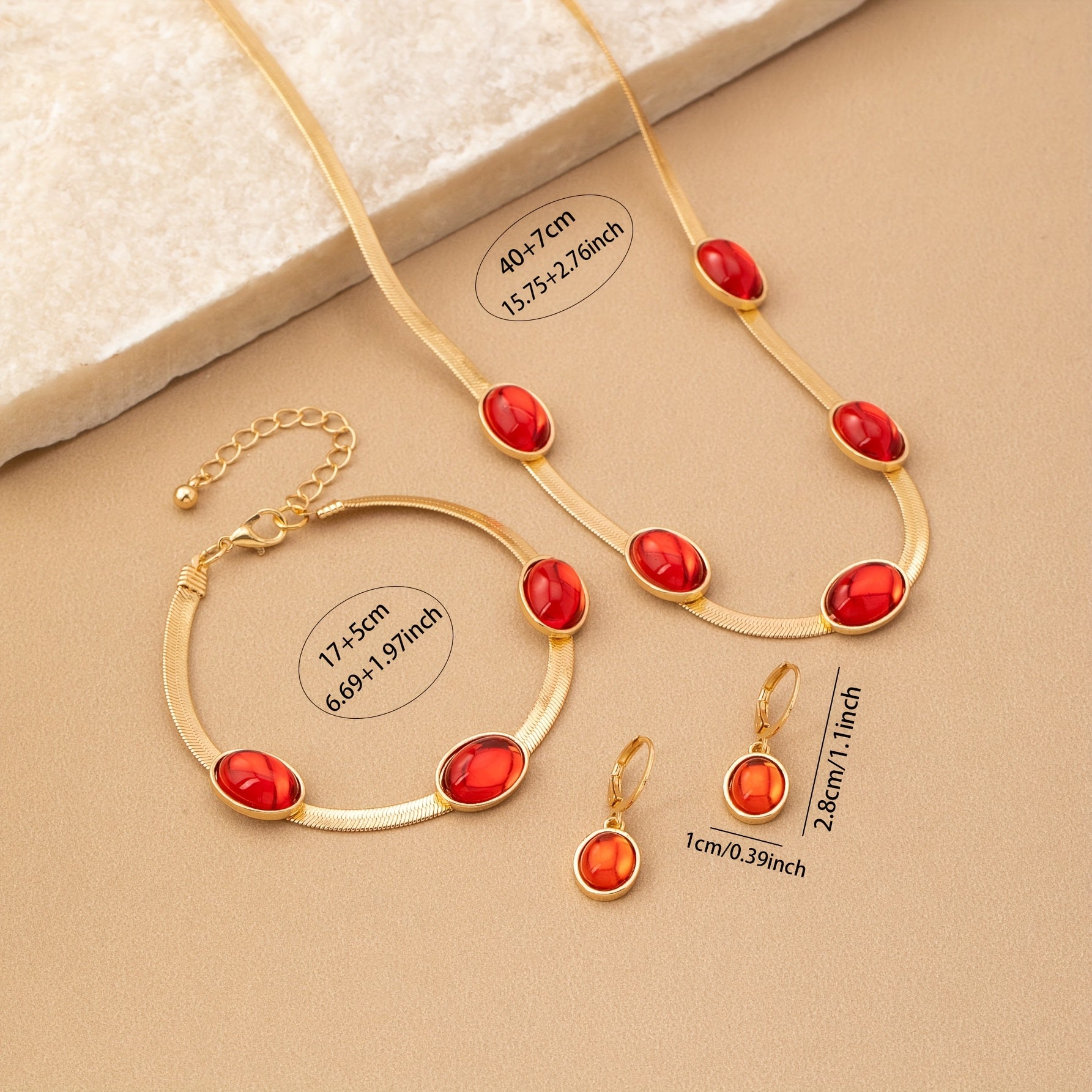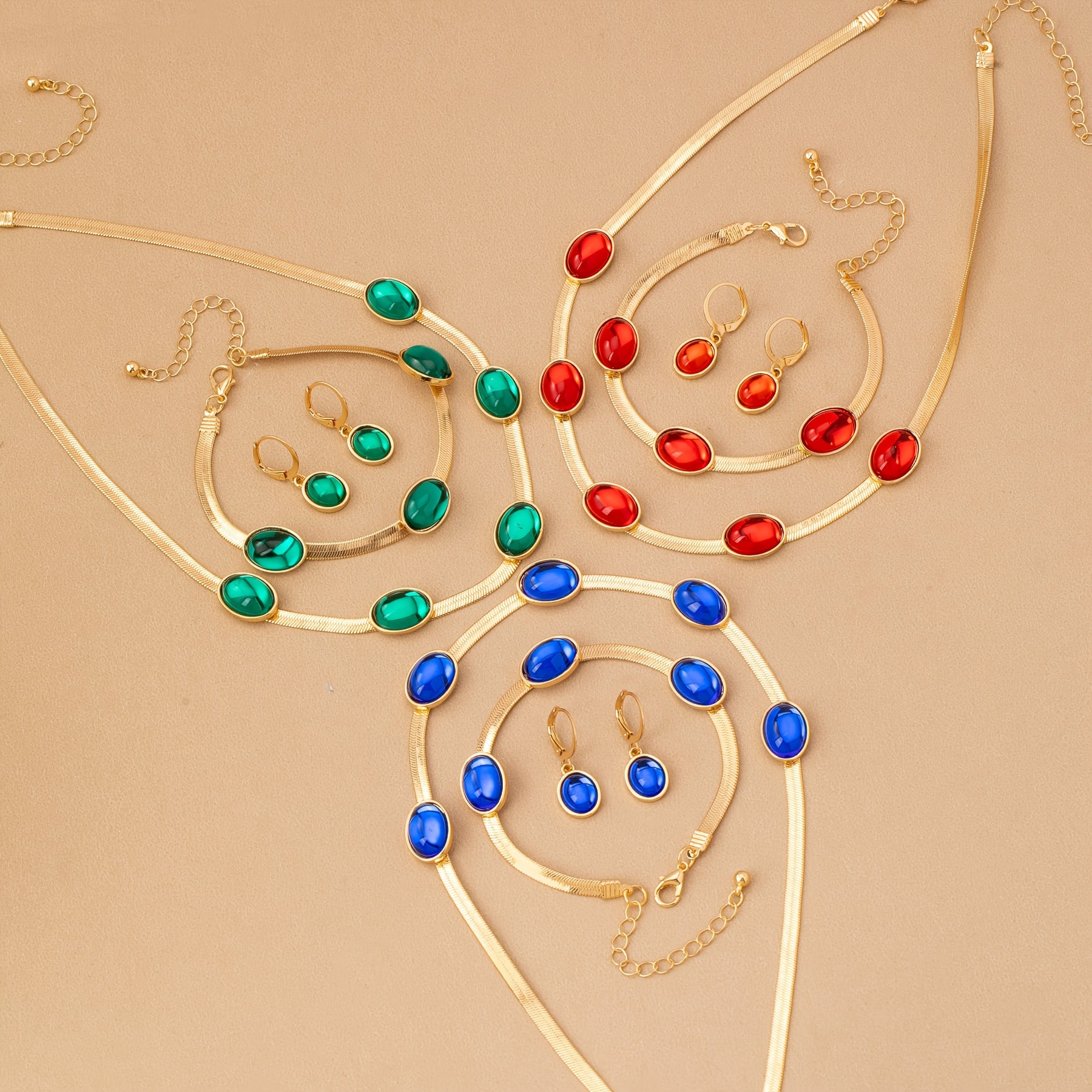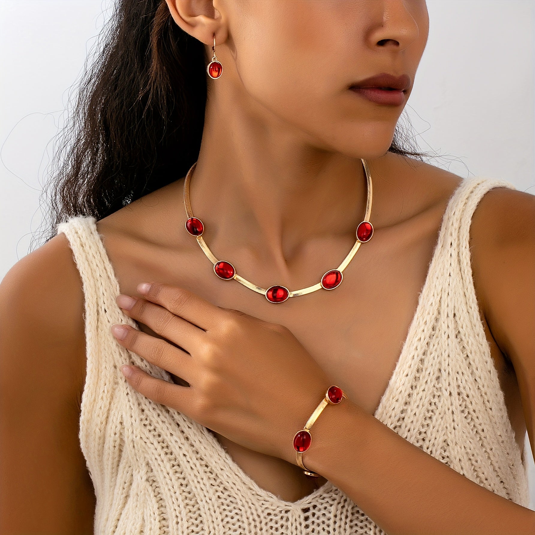 Complete your look with this vintage bohemian style jewelry set featuring an oval pendant necklace, bracelet, and earrings. Perfect for daily wear.
