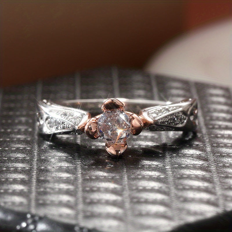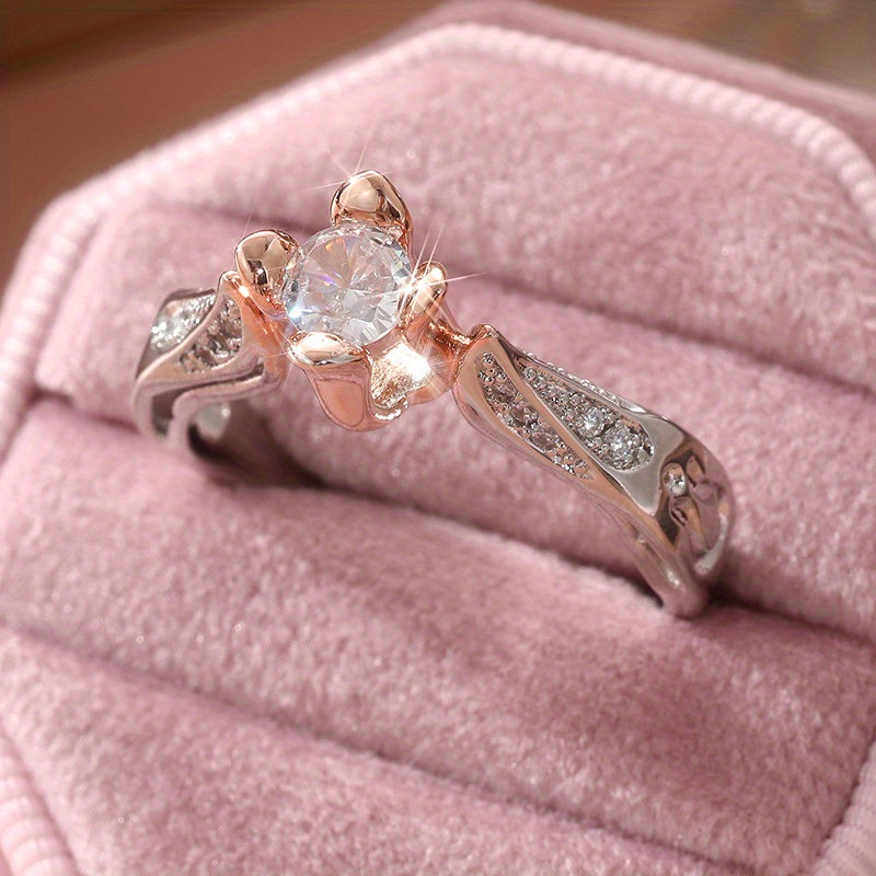 Elegant rose ring featuring a rose flower design with sparkling cubic zirconia. Made of silvery plated copper, this ring is perfect for daily wear and gifting.