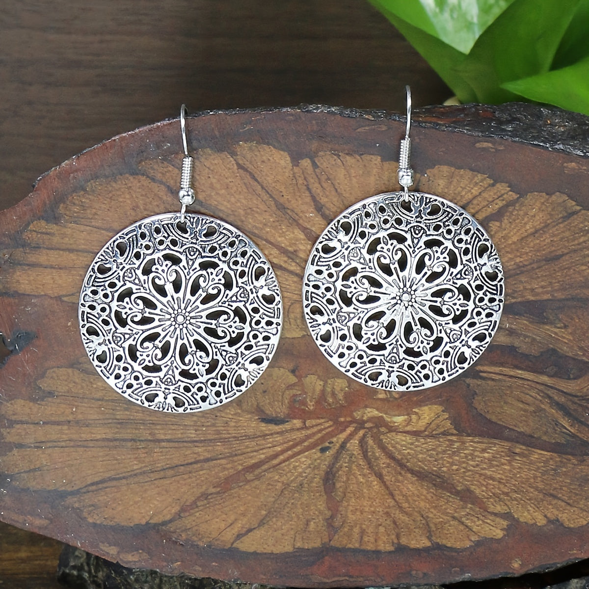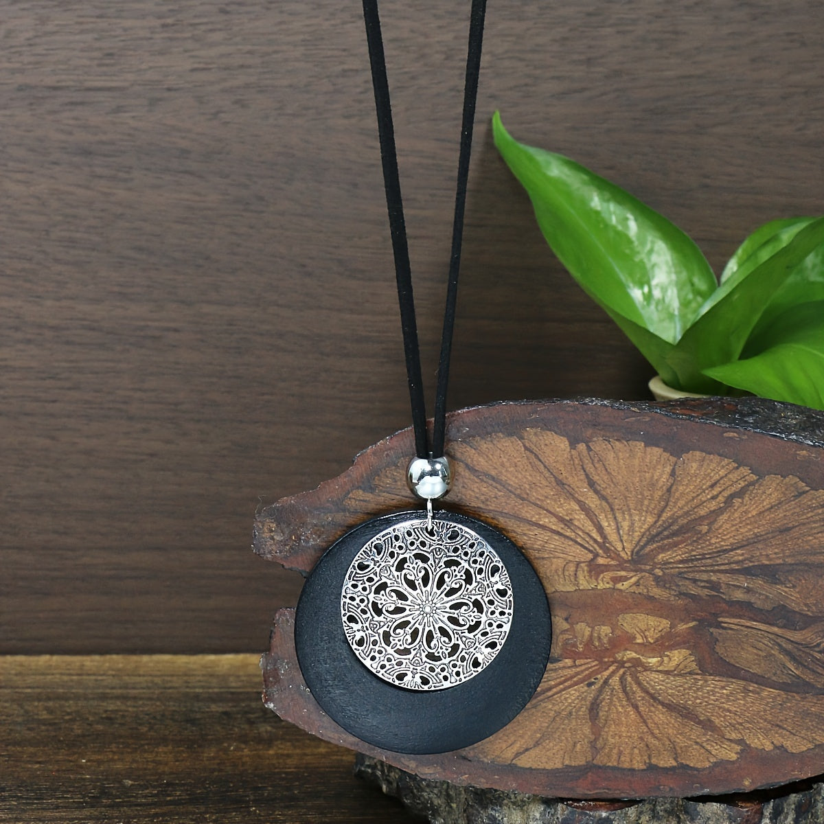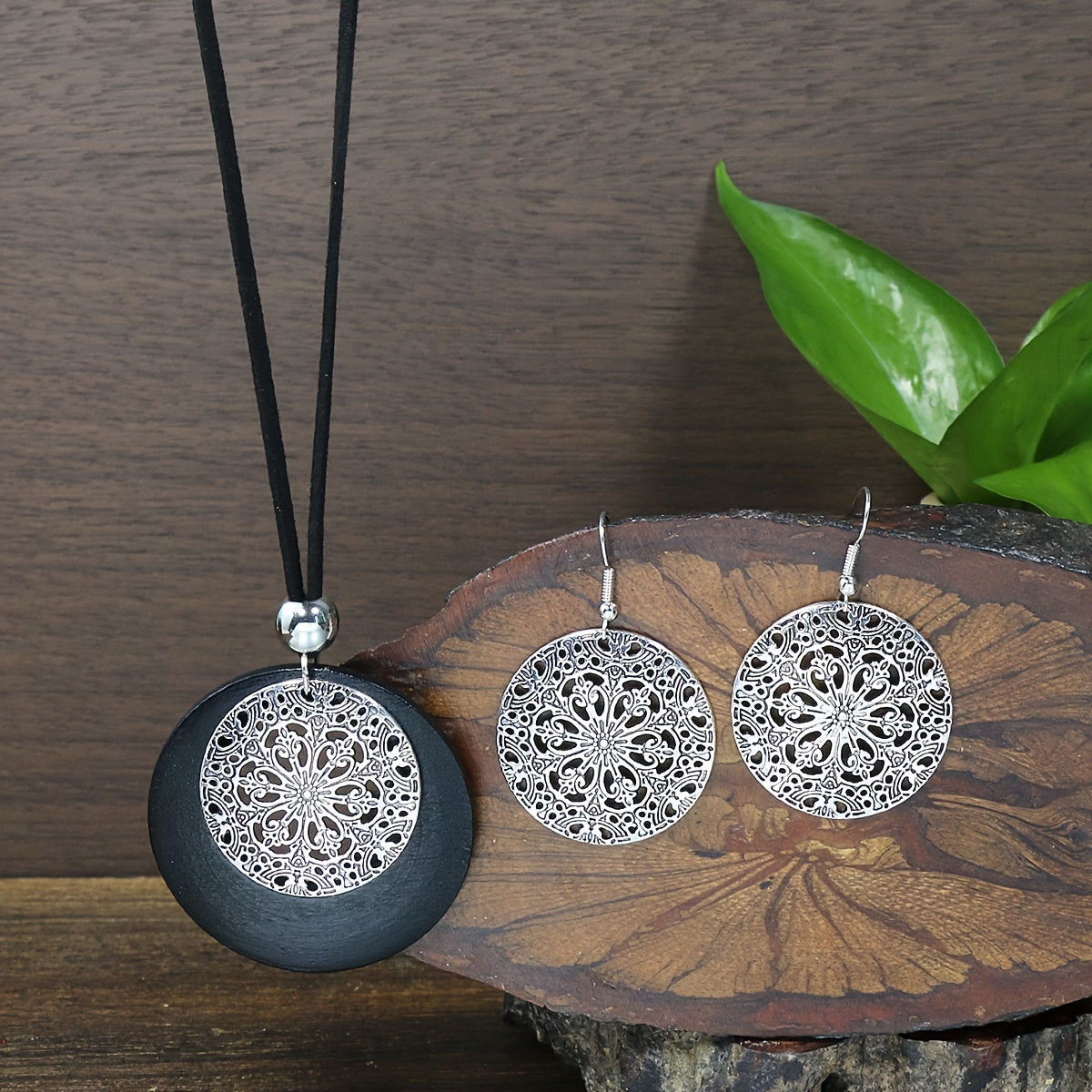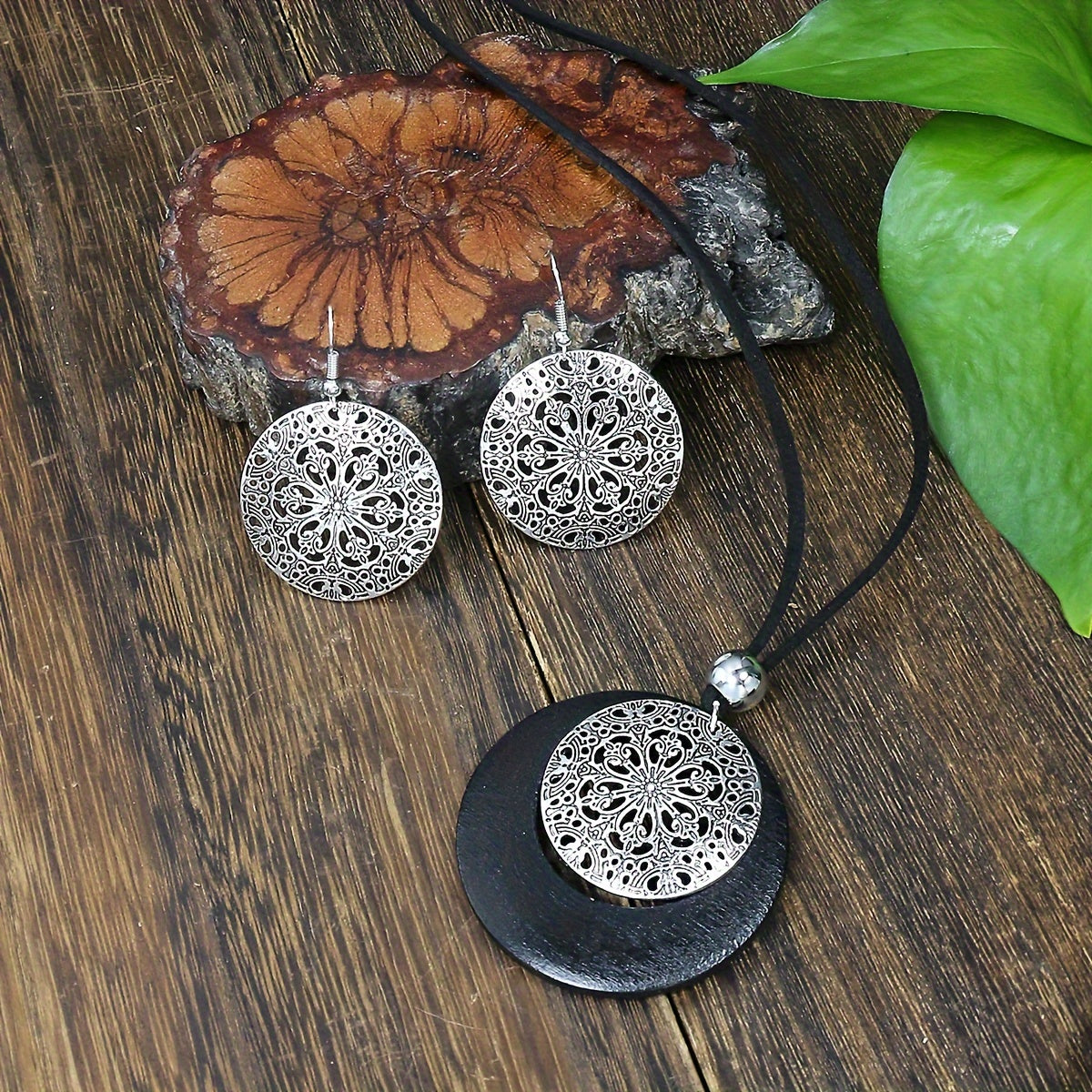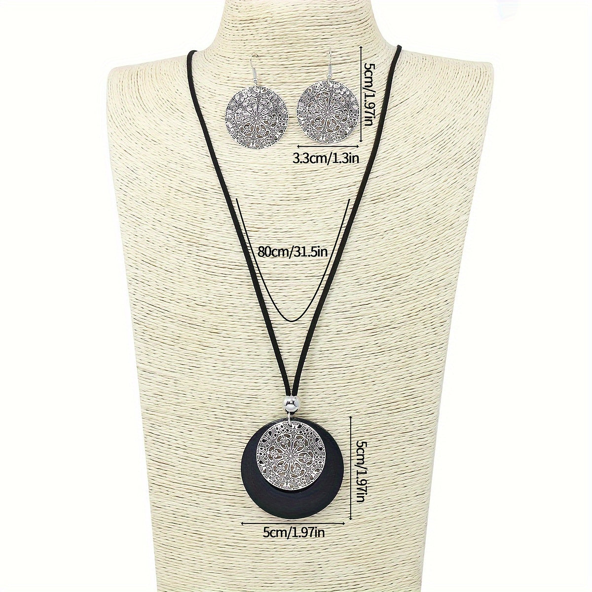 This set includes a pair of round hollow zinc alloy earrings, wooden round hoops, and a double layer pendant long necklace. Add a touch of vintage charm to your outfit with these unique pieces of ethnic jewelry.