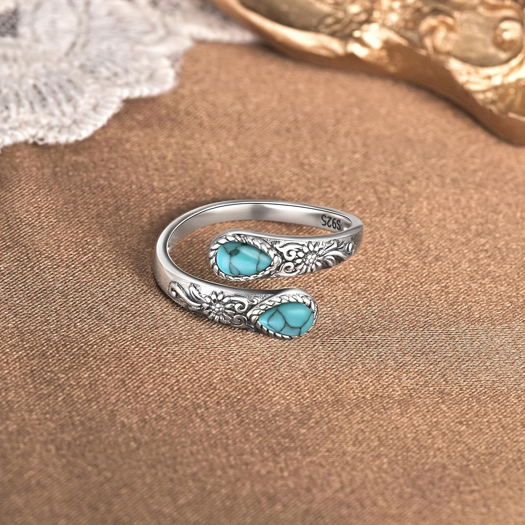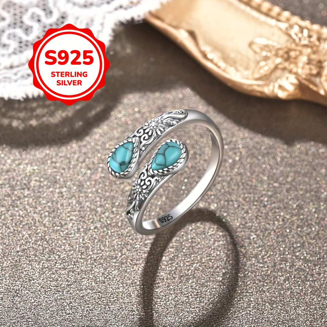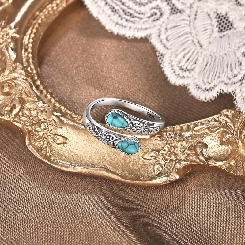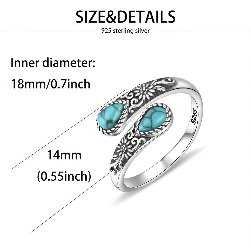 Elegant and delicate daisy ring crafted from S925 silver and adorned with two teardrop-shaped turquoise stones. This adjustable open ring exudes vintage charm and is perfect for everyday wear.