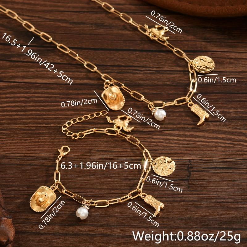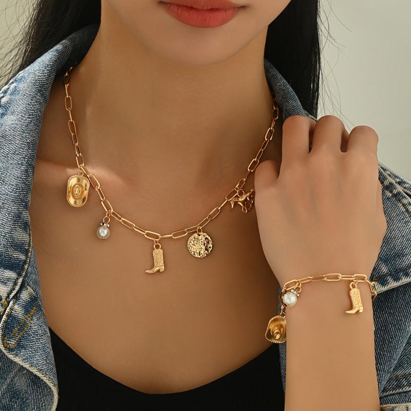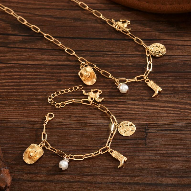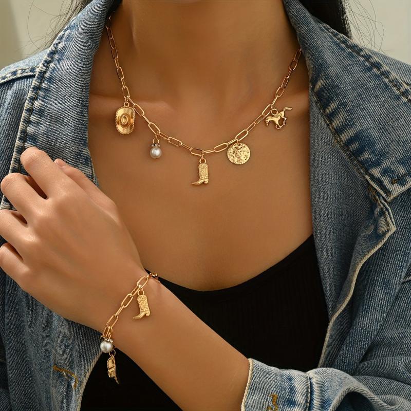 Complete your cowboy look with this vintage Western ethnic jewelry set featuring a necklace and bracelet. The set includes a cowboy hat boots pendant on an irregular chain.