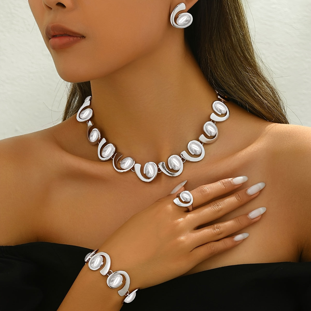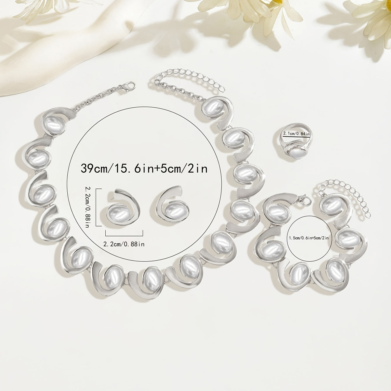Elegant 4-piece jewelry set featuring a classic silvery 3D geometric spiral arrangement design with acrylic inlay. Perfect for parties or as a gift for family and friends.