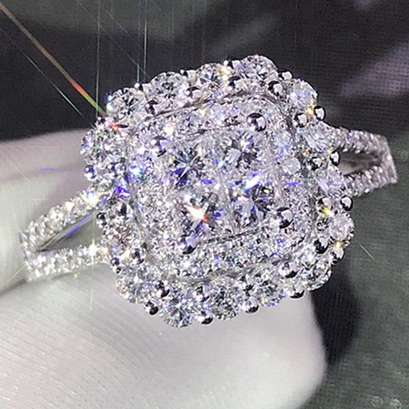 This delicate wedding ring set features synthetic zirconia stones set in 925 silver plated copper. Perfect for all seasons and as a gift. April birthstone design with a holiday theme.