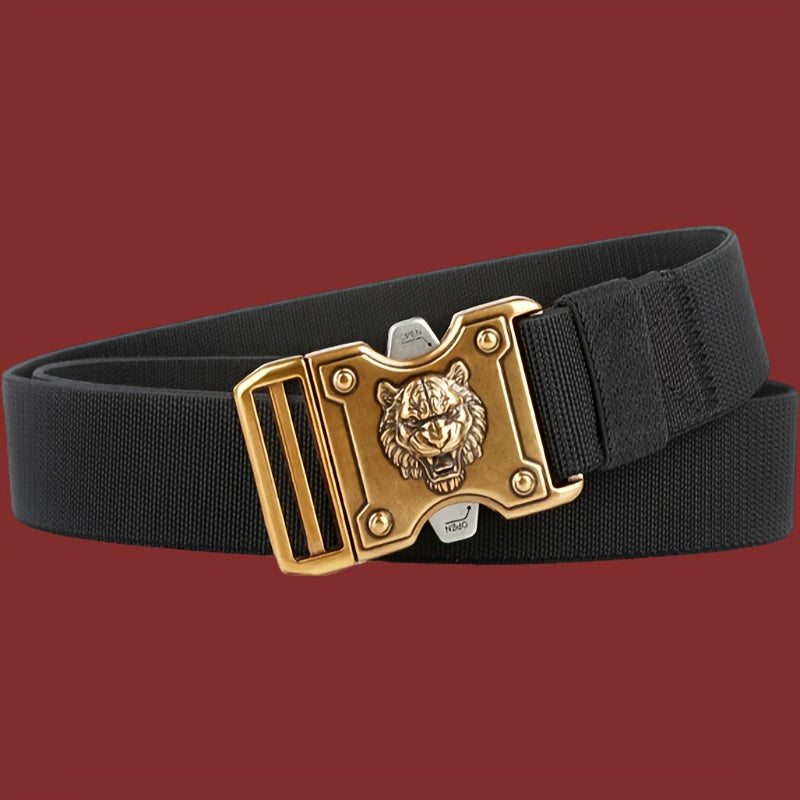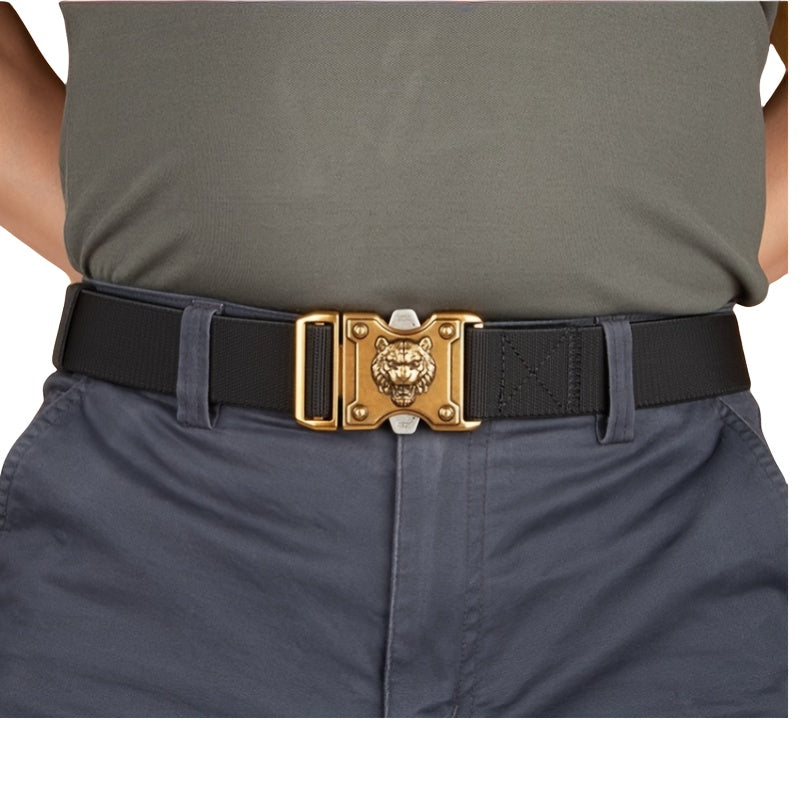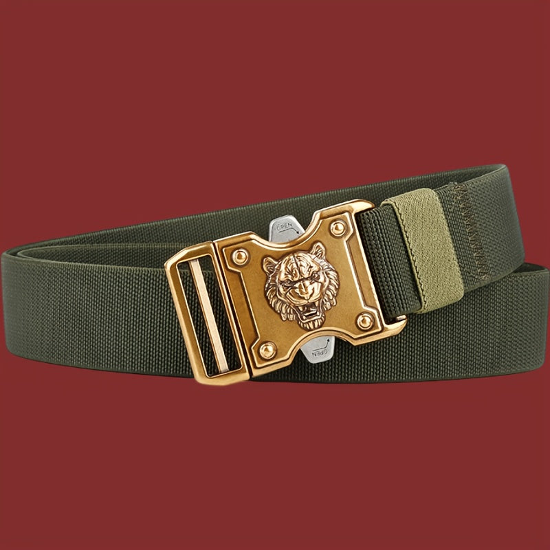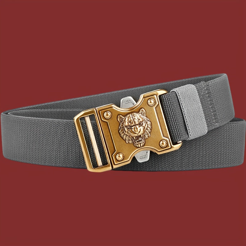 Durable stretchy waistband made of polyester fiber with golden alloy buckle. Ideal for outdoor wear and sports activities.