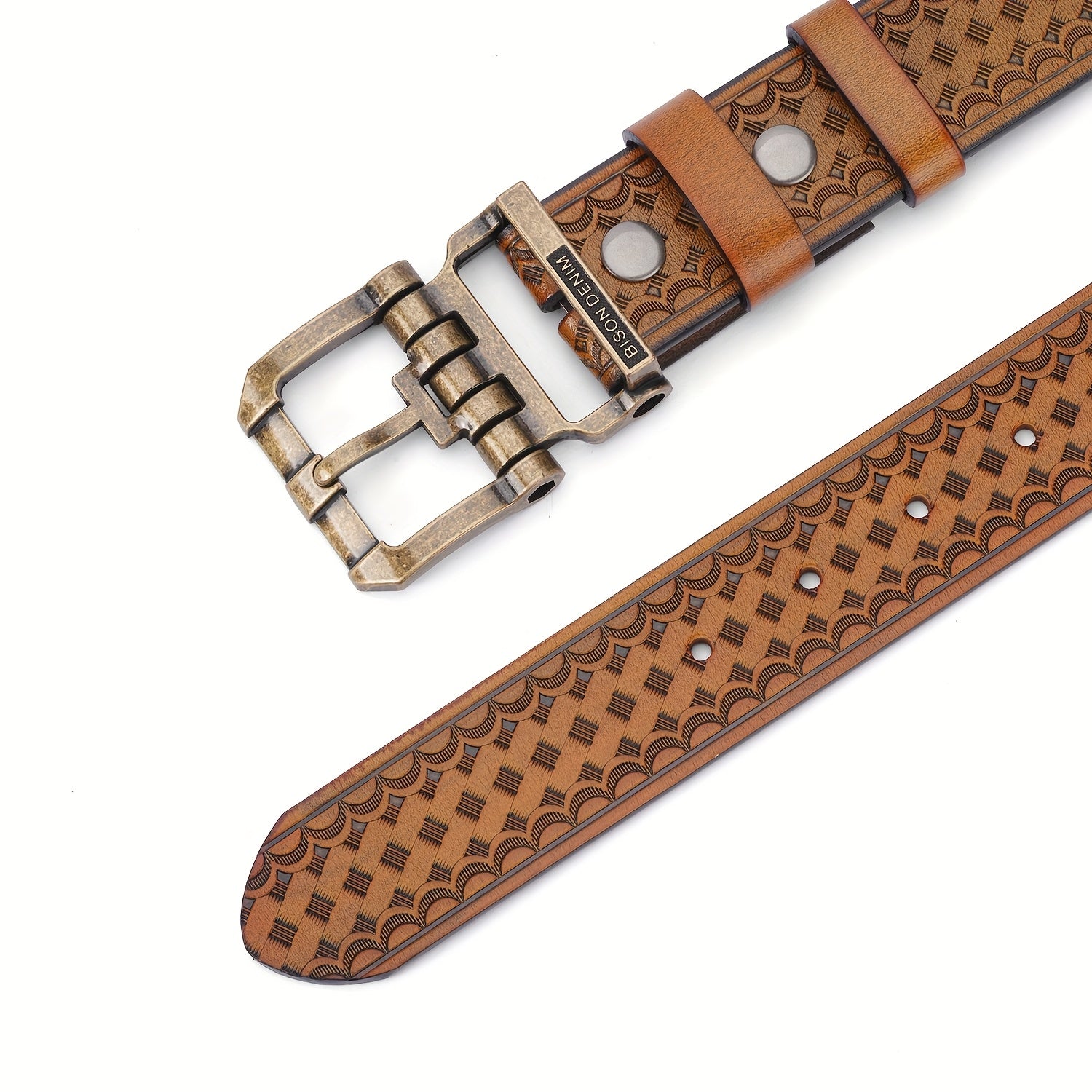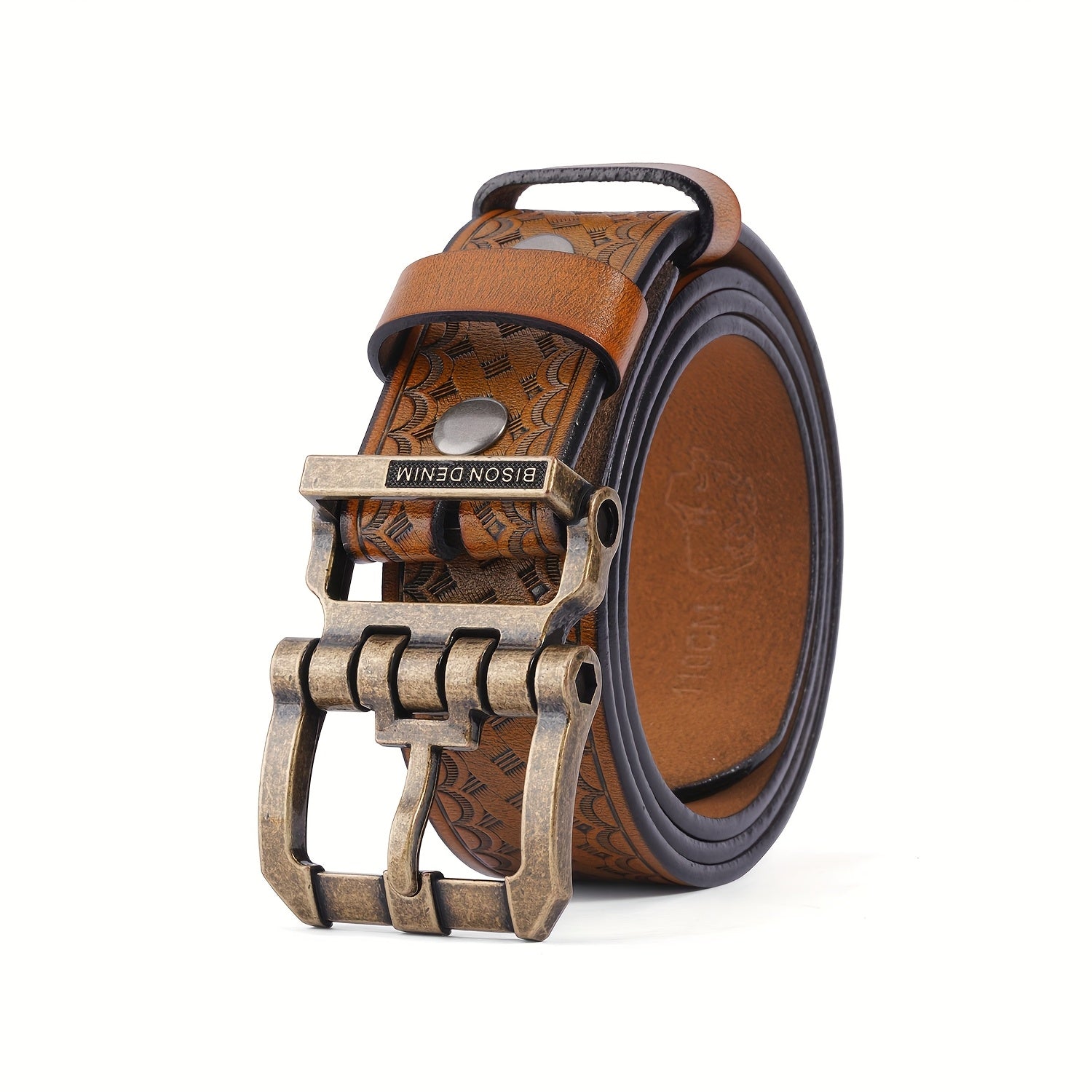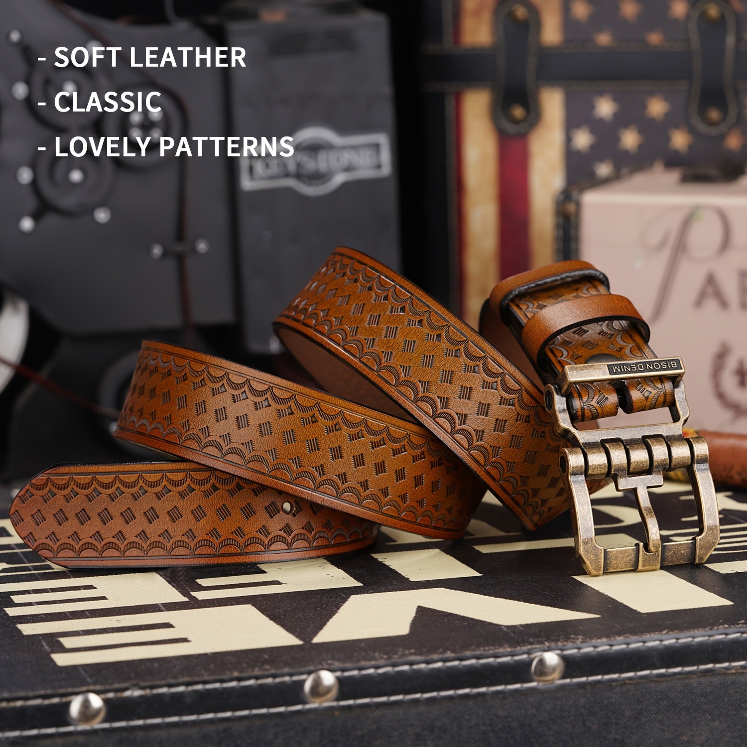 BISON DENIM Men's Vintage Leather Belt Light Brown Embossed Square Buckle