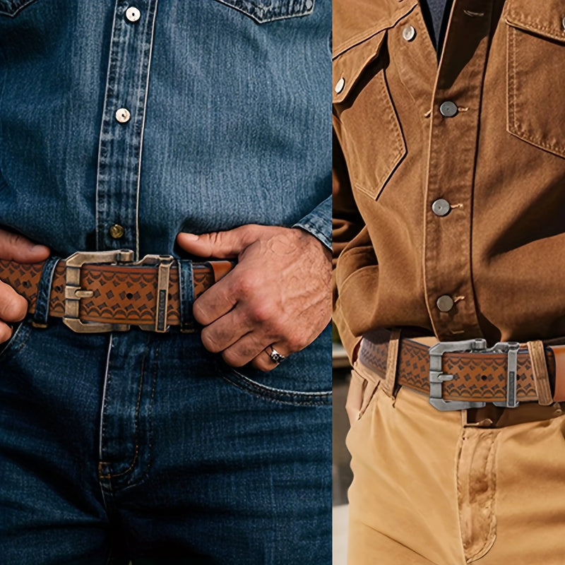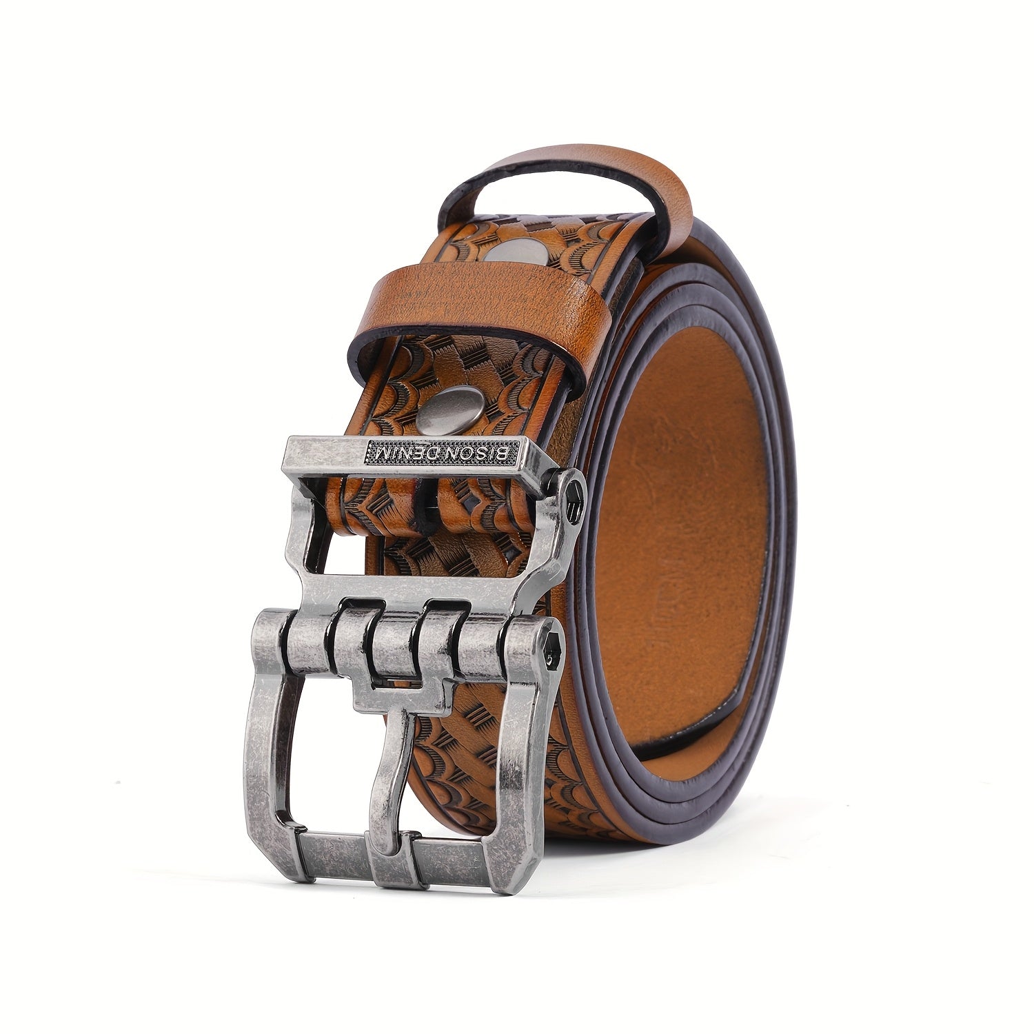 This men's vintage cowhide leather belt in light brown features an embossed fashionable square buckle made of high-quality alloy material. It is versatile for trousers and makes an ideal gift.