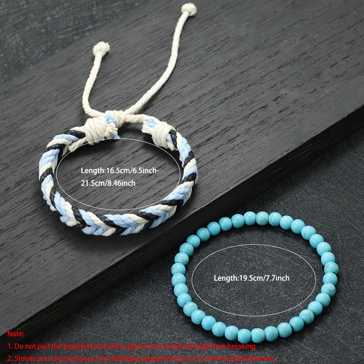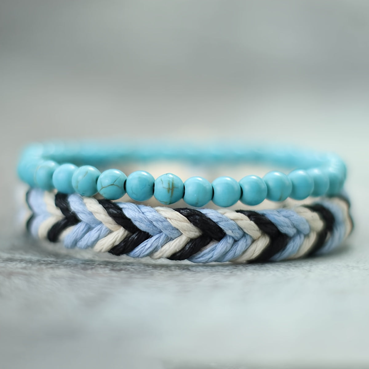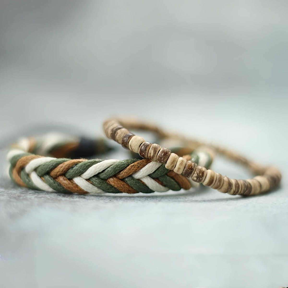 This 2-piece set features bohemian style bracelets made of natural wood beads woven together with synthetic stones. Crafted from non-plated nylon material, perfect for bohemian couples.